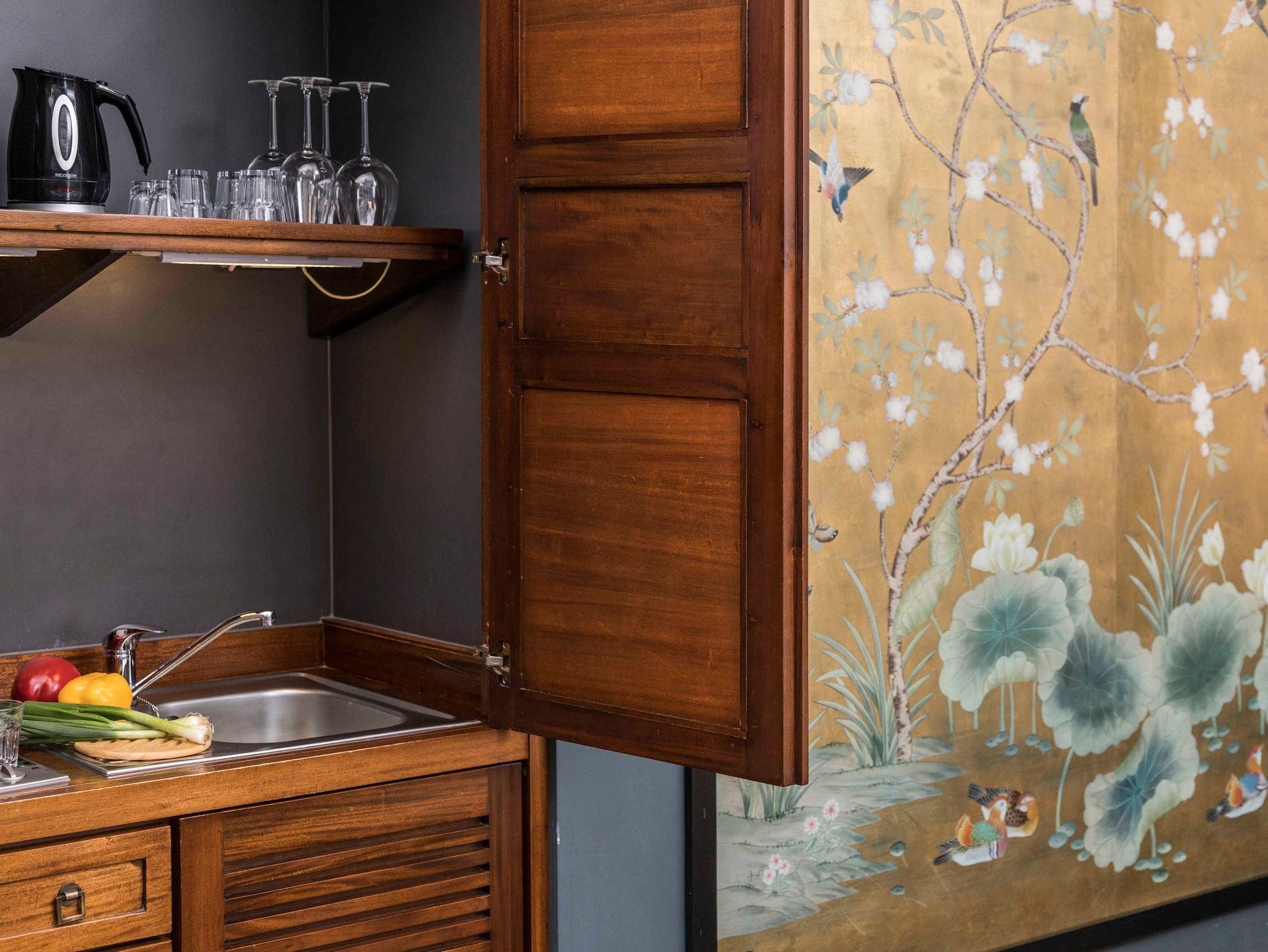 Ein Wohn-Schlafraum, Pantryküche, möblierte überdachte Terrasse und extra Badesteg, Sat-TV, Musikanlage, Bad mit Dusche und WC. Ausstattung der Küche: 2-Zonen-Kochfeld, Kombi-Mikrowelle, Nespresso-Kaffeeemaschine, Wasserkocher, Toaster, Geschirr, Besteck, Pfanne und Töpfe.