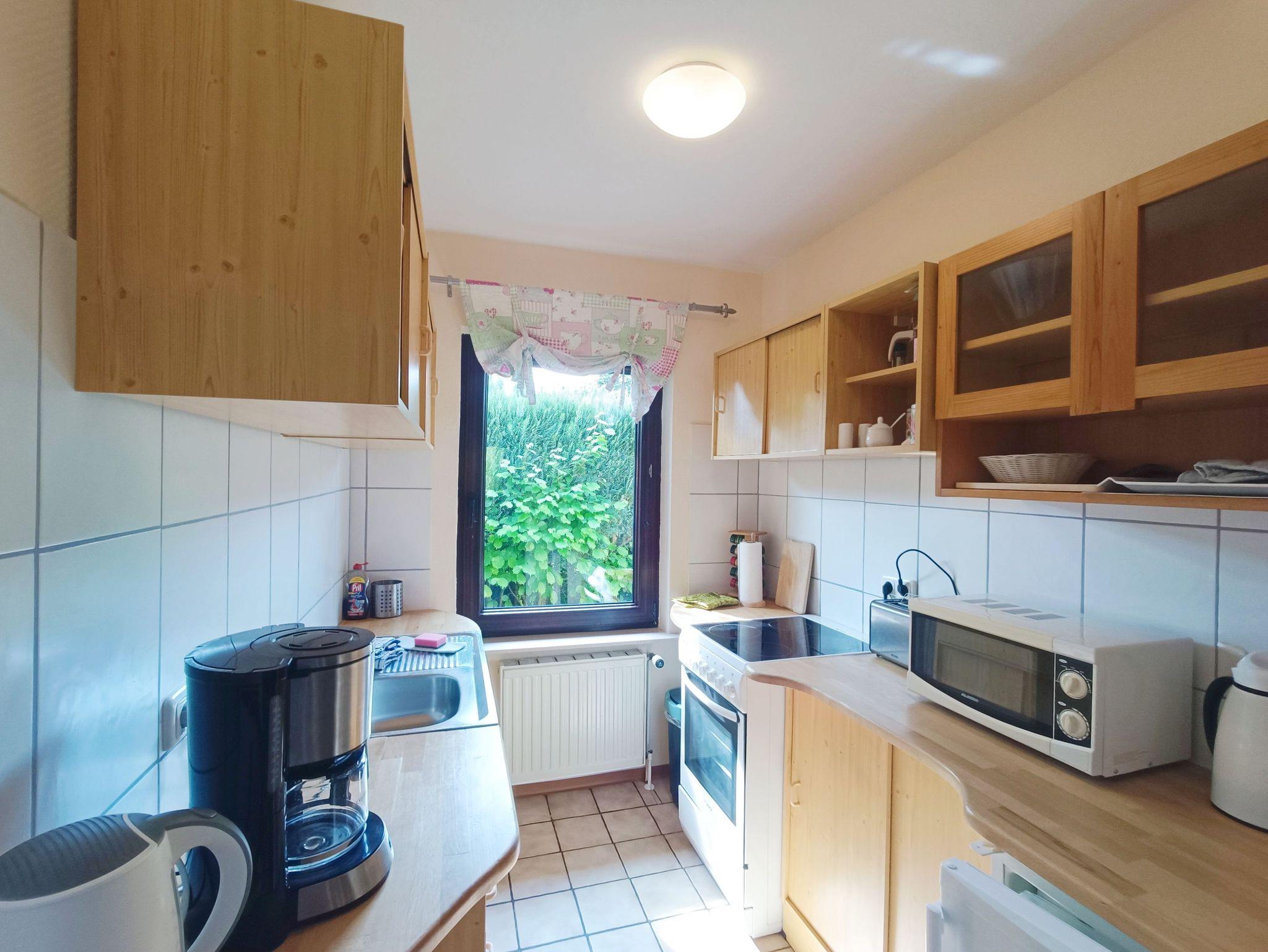 Die separate Küche ist mit Cerankochfeld-Herd, Backofen, Mikrowelle, Kühlschrank mit Gefrierfach, Kaffeemaschine, Toaster und Wasserkocher ausgestattet.