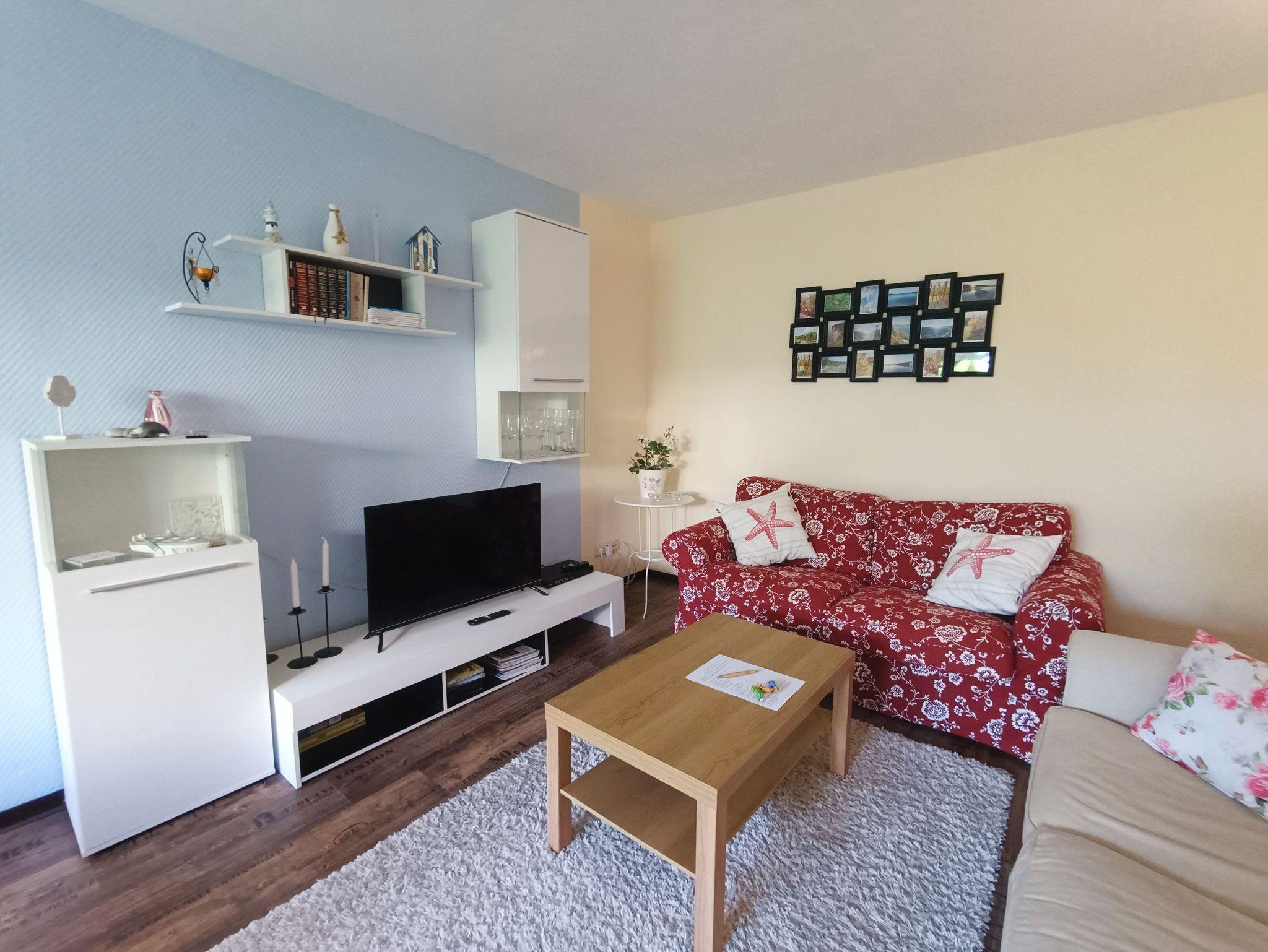 Zum Appartement Rosenblüte gehören eine Terrasse mit Sitzmöbeln, Grill und ein PKW-Stellplatz. Im großzügigen Wohnzimmer im Erdgeschoss befinden sich eine bequeme Sitzgruppe mit Tisch, eine Stereo-Anlage bzw. Buch- und Leseecke, Blu-Ray-DVD-Kombination, Essecke und einem modernen Flachbild-TV.