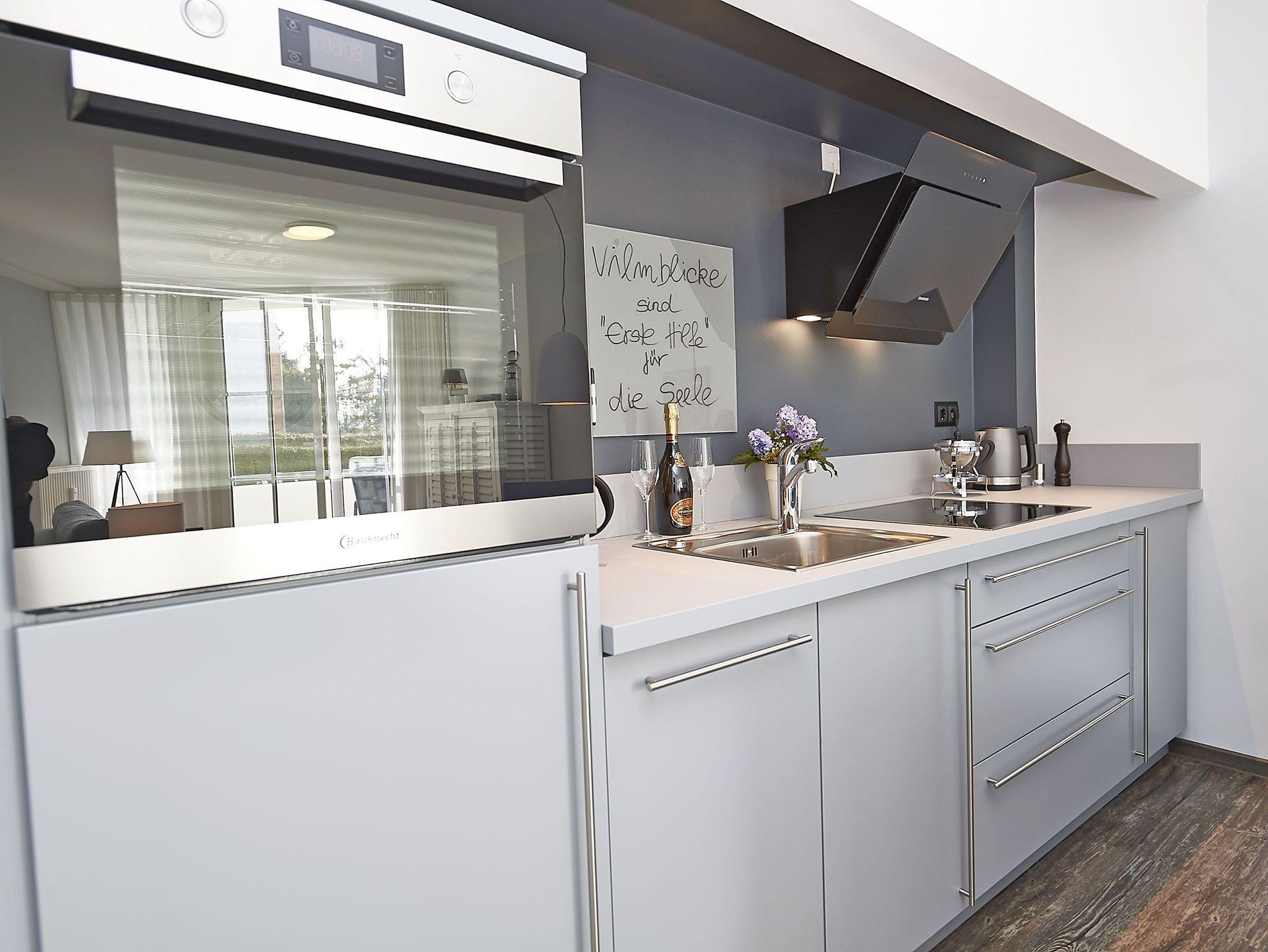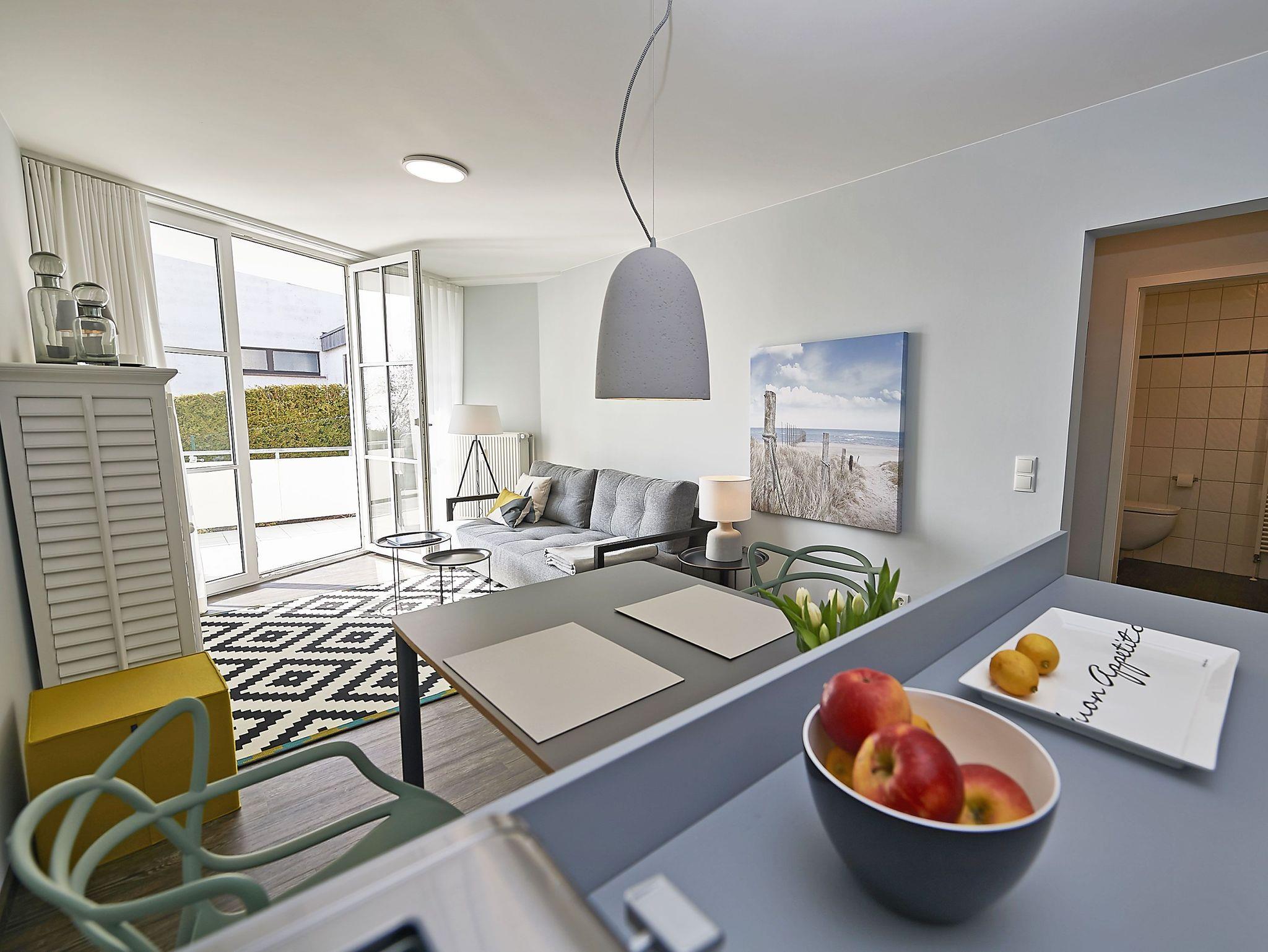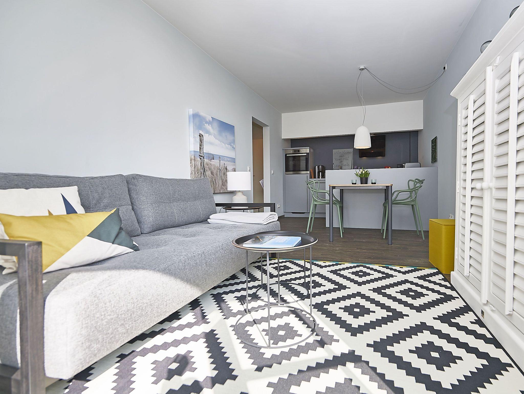 Der lichtdurchflutete Wohnraum ist mit einem TV, kostenfreiem W-LAN und einer bequemen Couch ausgestattet. Die offene Küche mit angrenzendem Essbereich bietet alles Notwendige, um sich hier wohl zu fühlen und selbst zu bekochen, wenn man nicht in einem der Lokale im Ort speist. Das Schlafzimmer hat ein großes Doppelbett und lichtundurchlässige Vorhänge. Das Duschbad ist geräumig und zeitgemäß ausgestattet.