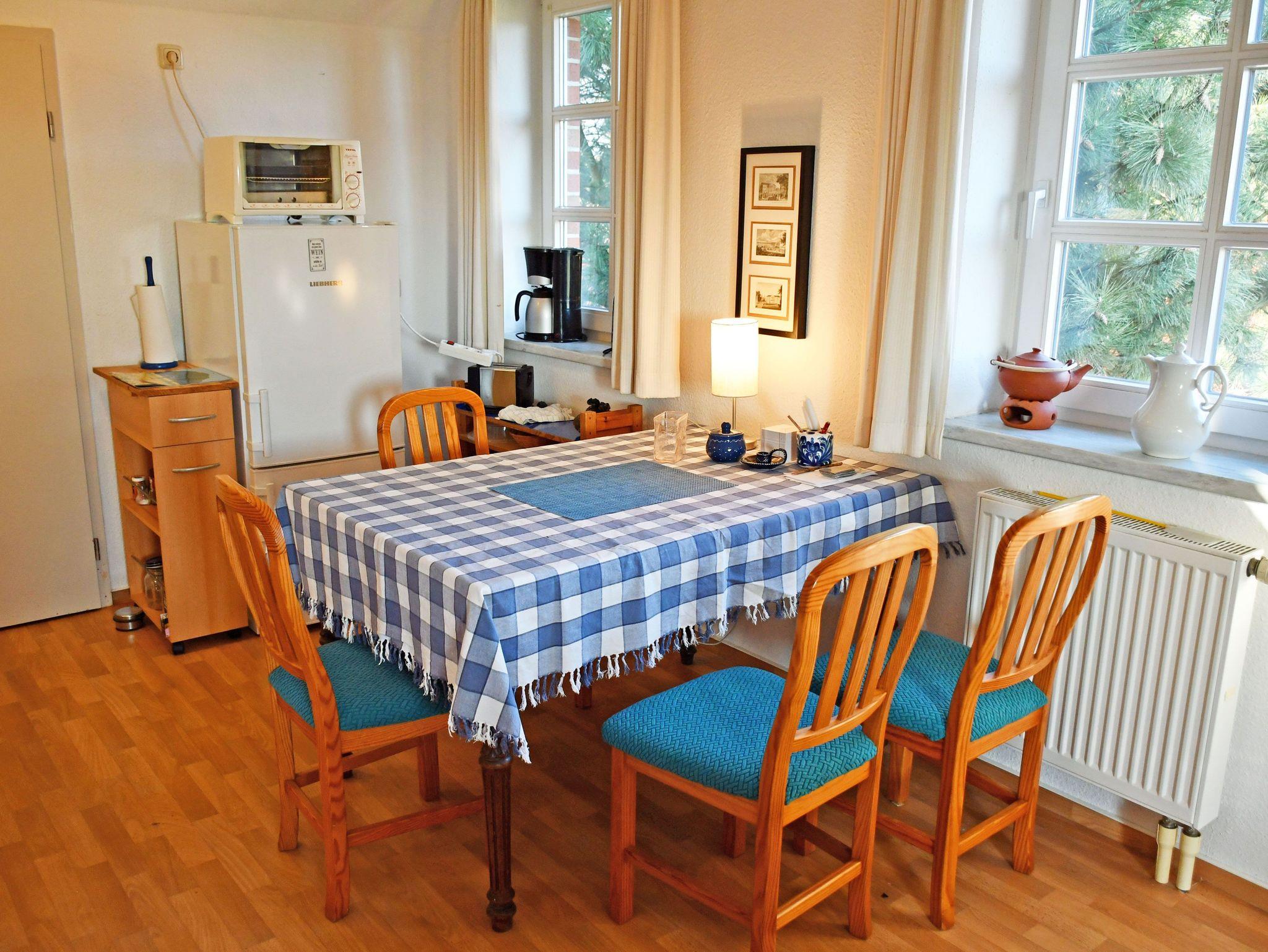 Im Wohnraum befinden sich eine bequeme Couch mit Tisch und ein TV-Gerät. Hier steht auch ein Esstisch mit Sitzgelegenheiten. Aus dem Fenster genießen Sie einen wunderschönen Ausblick zur Goor (Waldgebiet) und die Vilmnitzer Weiden.