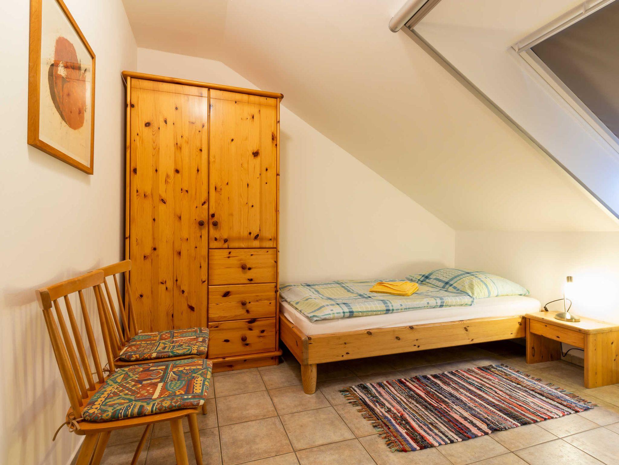 Im ebenfalls hellen, freundlichen Obergeschoss gibt es zwei Schlafräume. Diese sind jeweils mit zwei Betten (vier Betten pro Ferienwohnung) ausgestattet. Ein Schlafraum ist ein Durchgangszimmer (zur Treppe offen - siehe Grundriss). Beide Räume verfügen über große Dachfenster, die abgedunkelt werden können.