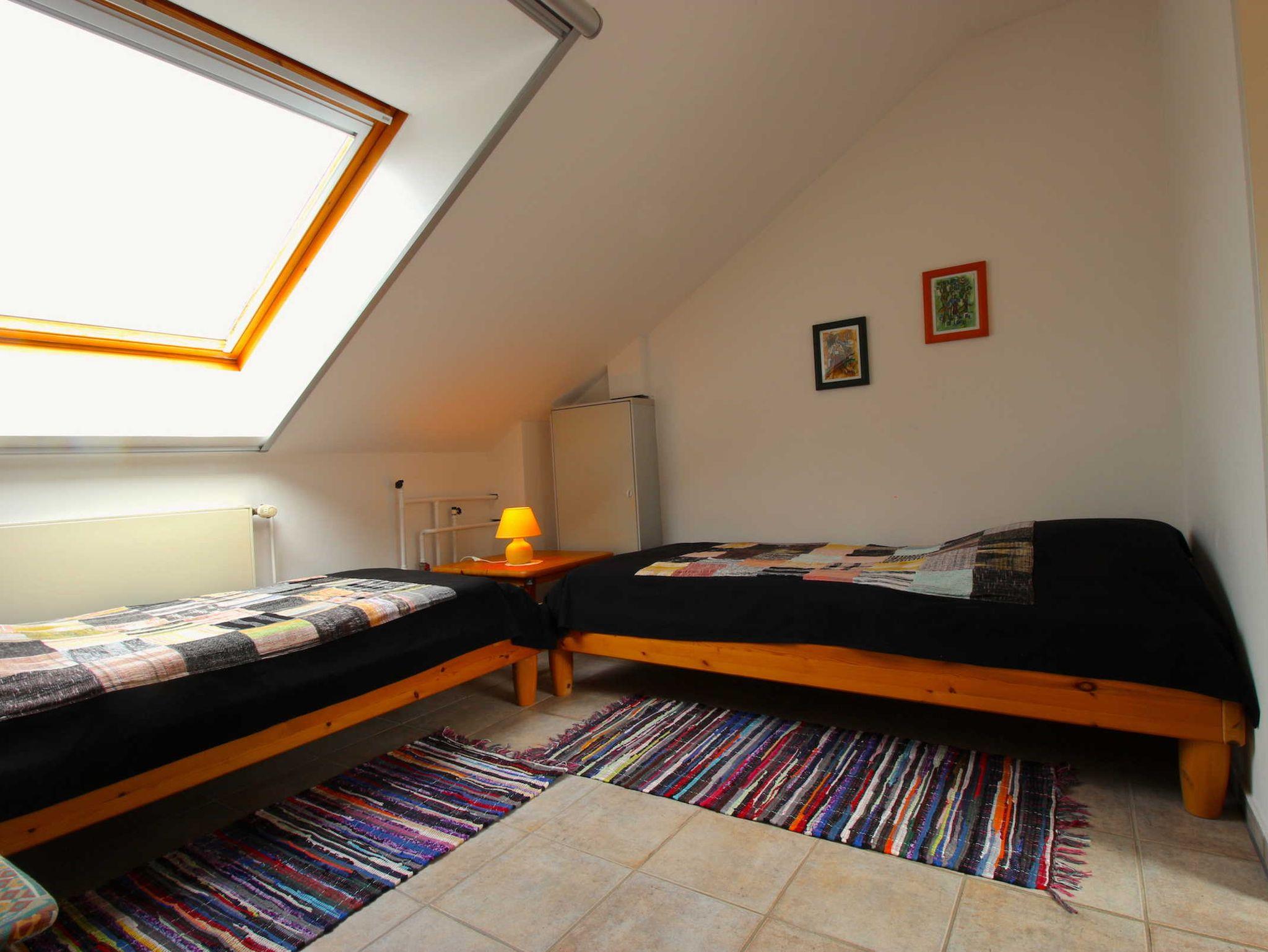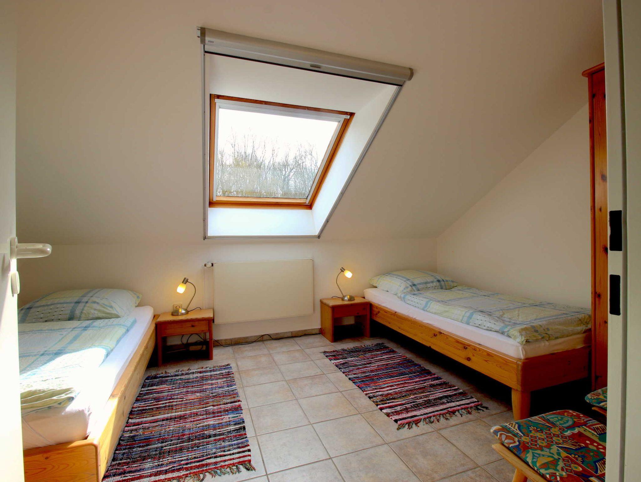 Im ebenfalls hellen, freundlichen Obergeschoss gibt es zwei Schlafräume. Diese sind jeweils mit zwei Betten (vier Betten pro Ferienwohnung) ausgestattet. Ein Schlafraum ist ein Durchgangszimmer (zur Treppe offen - siehe Grundriss). Beide Räume verfügen über große Dachfenster, die abgedunkelt werden können.