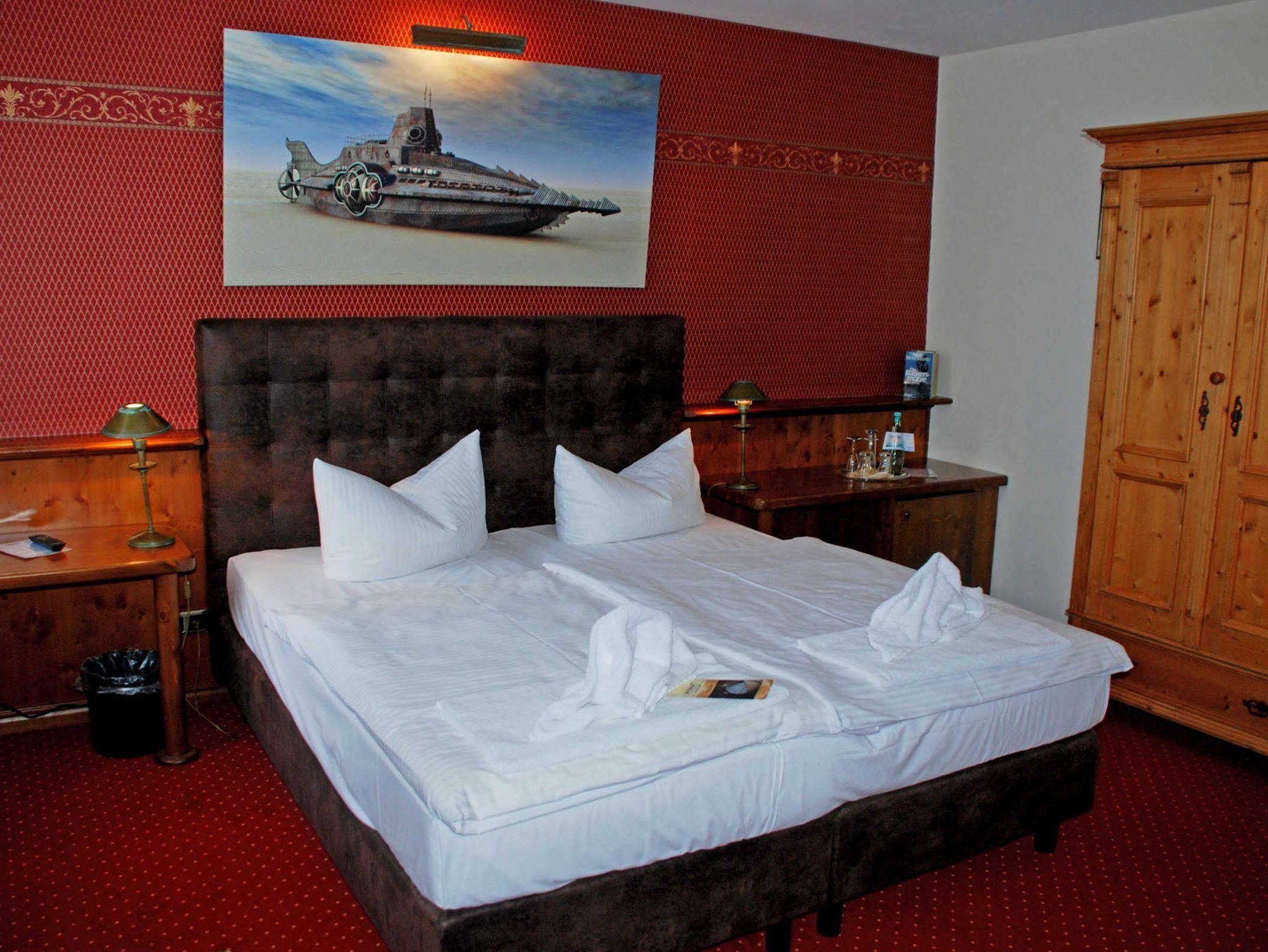 Alle Zimmer sind maritim, passend zum Thema U- Boot, gestaltet. Während die Doppel- und Einzelzimmer im Haupthaus liegen, befinden sich die Kapitänssuiten in 2 separaten Gästehäusern und sind über die einzelnen Terrassentüren separat von außen zu begehen. Die Wohnzimmer im Paterre sind unter anderem mit TV, Telefon und Minibar ausgestattet. Ebenfalls im Paterre befindet sich das Bad mit Dusche und WC. Über eine Holztreppe geht es in den Schlafbereich. Jede Kapitänssuite verfügt über eine eigene Terrasse. Weitere Angaben finden Sie bei der Detailbeschreibung der Hotelzimmer.