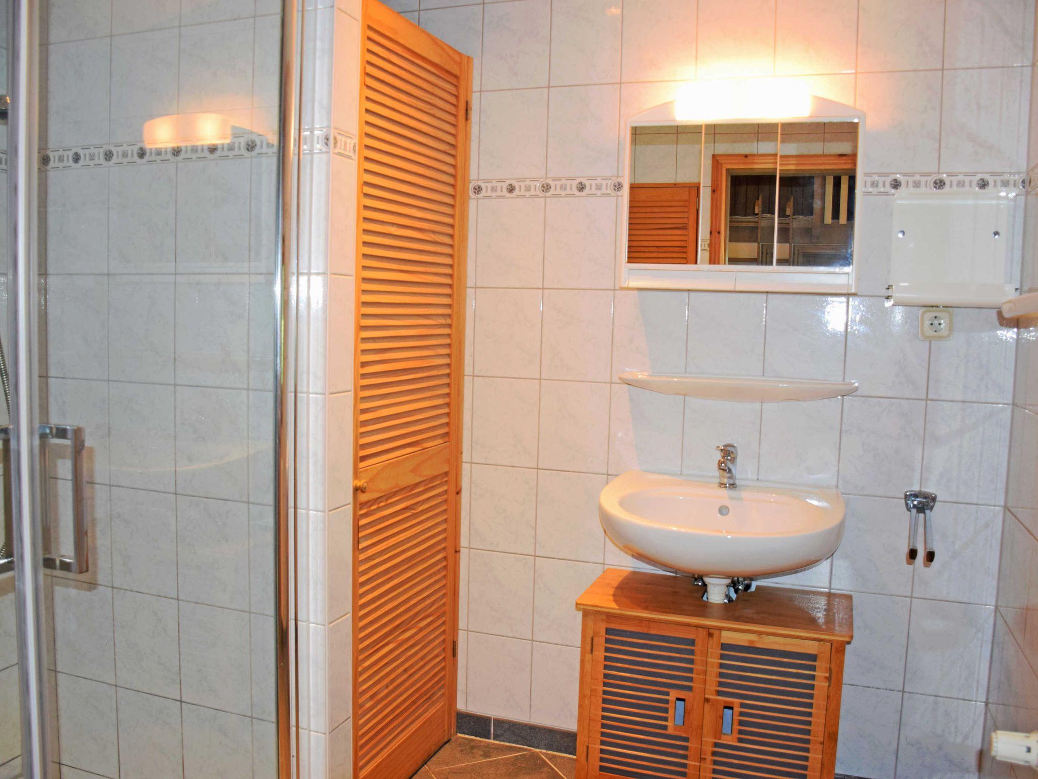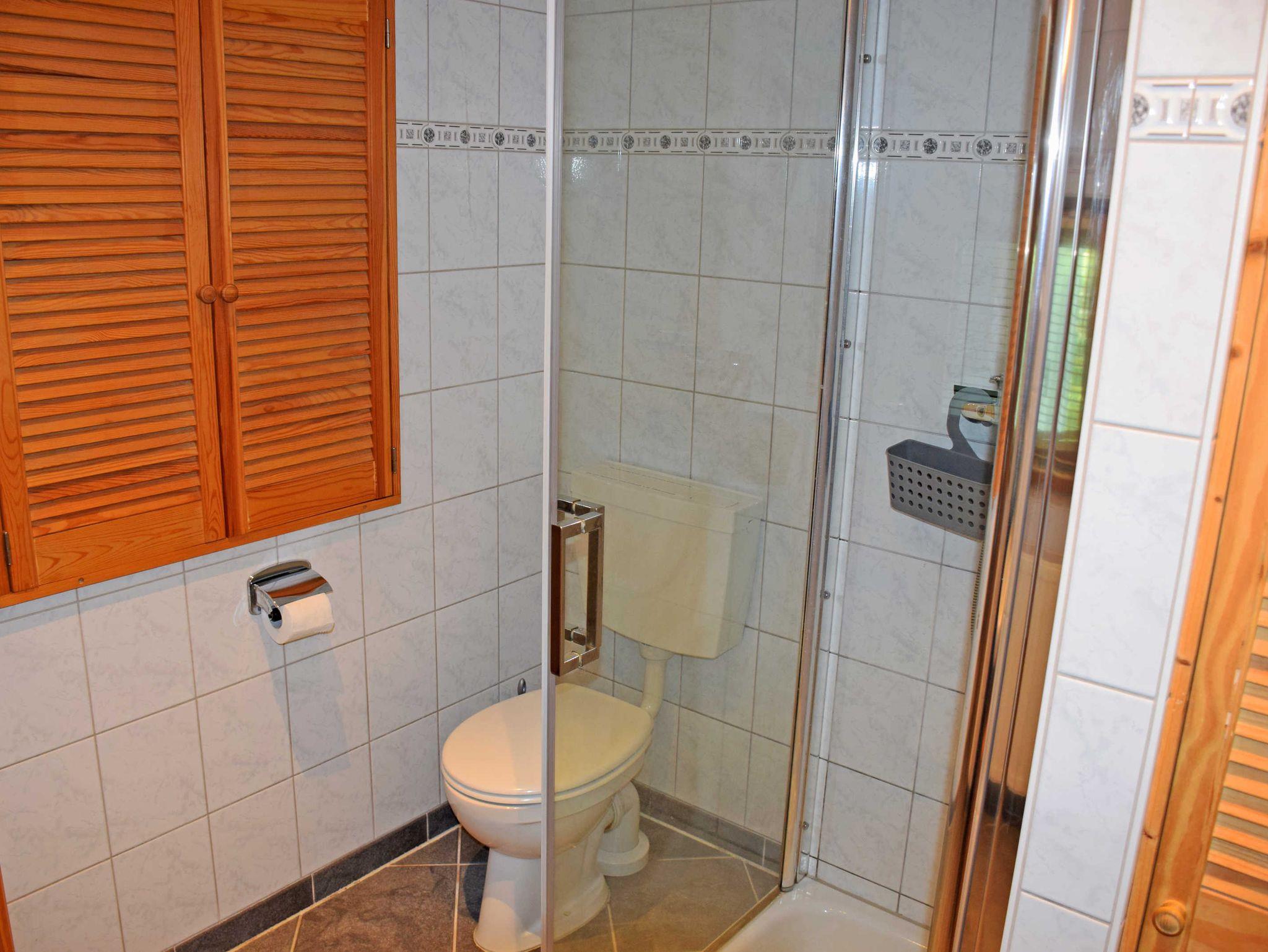 Das Bad verfügt über Dusche, Waschbecken und WC.