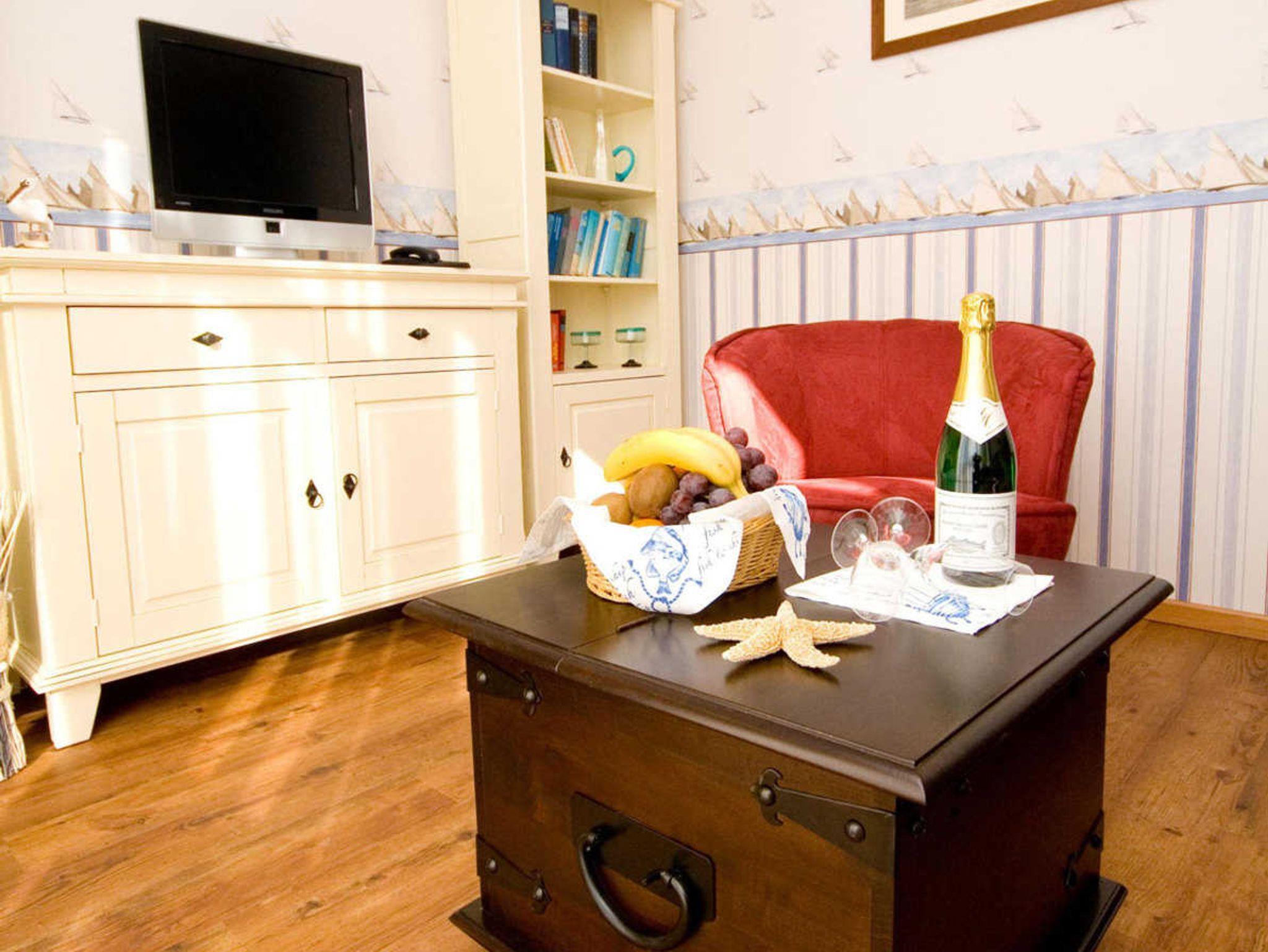 Zur weiteren Ausstattung der Kapitänssuiten gehören ein modernes Flachbild-TV-Gerät, Radio, Minibar, Internet-LAN und Telefon sowie ein Schreibtisch mit Sessel. Ein kleines Reisebett für Kinder bis 3 Jahre kann gern gegen Aufpreis von 5 Euro je Übernachtung zu gebucht werden.