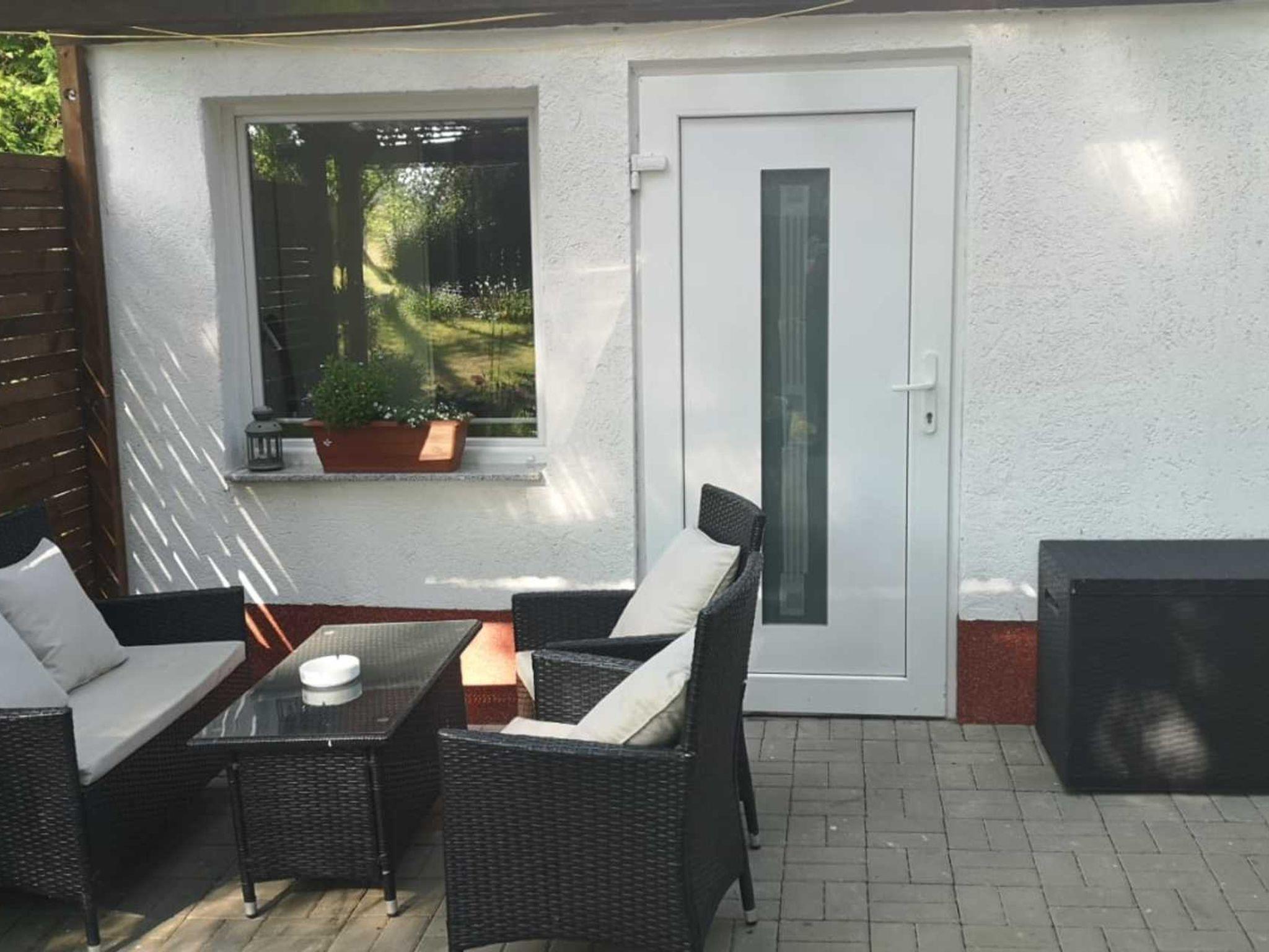 Der Bungalow mit der Terrasse befinden sich auf dem Grundstück des Vermieters.