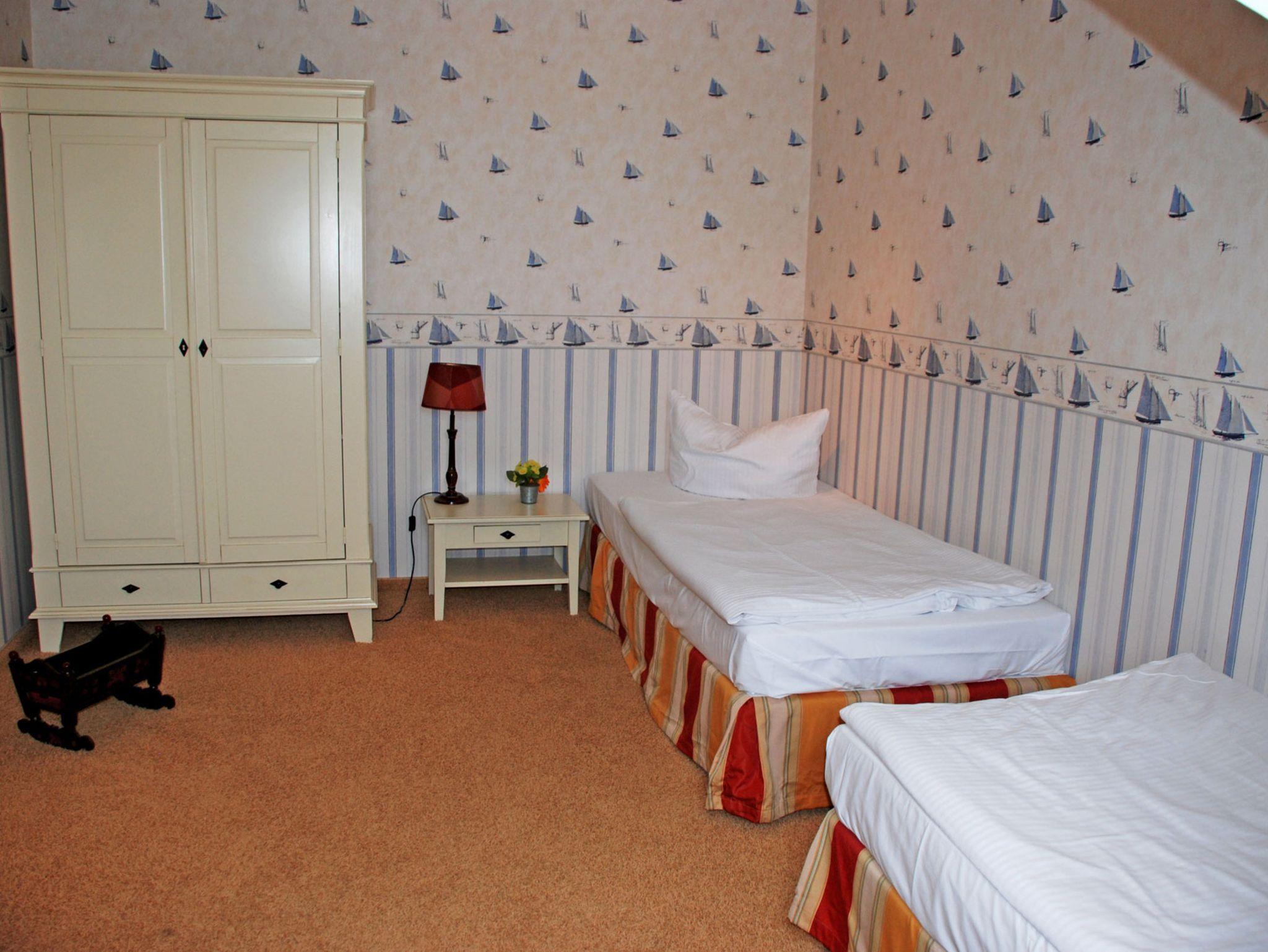 Über eine Holztreppe gelangt man in den oberen ersten Schlafraum mit einem bequemen Doppelbett mit Nachtischen, Leselampen und Kleiderschrank. Daneben liegt das zweite Schlafzimmer mit zwei Einzelbetten mit Nachttischen und Leselampen sowie Kleiderschrank.
