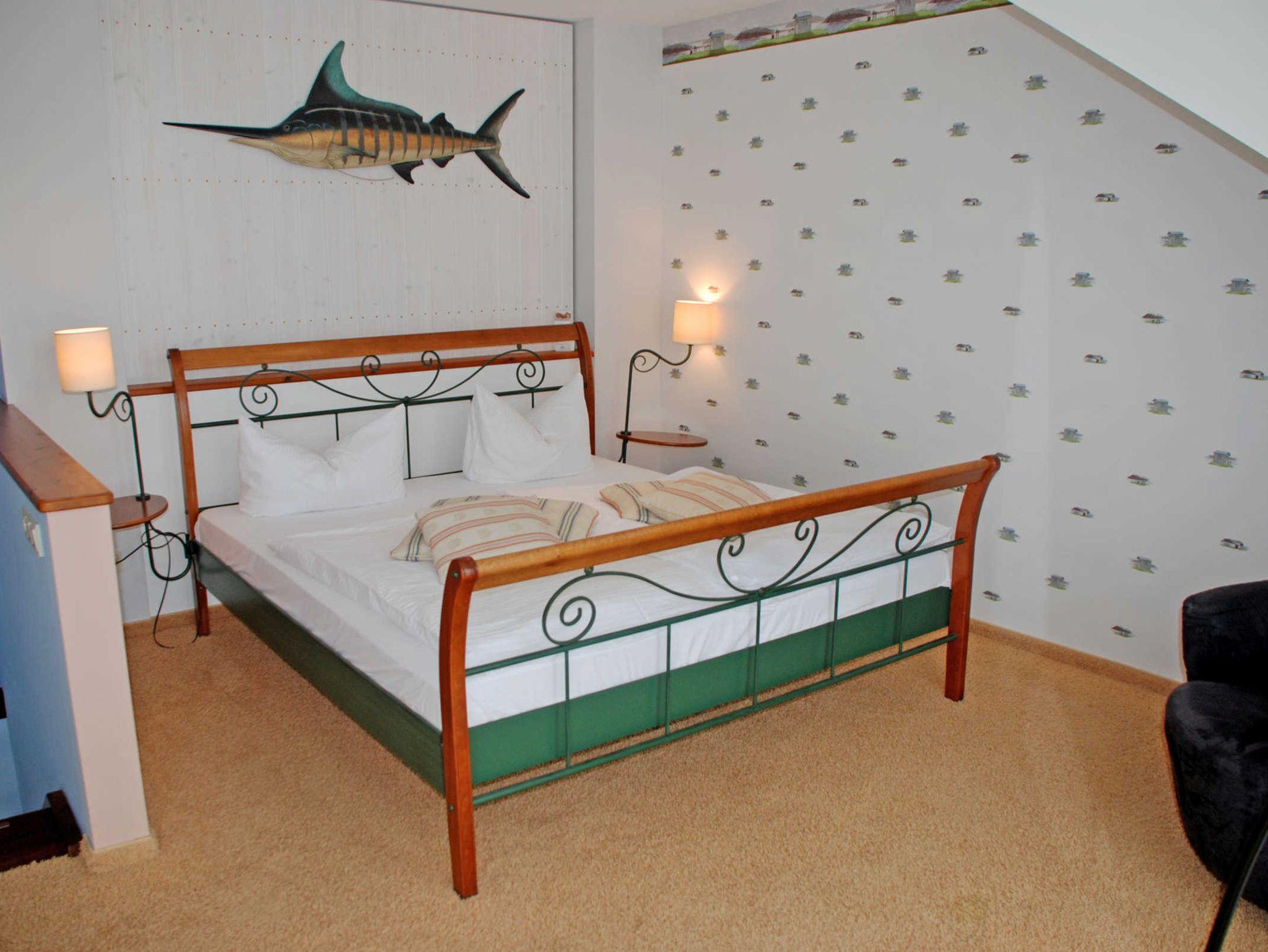 Über eine Holztreppe gelangt man in den oberen ersten Schlafraum mit einem bequemen Doppelbett mit Nachtischen, Leselampen und Kleiderschrank. Daneben liegt das zweite Schlafzimmer mit zwei Einzelbetten mit Nachttischen und Leselampen sowie Kleiderschrank.
