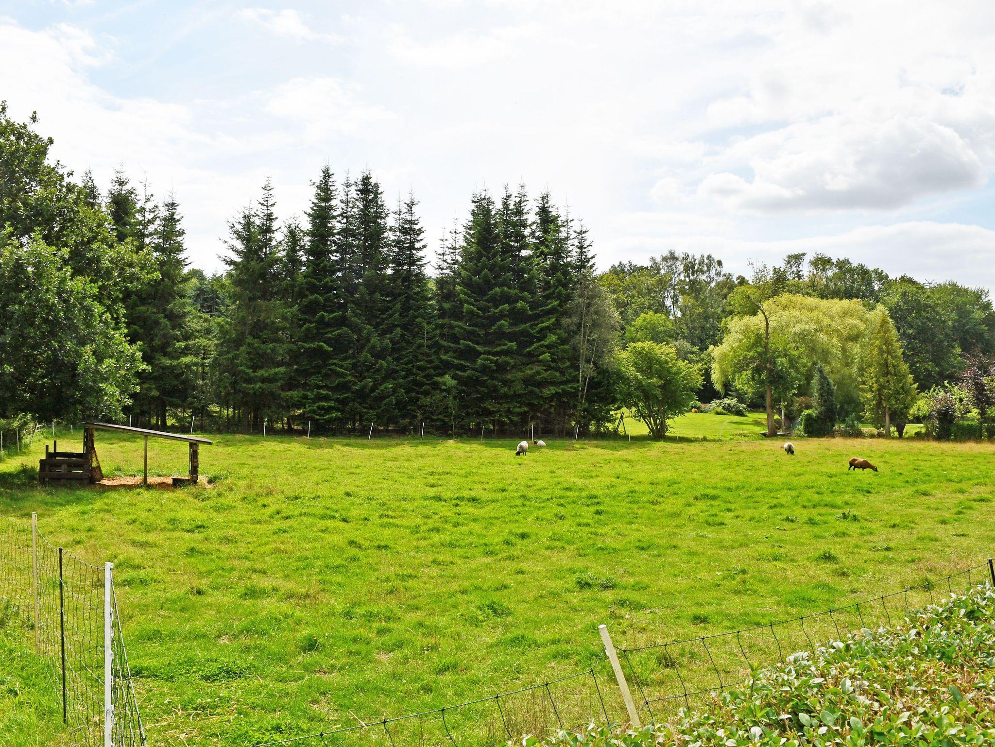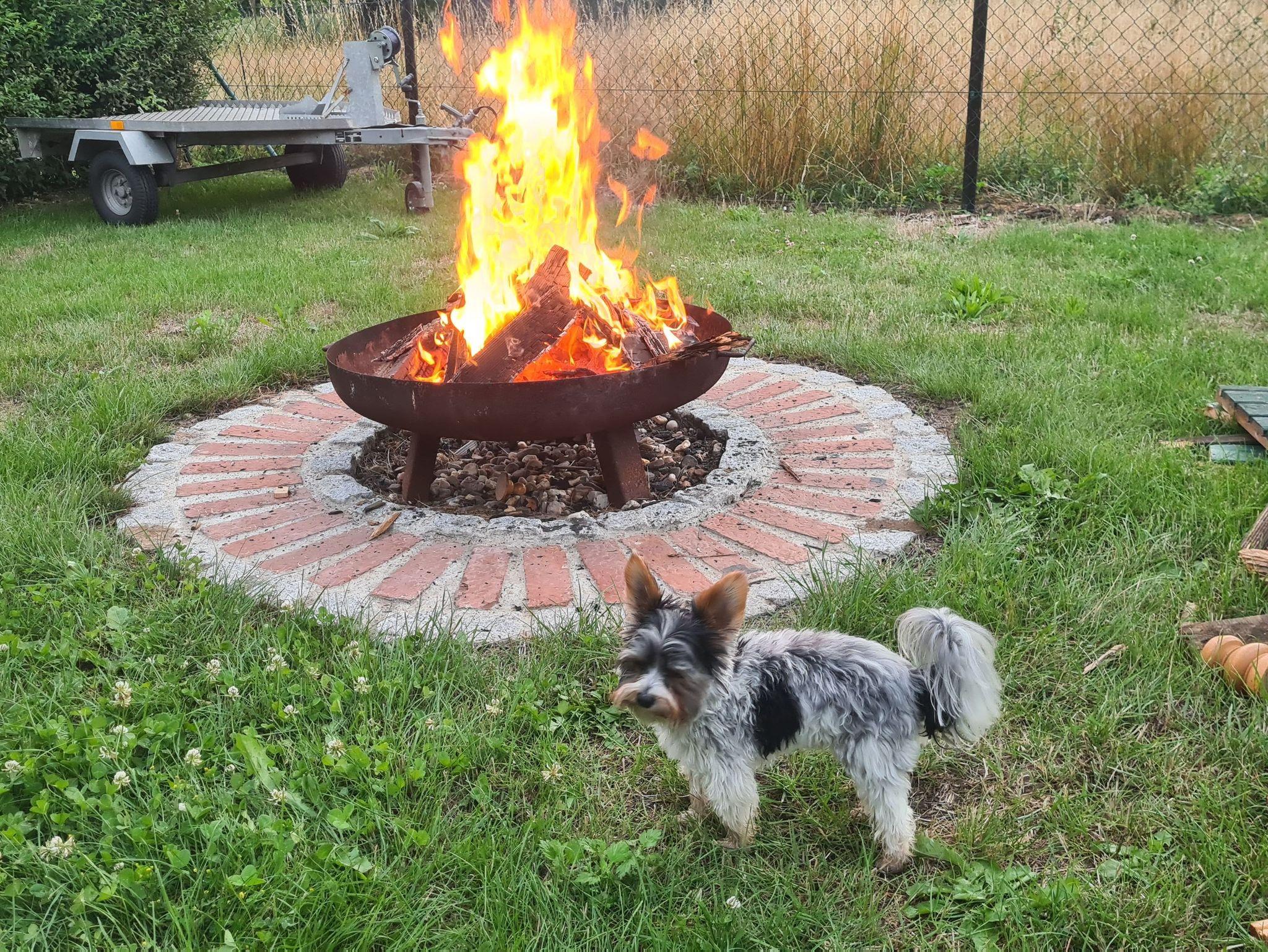 Zum Ferienhaus gehört eine Wiese mit Gartenmöbeln und Grillmöglichkeit/Feuerschale.