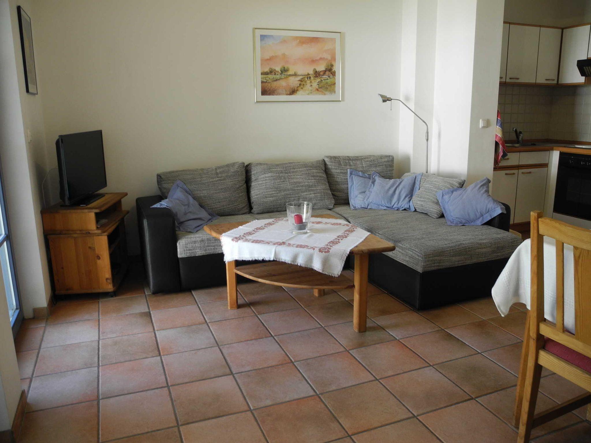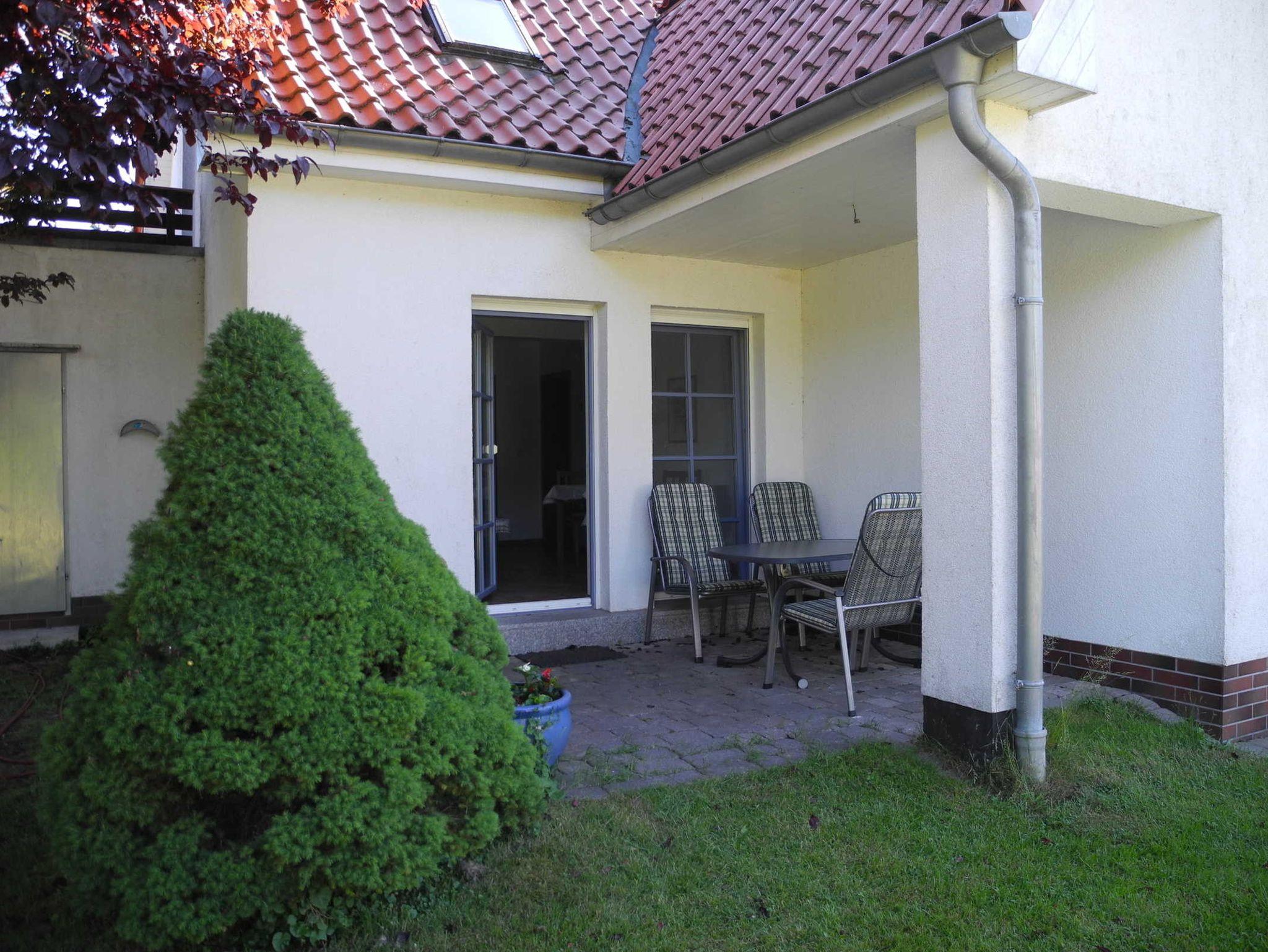 Diese Wohnung befindet sich im Erdgeschoss und verfügt über einen Wohnraum mit integrierter Einbauküche, Essplatz und einer Couchecke, ein Elternschlafzimmer mit Doppelbett, ein Kinderzimmer mit einem stabilen Etagenbett und einer ausziehbaren Liege, eine Dusche/WC und eine halbüberdachte Terrasse, die direkt in den Garten führt.