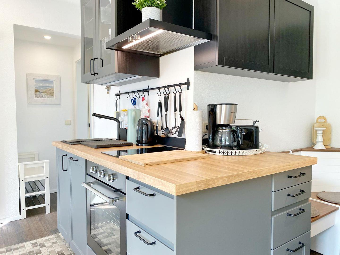 Die offene Küche verfügt neben Backofen, Ceranfeld, Geschirrspüler und Kühlschrank mit Gefriermöglichkeit natürlich auch über eine Kaffeemaschine, Toaster und Wasserkocher.