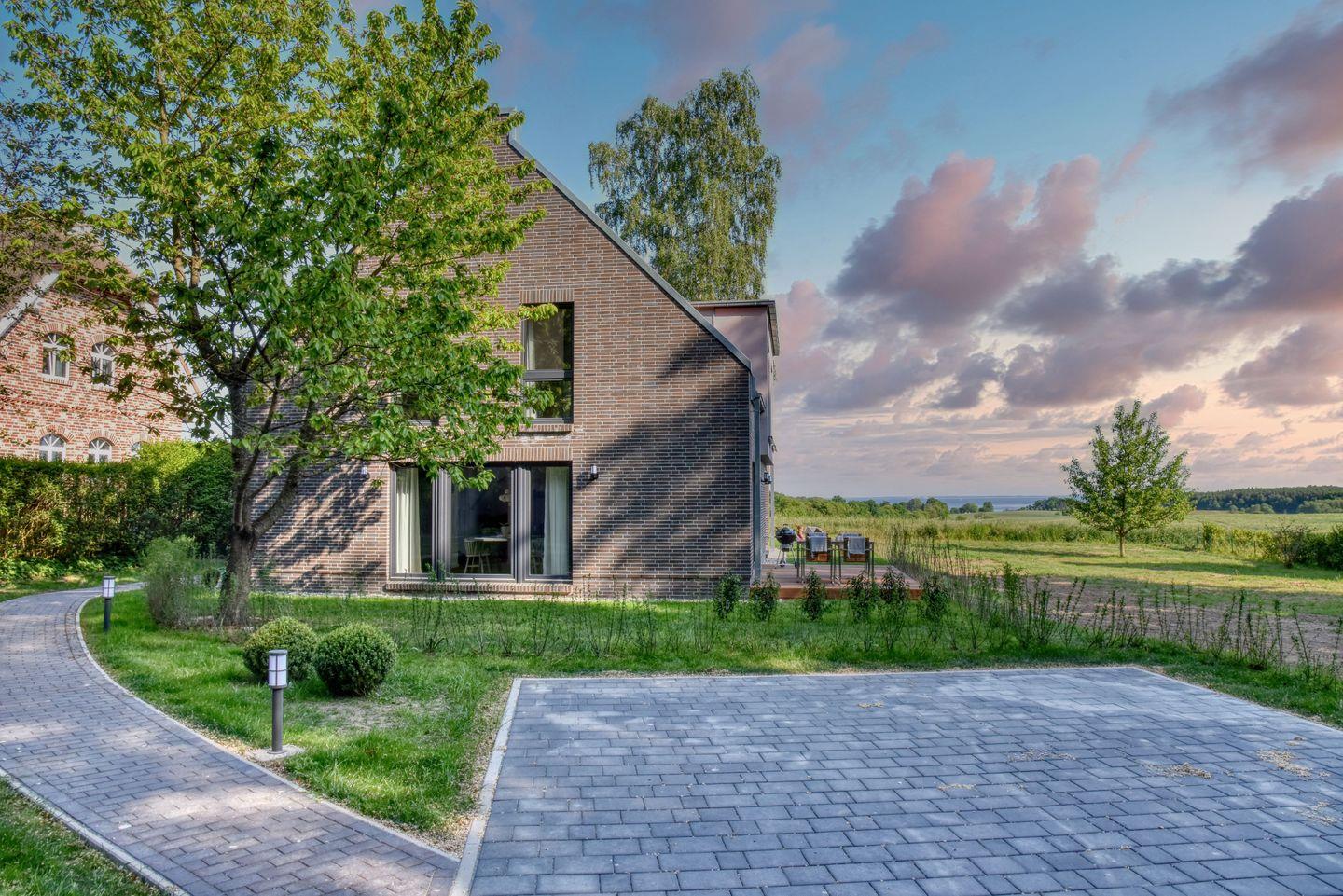 Klare Linien, eine typische Fassade, große Fensterflächen und eine stimmige Inneneinrichtung lassen keine Wünsche offen. In jeder Haushälfte stehen auf zwei Geschossen eine Wohnfläche von ca.100 qm zur Verfügung. Im Erdgeschoss gibt es ein Wohn-/Essbereich mit offener Küche, bestehend aus Küchenzeile und Küchenblock, sowie eine Sauna und ein Kamin. Großzügige Fensterfronten, die auf der Rückseite auf eine große zur Südseite hinausliegende Terrasse führen, bieten einen herrlichen Blick auf das Wasser. Im Erdgeschoss befinden sich ferner jeweils ein Gäste-WC und eine offene Garderobe. Im Obergeschoss, welches man über eine Eichenholztreppe erreicht, liegen jeweils zwei Schlafzimmer, ein Bad mit Badewanne und Dusche sowie eine Galerie mit Wasserblick. Die gesamte Wohnung ist mit einer Fußbodenheizung ausgestattet. Auf dem Hof befindet sich ein abschließbares Gartenhaus mit einer Lademöglichkeit für E-Bikes.