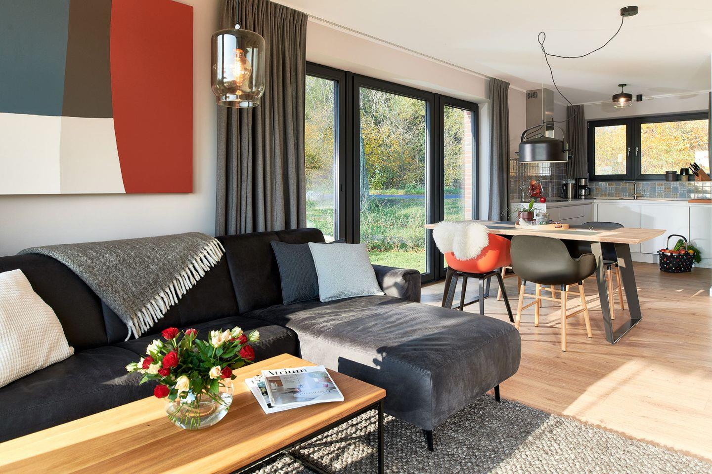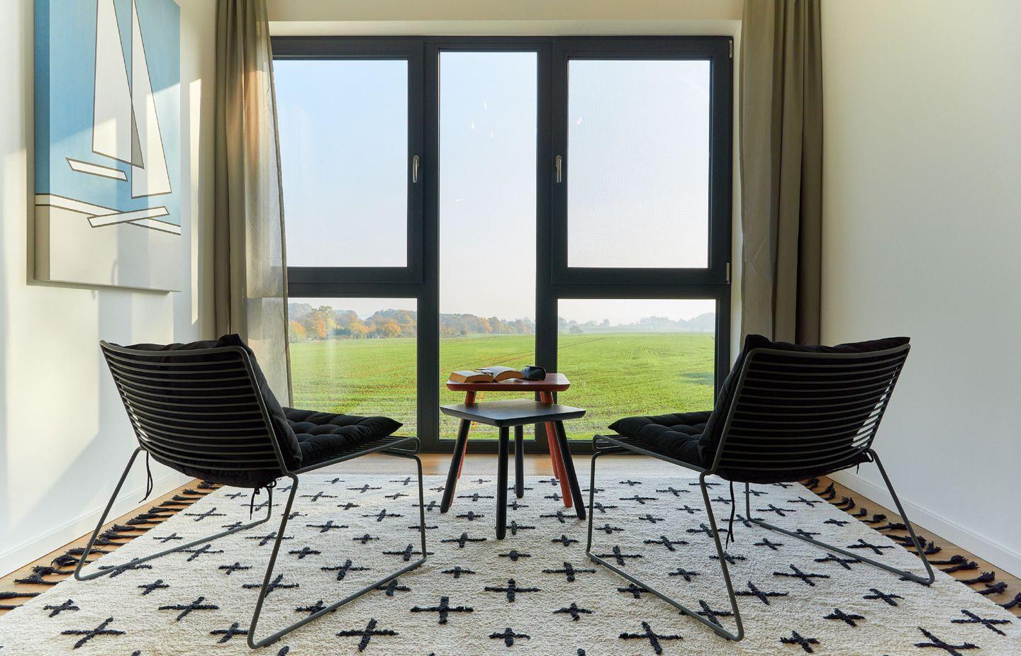 Klare Linien, eine typische Fassade, große Fensterflächen und eine stimmige Inneneinrichtung lassen keine Wünsche offen. In jeder Haushälfte stehen auf zwei Geschossen eine Wohnfläche von ca.100 qm zur Verfügung. Im Erdgeschoss gibt es ein Wohn-/Essbereich mit offener Küche, bestehend aus Küchenzeile und Küchenblock, sowie eine Sauna und ein Kamin. Großzügige Fensterfronten, die auf der Rückseite auf eine große zur Südseite hinausliegende Terrasse führen, bieten einen herrlichen Blick auf das Wasser. Im Erdgeschoss befinden sich ferner jeweils ein Gäste-WC und eine offene Garderobe. Im Obergeschoss, welches man über eine Eichenholztreppe erreicht, liegen jeweils zwei Schlafzimmer, ein Bad mit Badewanne und Dusche sowie eine Galerie mit Wasserblick. Die gesamte Wohnung ist mit einer Fußbodenheizung ausgestattet.