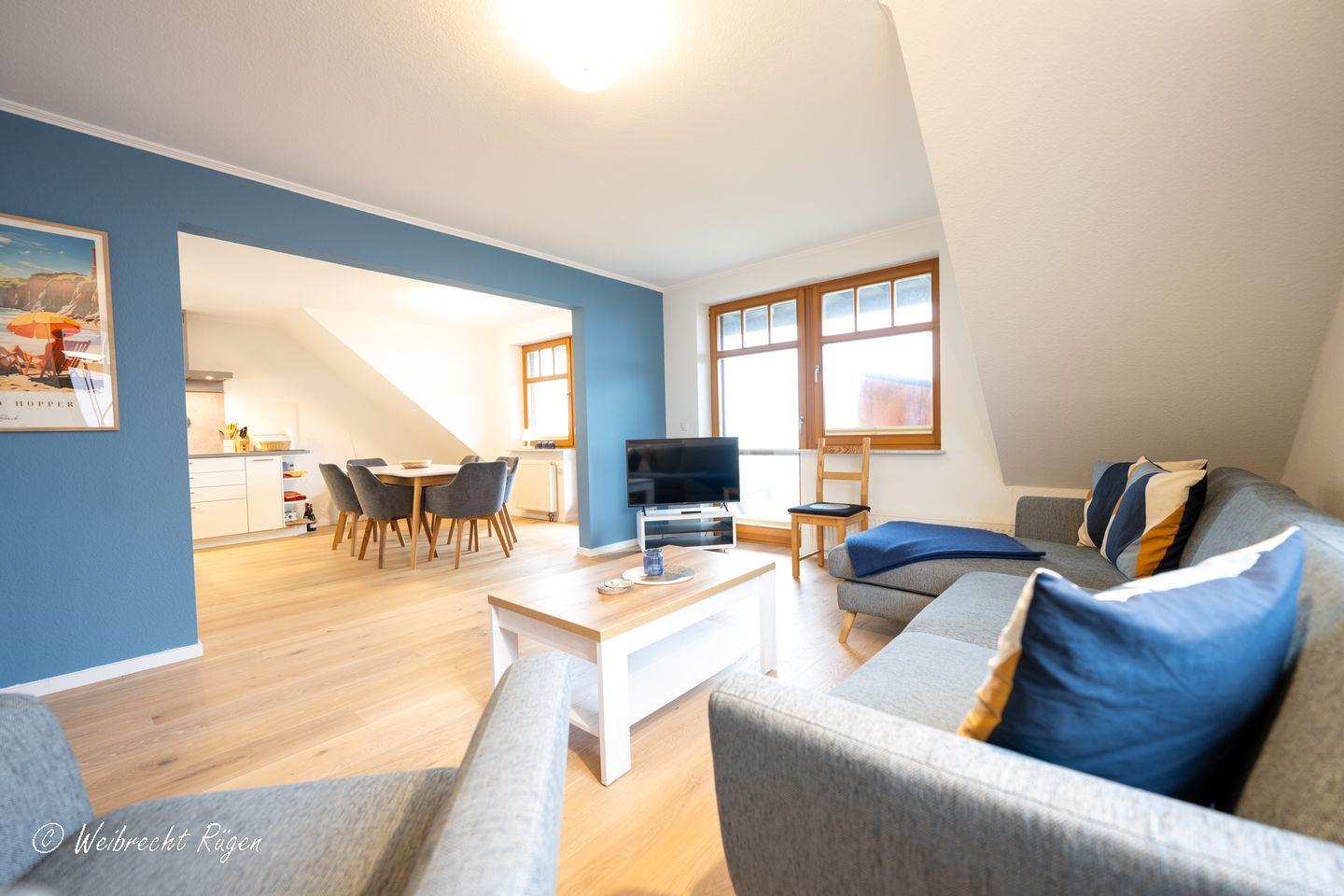 Von hier aus gelangen Sie auf den großen Balkon – das Herzstück der Wohnung. Mit gemütlicher Sitzgruppe ausgestattet, lädt er zum langen Verweilen ein: Morgenkaffee mit sanft glitzernder Bucht, Nachmittage mit Möwenrufen und Abendstunden, in denen das Licht über der Insel Vilm langsam in Gold versinkt.