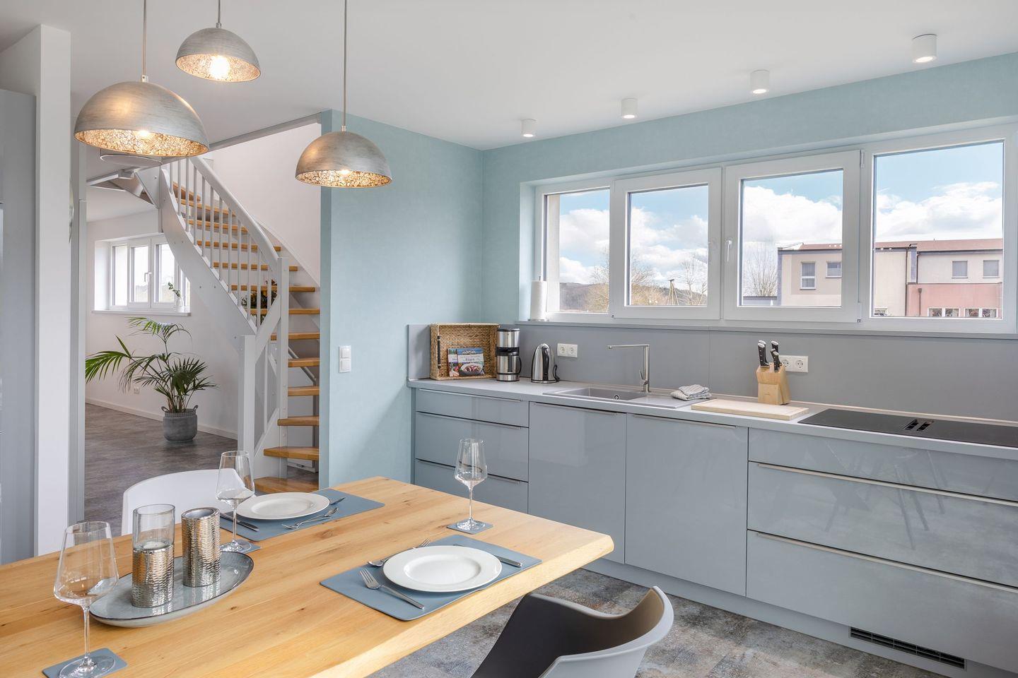 Die offene Küche im Erdgeschoss ist vollständig ausgestattet mit Cerankochfeld, Backofen, Kühlschrank, Geschirrspüler sowie umfangreichen Küchenutensilien – ideal für Selbstversorger. Eine Fußbodenheizung in Kombination mit der Zentralheizung sorgt ganzjährig für angenehme Temperaturen. Für längere Aufenthalte stehen Waschmaschine, Trockner, Bügeleisen und Wäscheständer zur Verfügung.