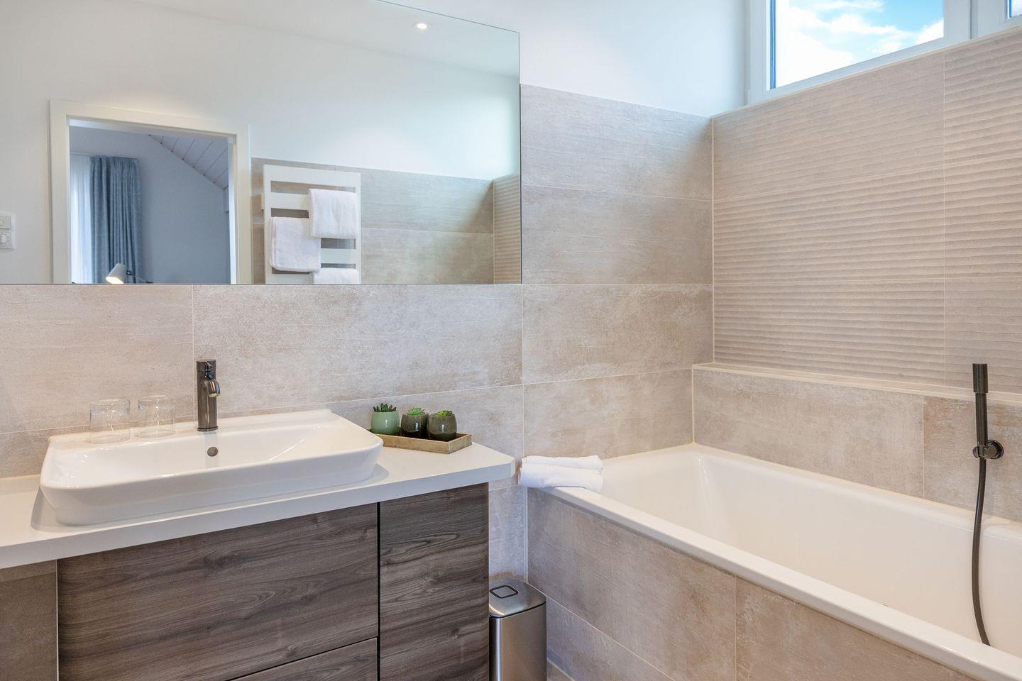 Zwei moderne Badezimmer sorgen für hohen Komfort: eines mit Badewanne, das andere mit bodengleicher Dusche. Handtücher, Bade- und Kosmetiktücher, Bettwäsche, Haartrockner und Kosmetikspiegel sind vorhanden.