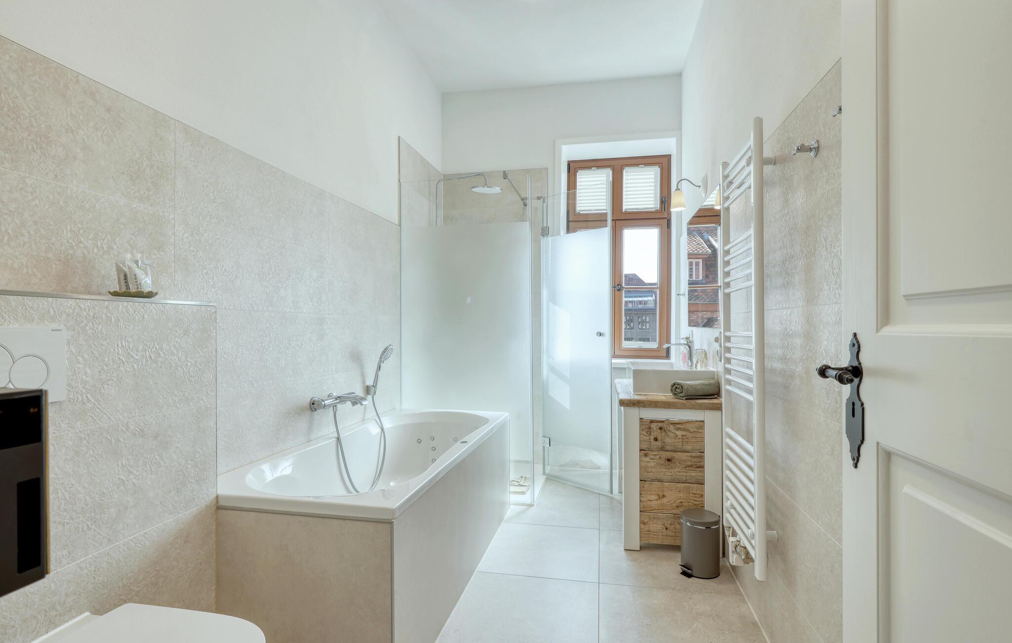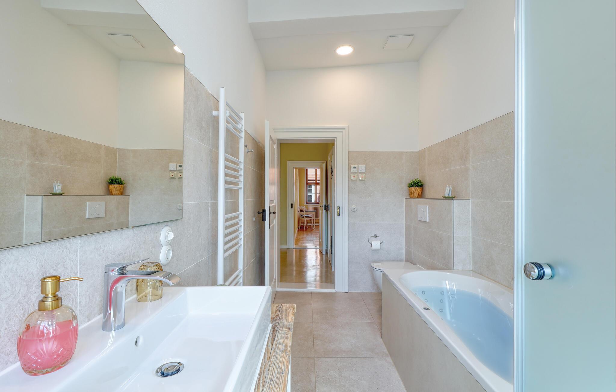 Velkommen til denne smukke lejlighed, der byder sine gæster velkommen med lyse, stilfuldt indrettede værelser i en historisk bygning. Føl jer godt tilpas her med dine kære og nyd komforten og den smagfulde atmosfære. Slap af i saunaen, som deles med andre gæster, og hold jer i form selv på ferien med fitnessudstyret. Nyd din første kaffe og et par solstråler på altanen eller terrassen, inden I begiver jer ud i dine aktiviteter.