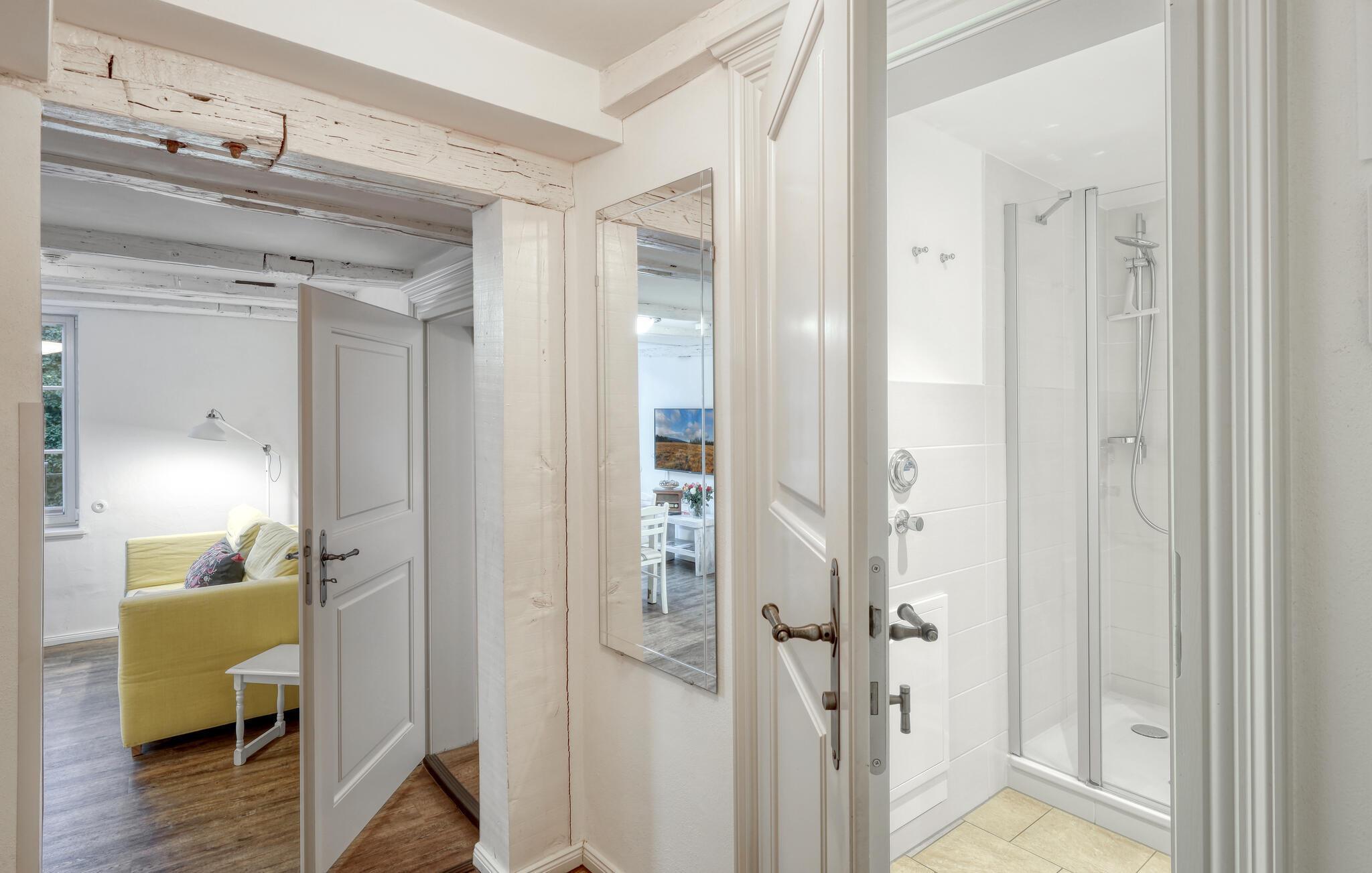 Glæd jer til en vellykket kombination af historisk flair og moderne komfort. Den hyggelige stue med sin indbydende sofa er det ideelle tilflugtssted, hvad enten det er til en afslappende aften med en god bog, en film eller blot for at slappe af efter en begivenhedsrig dag. Det åbne køkken giver jer mulighed for nemt at tilberede jeres livretter. I den lyse spisestue kan I nyde jeres måltider i en hyggelig atmosfære.