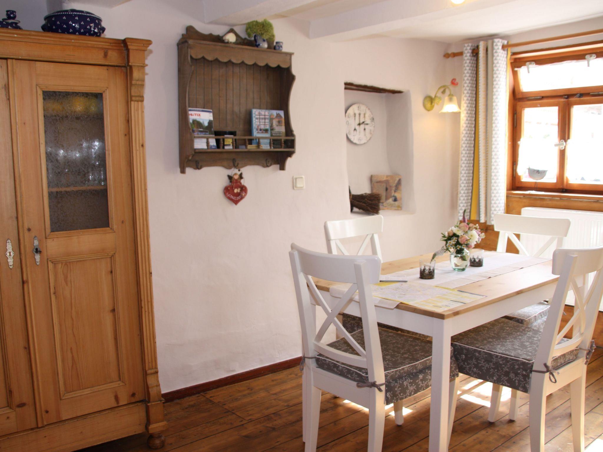 The house offers the authentic ambience of the old timber-framed houses on Münzenberg. Timber framework and sandstone walls, in harmony with the timeless furnishing in a rustic country style, make this house something quite special. Where else would you find a food trough in the living room and a ring for tieing donkeys or goats? Animals and people often lived under one roof in the past, because of a lack of space. The ground floor has a hallway with a light kitchen leading off it with a dining table, a cosy living room, and a little bathroom with a shower, as well as an additional guest WC. The upper floor has two romantic bedrooms with a double bed (1x 140x200 cm u. 1x 180x200cm). A free cot can be provided.
