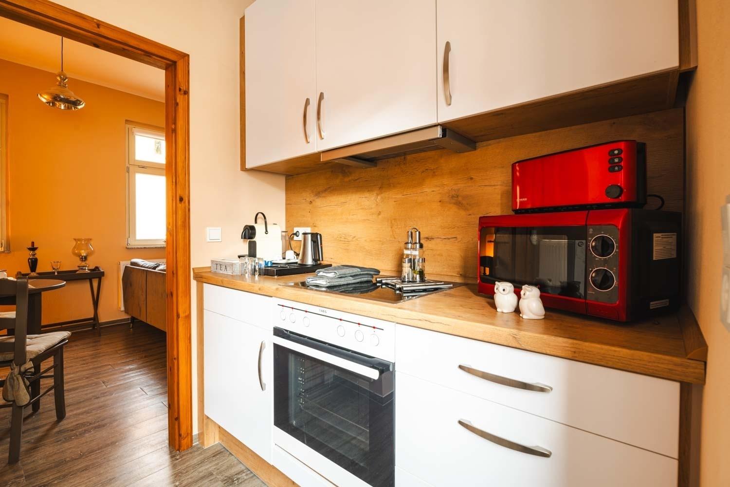 Die kleine Küche ist funktional und bietet alle notwendigen Annehmlichkeiten, um einfache Mahlzeiten zuzubereiten. Ein kleiner Essbereich lädt zu gemeinsamen Mahlzeiten oder einem entspannten Frühstück ein.