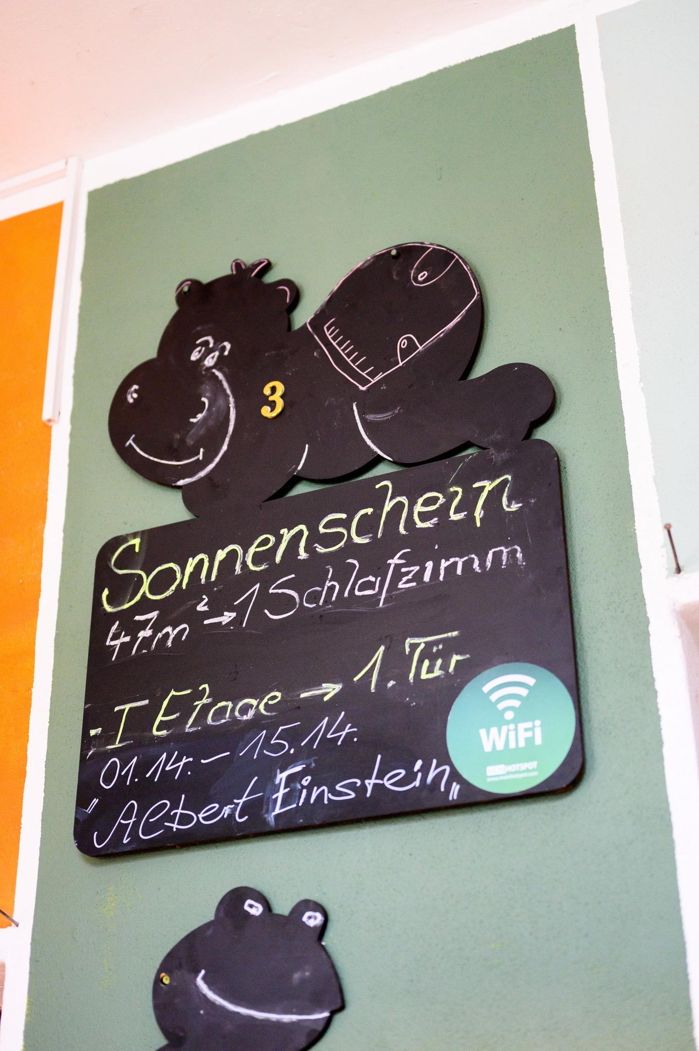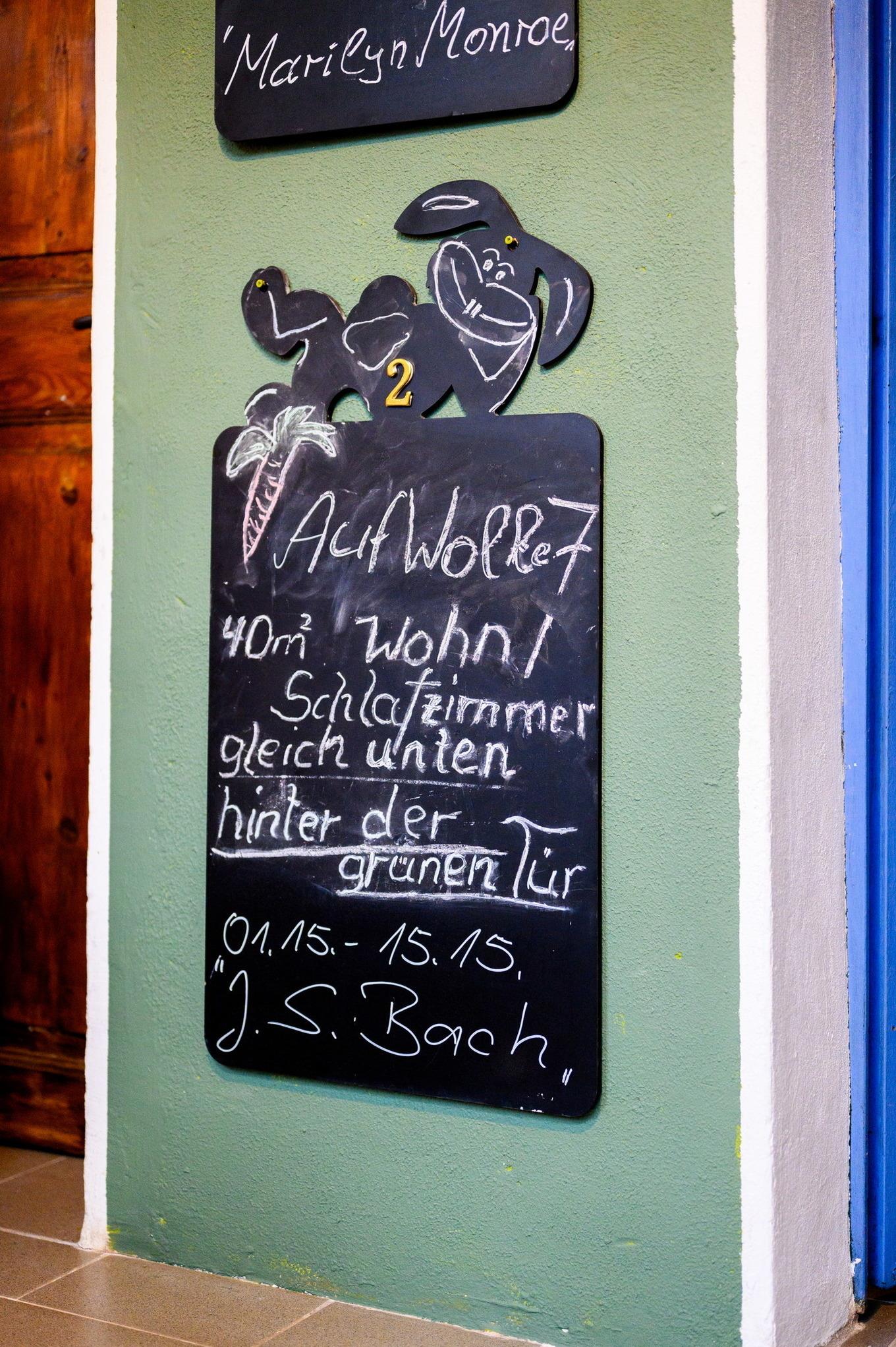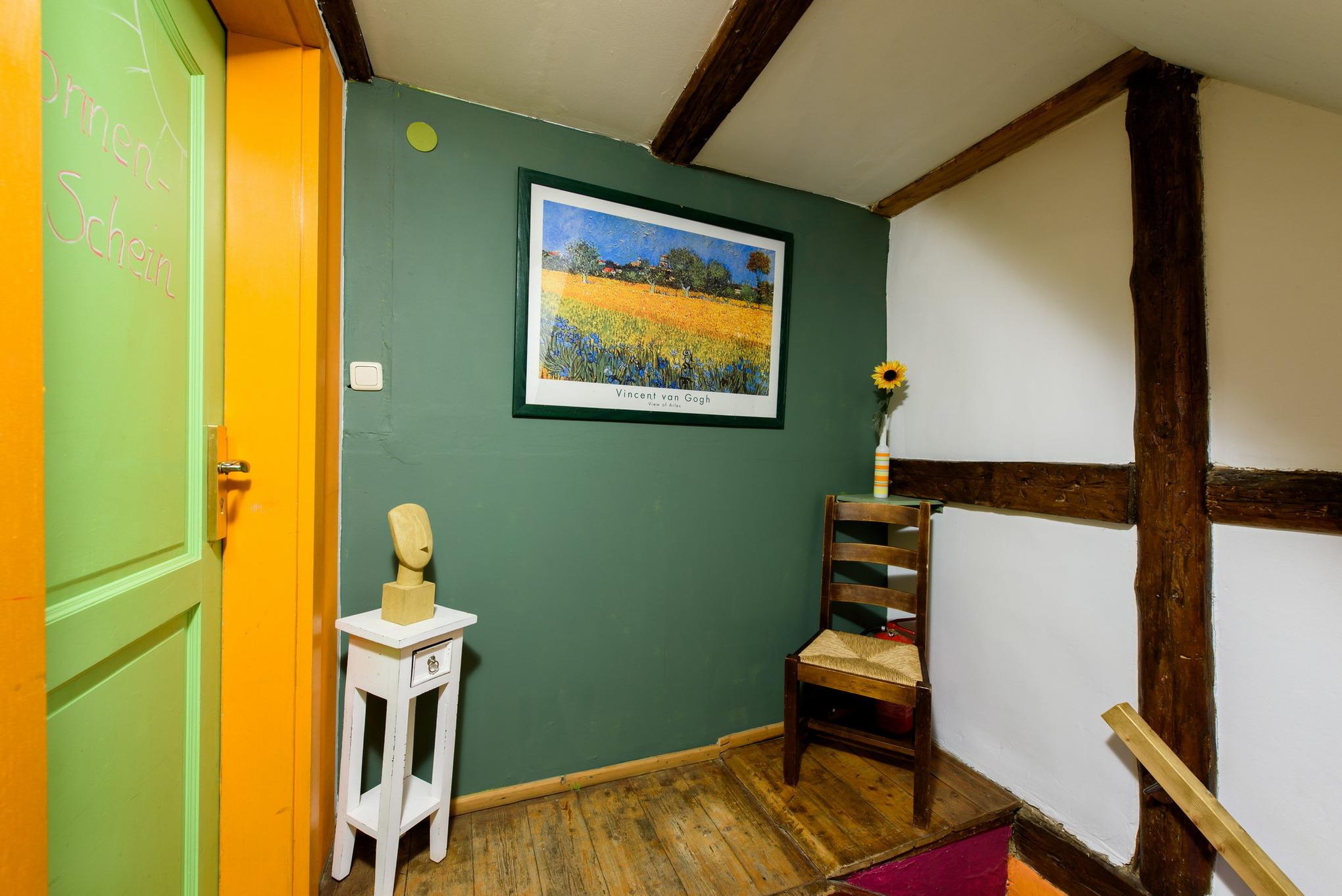 Diese Ferienwohnung ist 47qm groß und besteht aus einem Wohnbereich, der nur durch Balken von einer extravaganten, offenen Küche getrennt ist. Der Esstisch wurde aus einer langen Holzschwarte mit sichtbarer Rinde gefertigt. Die alte Wohnzimmertür und die sehr breiten Dielen lassen das Alter des Hauses erkennen. Vorsicht für Gäste über 2m: sie könnten an die Deckenbalken stoßen. Der Name »Sonnenschein« hat übrigens seine Berechtigung, da die Sonne im laufe des Tages von drei verschiedenen Seiten in dieses Zimmer scheint. Ein Schlafzimmer, Bad und Flur machen das Ganze noch komplett. Auch hier kann gegebenenfalls die Ledercouch für ein bis zwei weitere Gäste zum Schlafen umfunktioniert werden