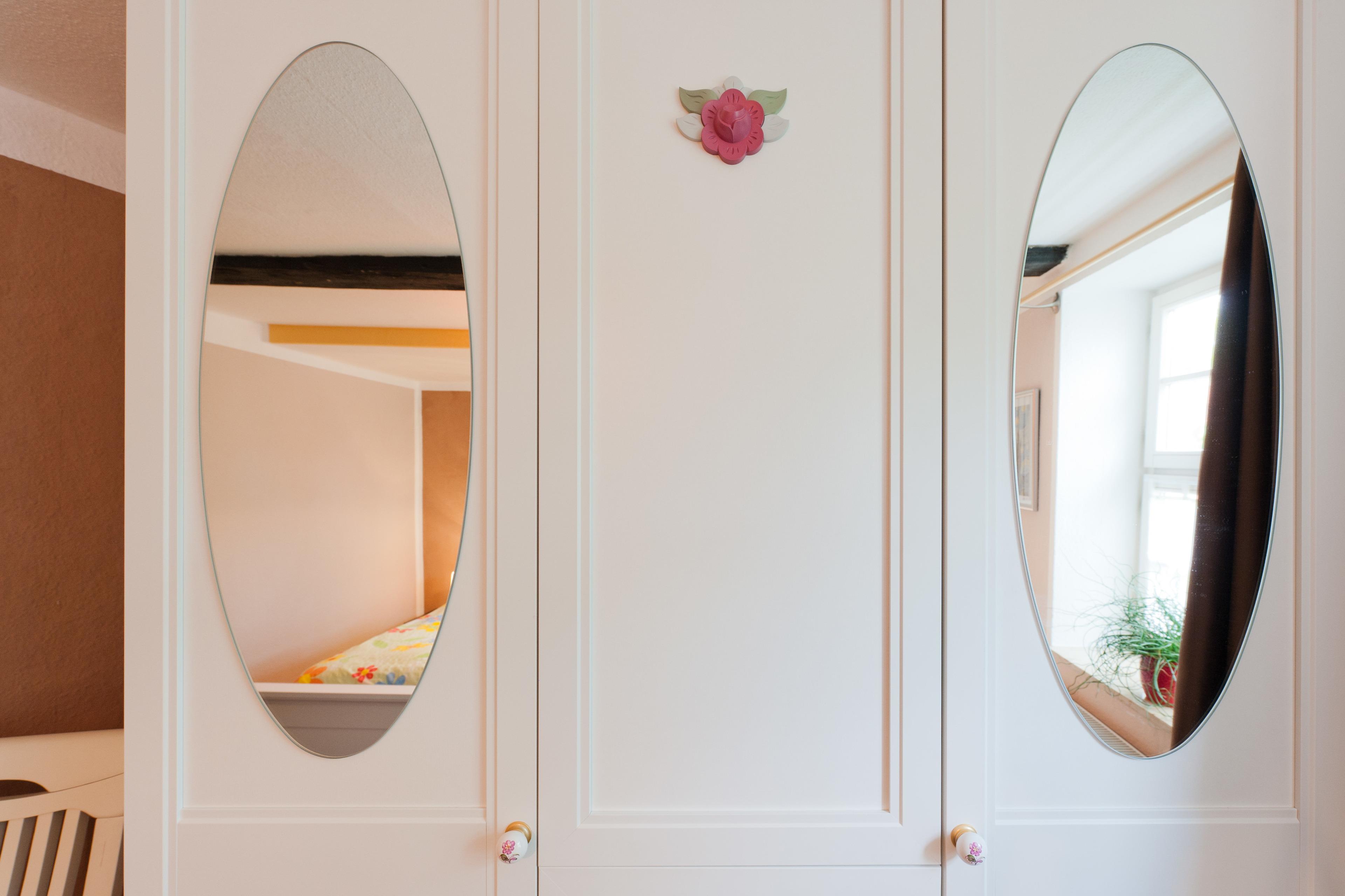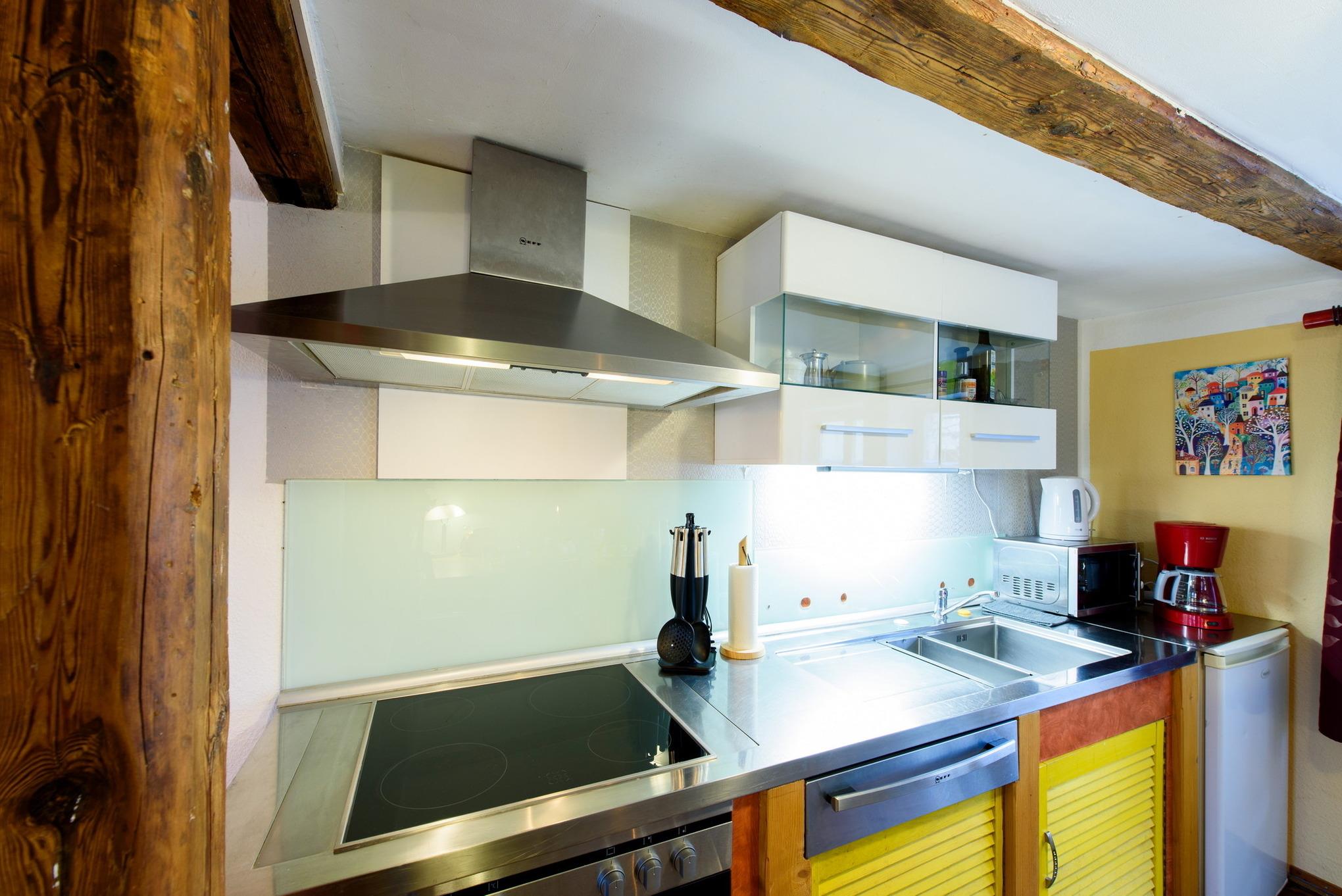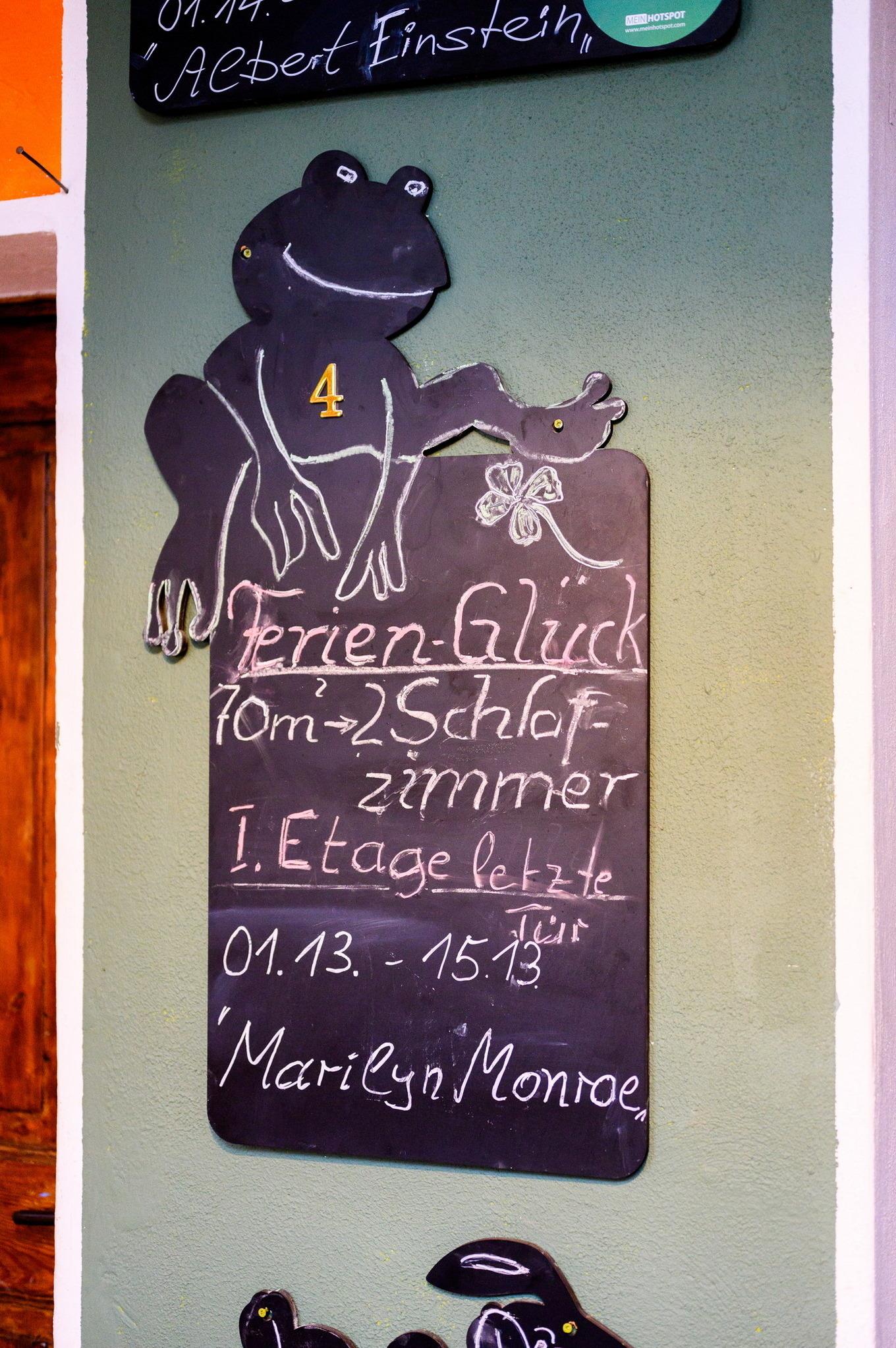 Diese Ferienwohnung ist 47qm groß und besteht aus einem Wohnbereich, der nur durch Balken von einer extravaganten, offenen Küche getrennt ist. Der Esstisch wurde aus einer langen Holzschwarte mit sichtbarer Rinde gefertigt. Die alte Wohnzimmertür und die sehr breiten Dielen lassen das Alter des Hauses erkennen. Vorsicht für Gäste über 2m: sie könnten an die Deckenbalken stoßen. Der Name »Sonnenschein« hat übrigens seine Berechtigung, da die Sonne im laufe des Tages von drei verschiedenen Seiten in dieses Zimmer scheint. Ein Schlafzimmer, Bad und Flur machen das Ganze noch komplett. Auch hier kann gegebenenfalls die Ledercouch für ein bis zwei weitere Gäste zum Schlafen umfunktioniert werden
