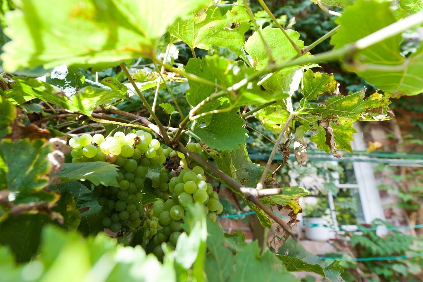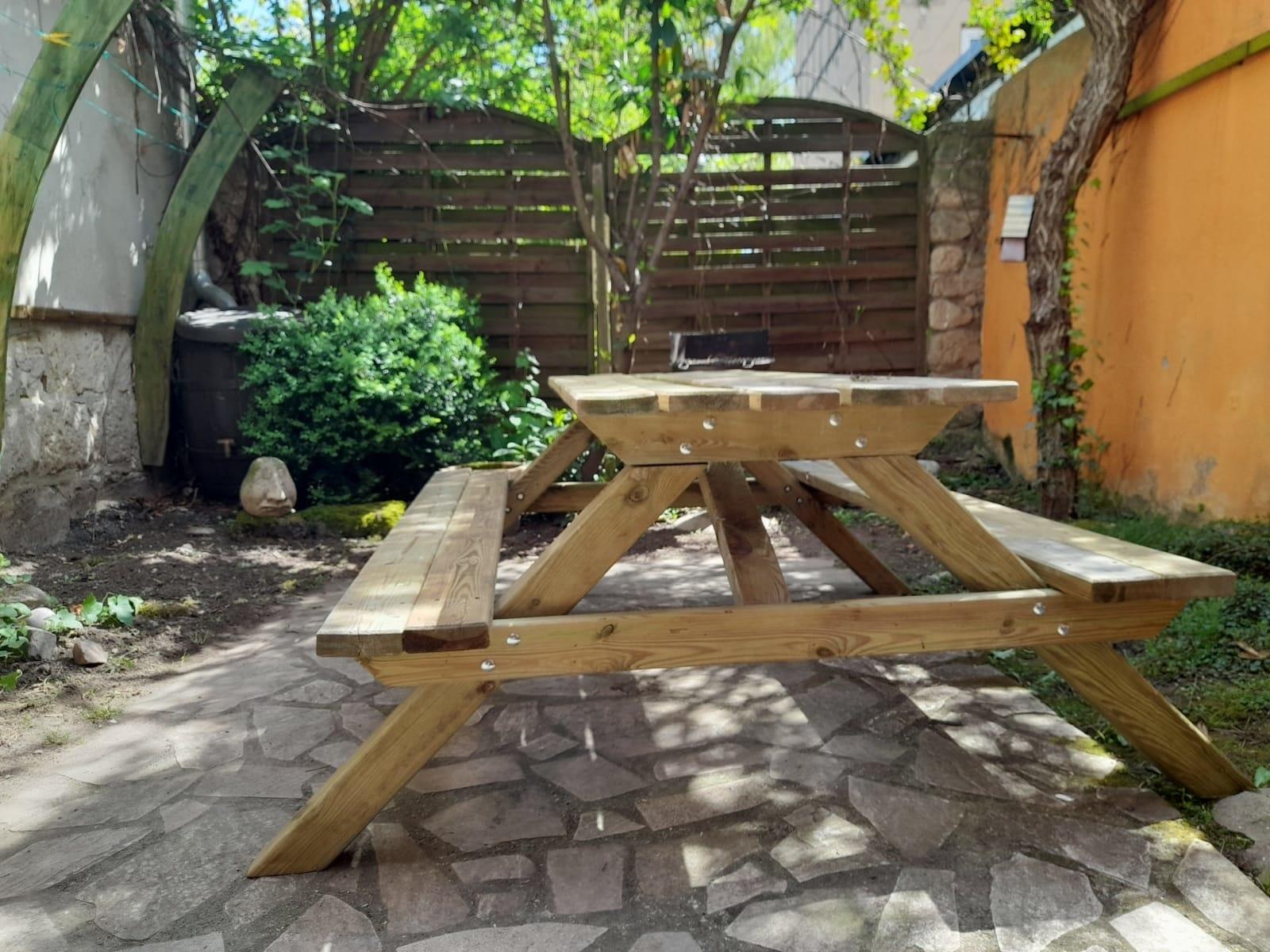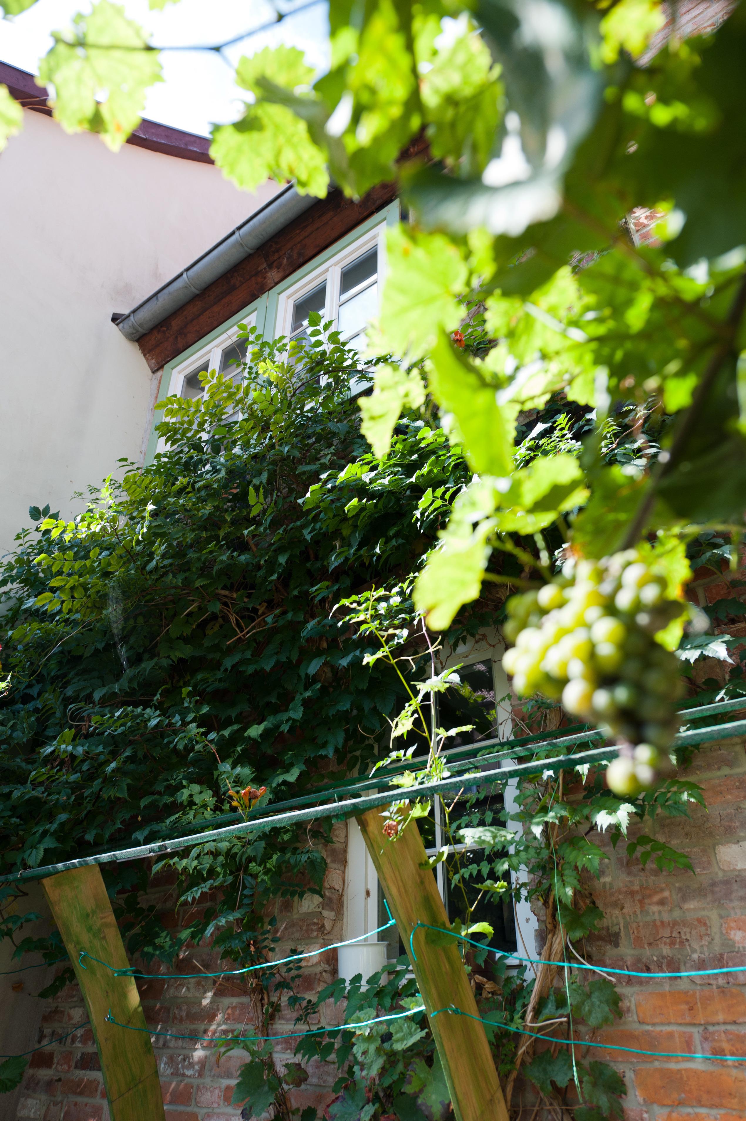 Auf dem Hof befinden sich am Haus Weinstöcke und ein großer Tisch zum Entspannen.