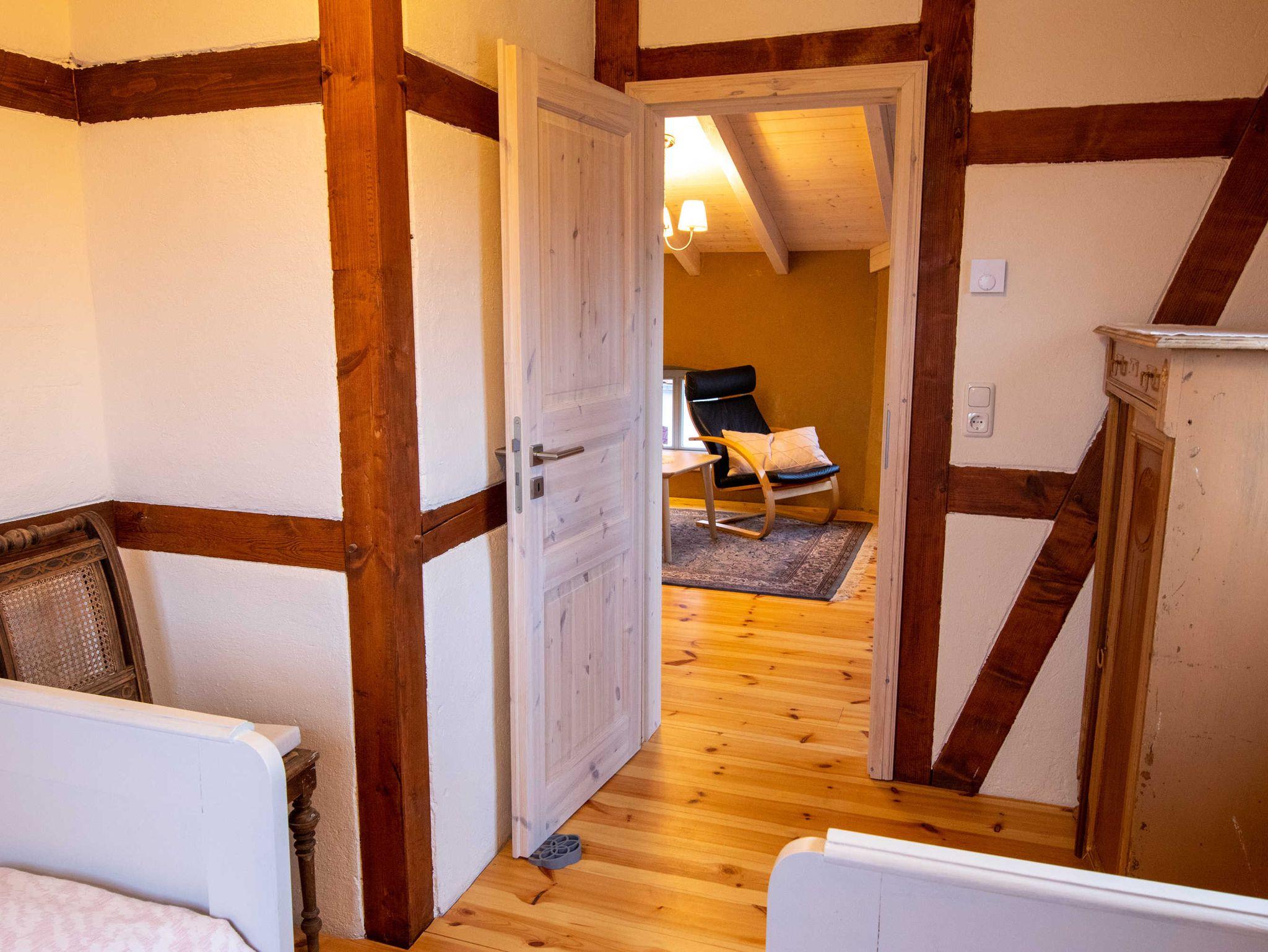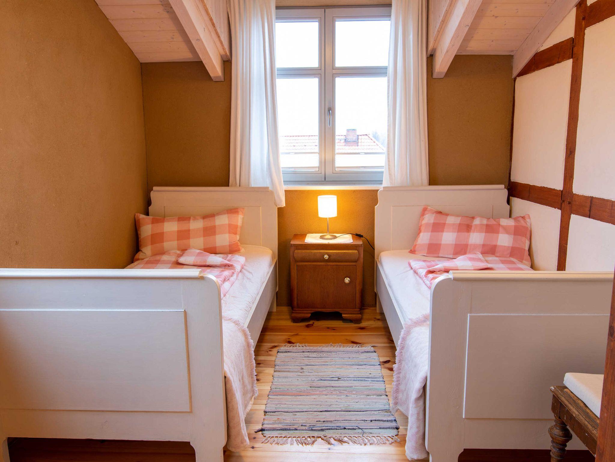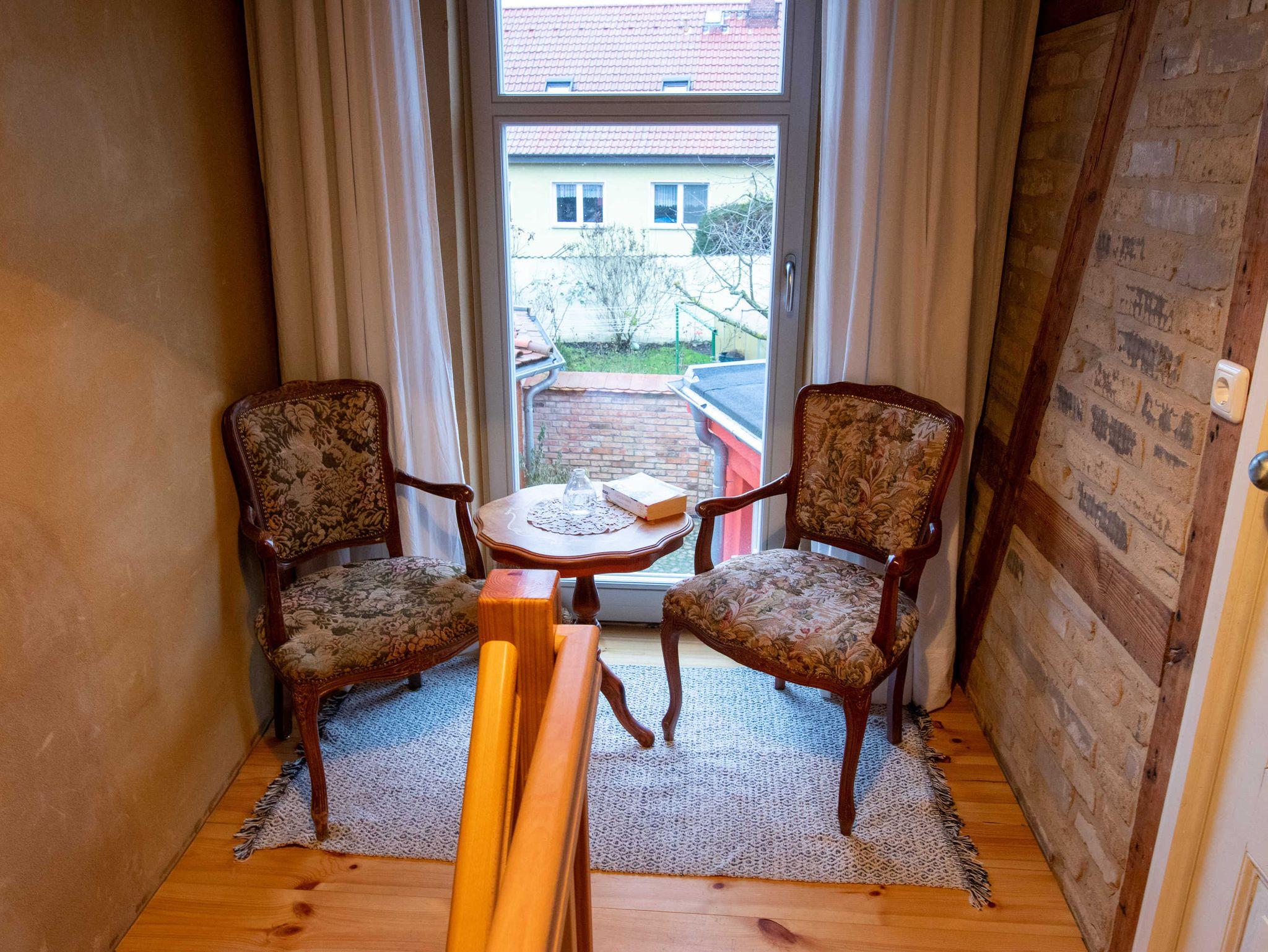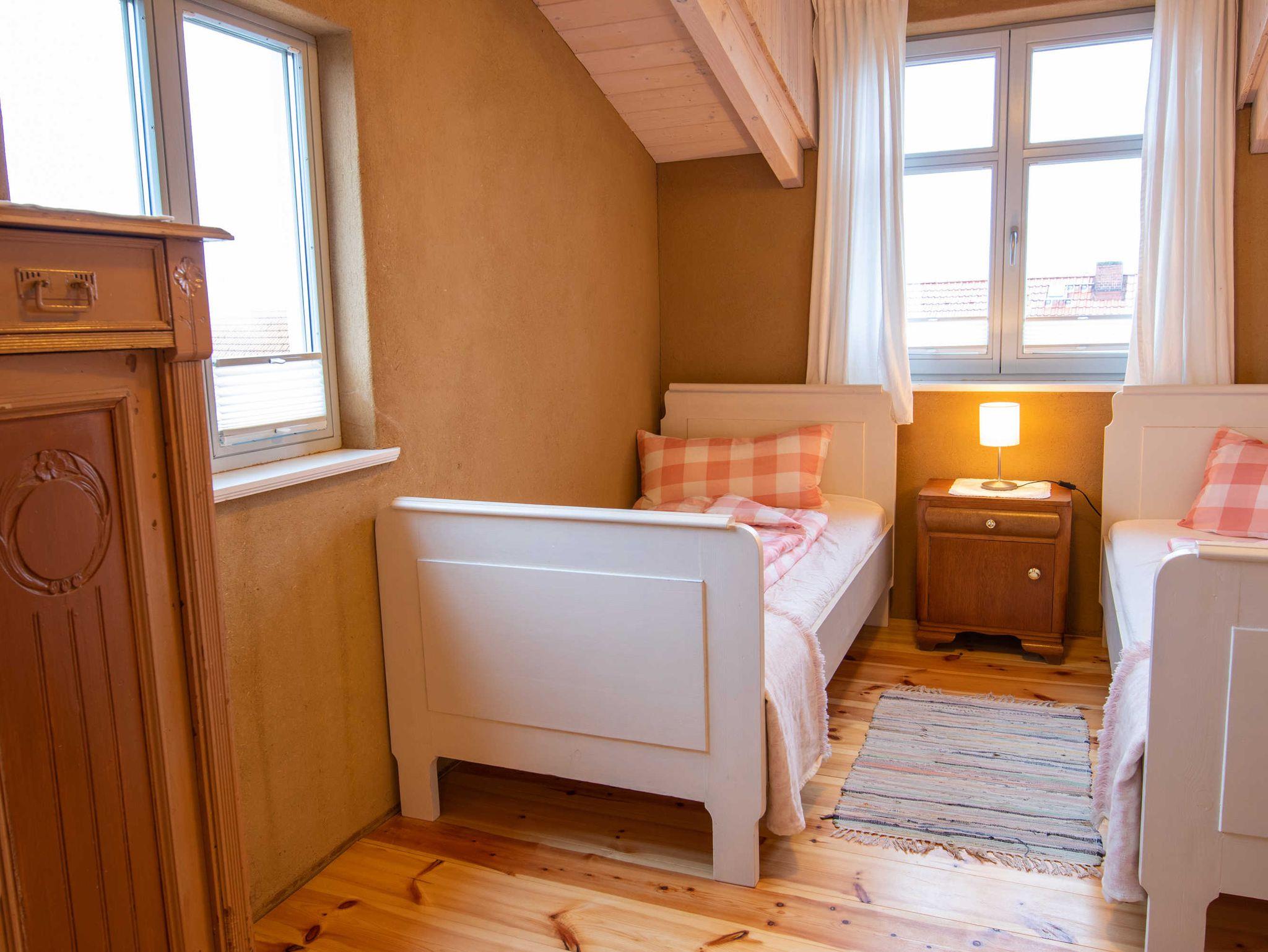 Über eine Treppe gelangen Sie ins gemütliche Wohnzimmer im Dachgeschoss, das mit Couch und Schwingsessel zum Entspannen einlädt. Die separaten Schlafräume gehen vom Wohnzimmer ab. Sie sind mit viel Liebe zum Detail individuell eingerichtet. Im großen Schlafzimmer befindet sich ein selbst gebautes Doppelbett mit einer durchgehenden Matratze (160x200). Ebenso ist ein geräumiger Kleiderschrank individuell in das Zimmer integriegt, welcher viel Platz für Koffer, Schuhe und Kleidung bietet. Im kleinen Schlafzimmer stehen zwei historische Einzelbetten (je 90x190). Zur Aufbewahrung steht Ihnen hier ein Herrenschrank zur Verfügung. Das Bad ist mit einer freistehenden Badewanne und einer bodengleichen Dusche ausgestattet.