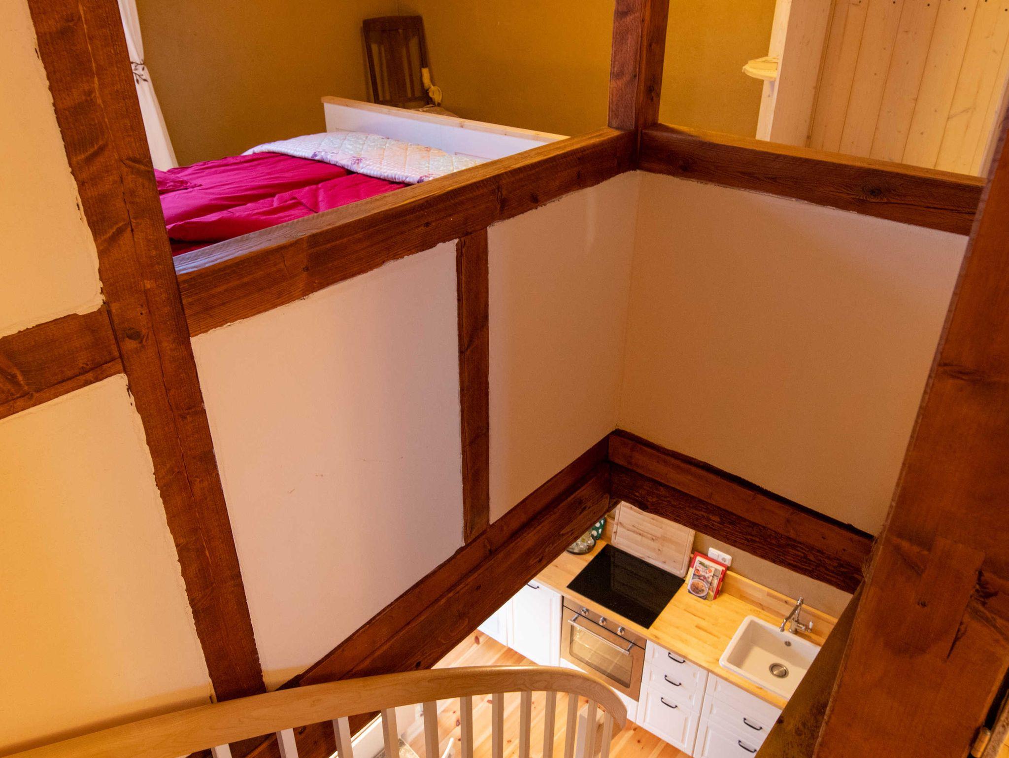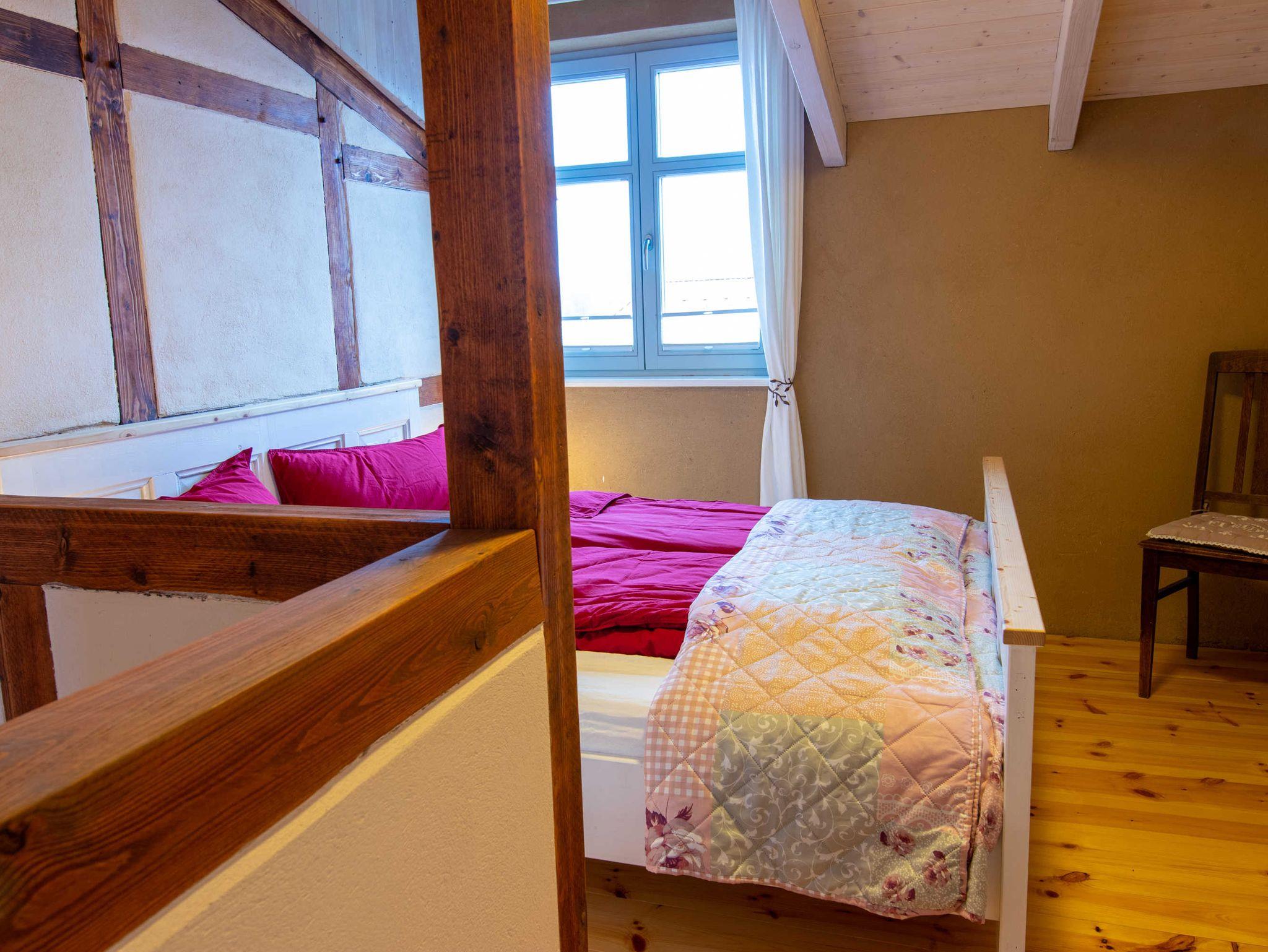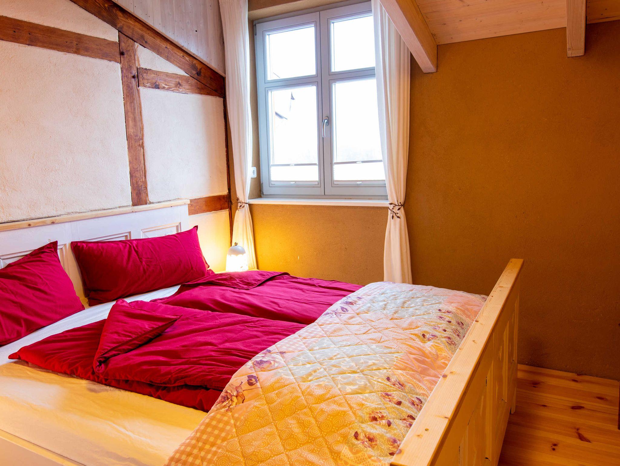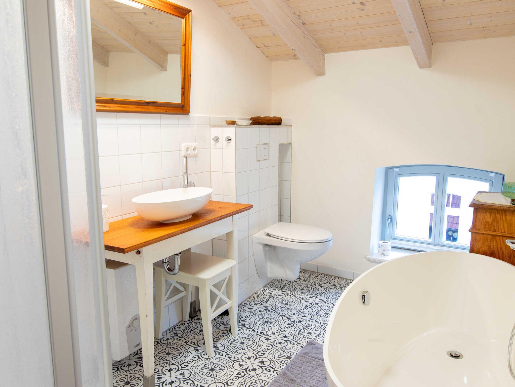 Über eine Treppe gelangen Sie ins gemütliche Wohnzimmer im Dachgeschoss, das mit Couch und Schwingsessel zum Entspannen einlädt. Die separaten Schlafräume gehen vom Wohnzimmer ab. Sie sind mit viel Liebe zum Detail individuell eingerichtet. Im großen Schlafzimmer befindet sich ein selbst gebautes Doppelbett mit einer durchgehenden Matratze (160x200). Ebenso ist ein geräumiger Kleiderschrank individuell in das Zimmer integriegt, welcher viel Platz für Koffer, Schuhe und Kleidung bietet. Im kleinen Schlafzimmer stehen zwei historische Einzelbetten (je 90x190). Zur Aufbewahrung steht Ihnen hier ein Herrenschrank zur Verfügung. Das Bad ist mit einer freistehenden Badewanne und einer bodengleichen Dusche ausgestattet.
