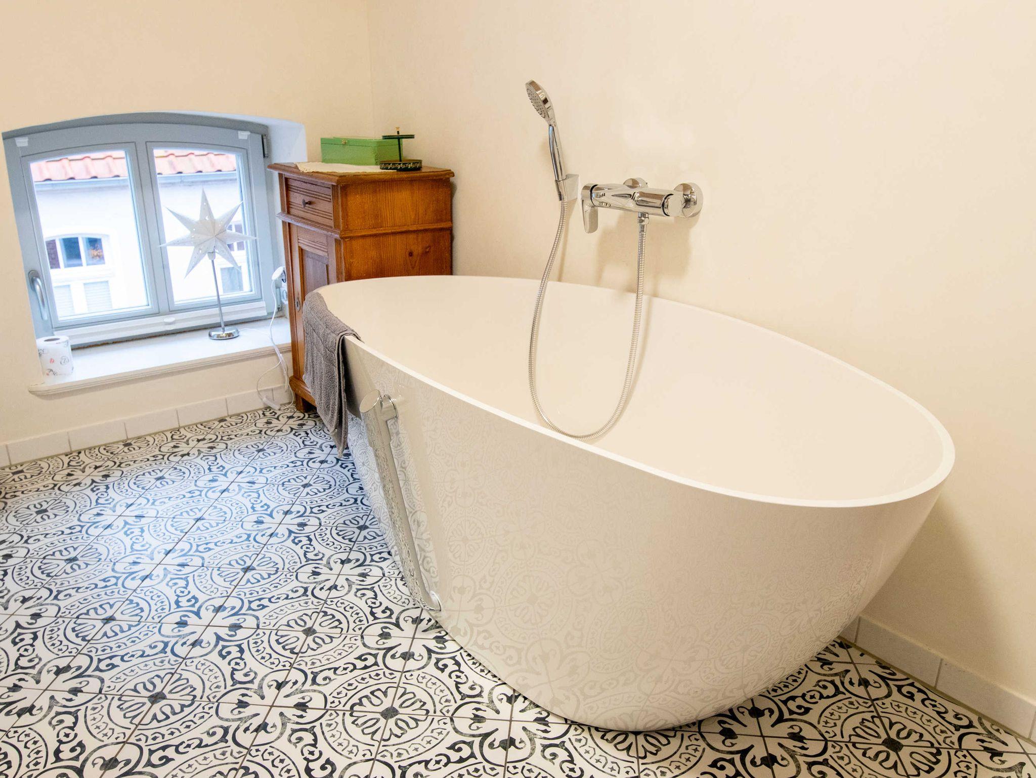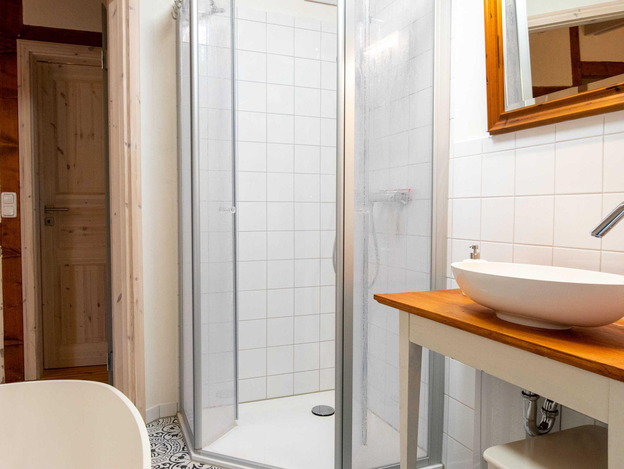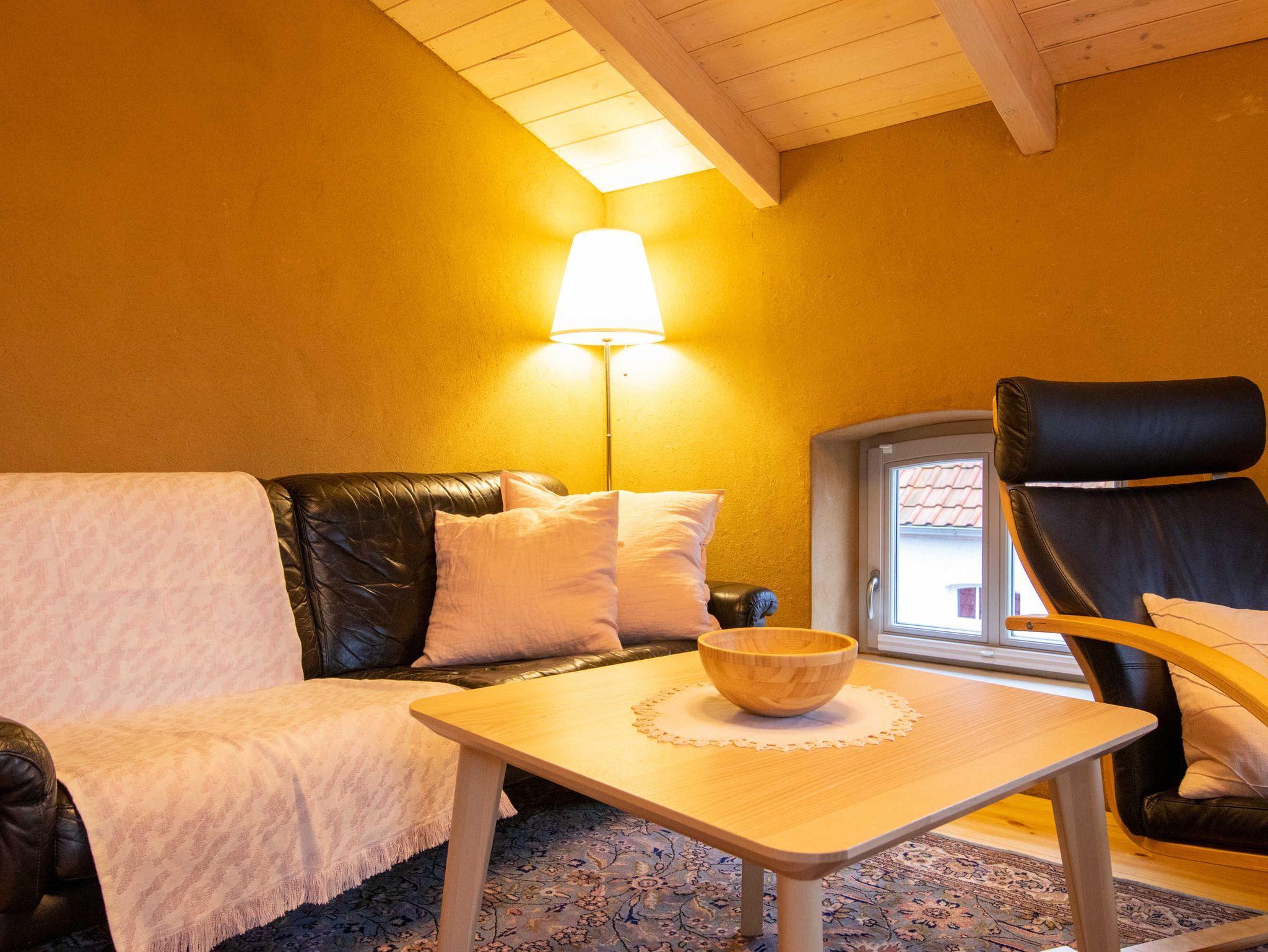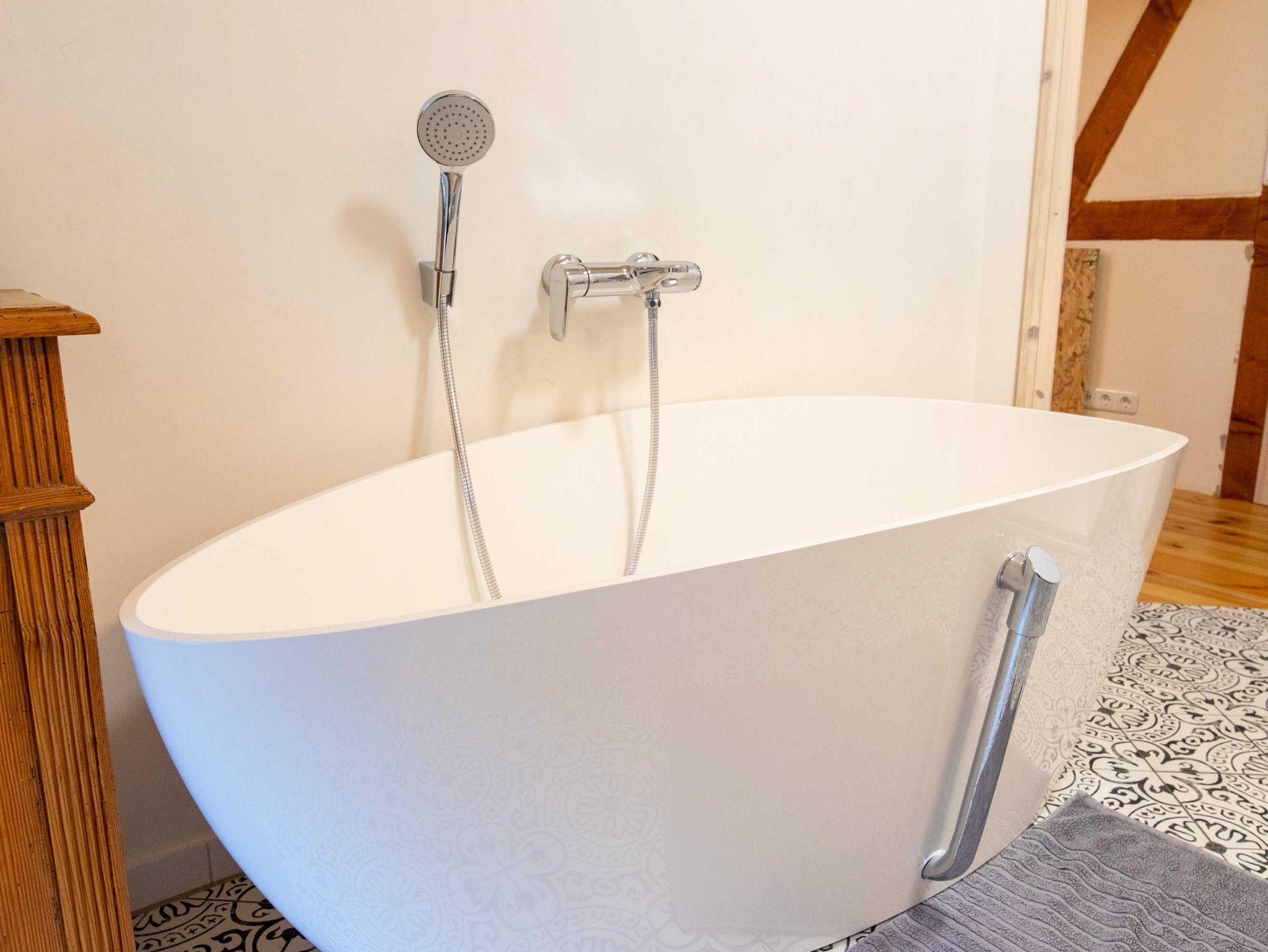 Über eine Treppe gelangen Sie ins gemütliche Wohnzimmer im Dachgeschoss, das mit Couch und Schwingsessel zum Entspannen einlädt. Die separaten Schlafräume gehen vom Wohnzimmer ab. Sie sind mit viel Liebe zum Detail individuell eingerichtet. Im großen Schlafzimmer befindet sich ein selbst gebautes Doppelbett mit einer durchgehenden Matratze (160x200). Ebenso ist ein geräumiger Kleiderschrank individuell in das Zimmer integriegt, welcher viel Platz für Koffer, Schuhe und Kleidung bietet. Im kleinen Schlafzimmer stehen zwei historische Einzelbetten (je 90x190). Zur Aufbewahrung steht Ihnen hier ein Herrenschrank zur Verfügung. Das Bad ist mit einer freistehenden Badewanne und einer bodengleichen Dusche ausgestattet.