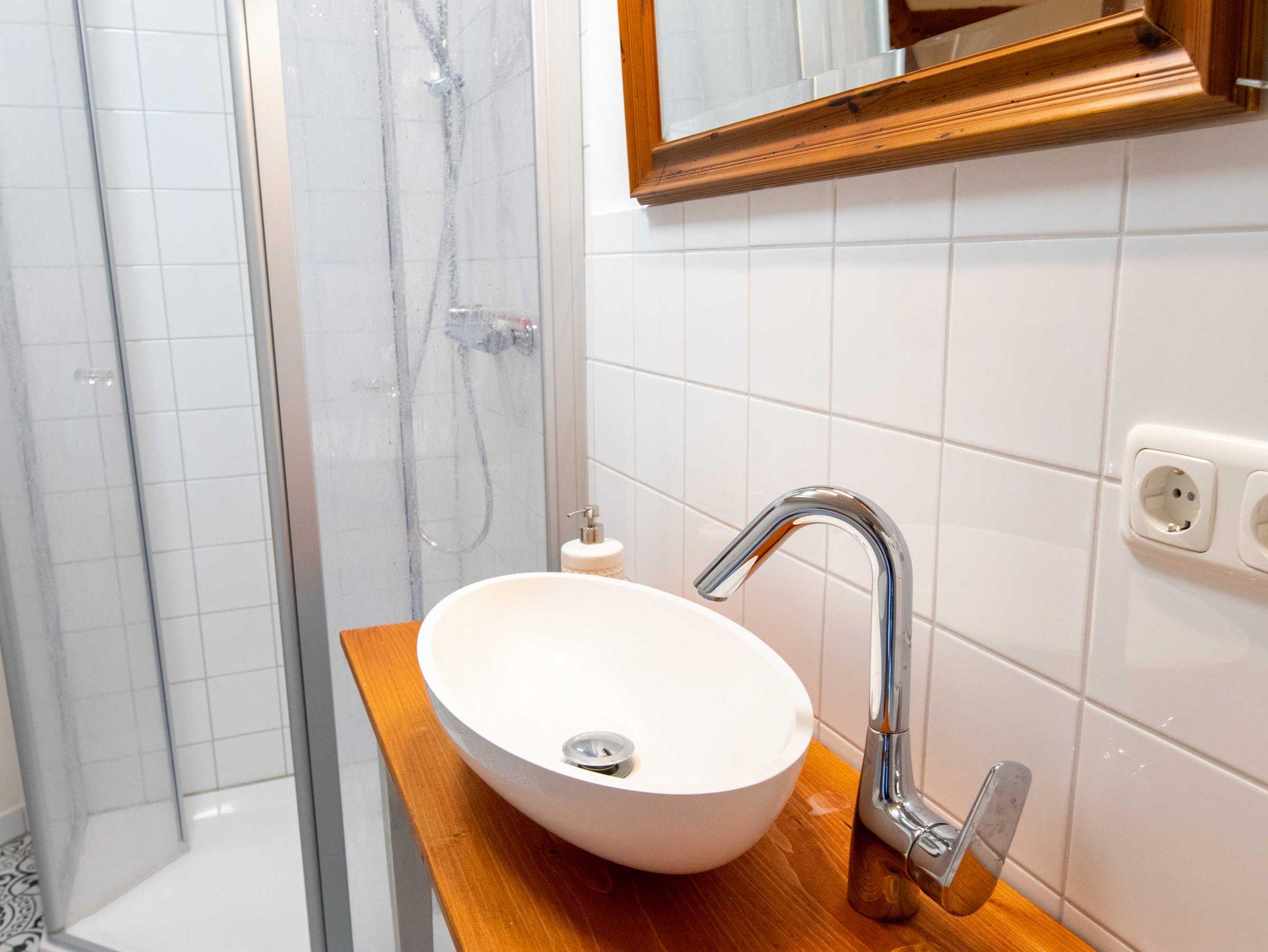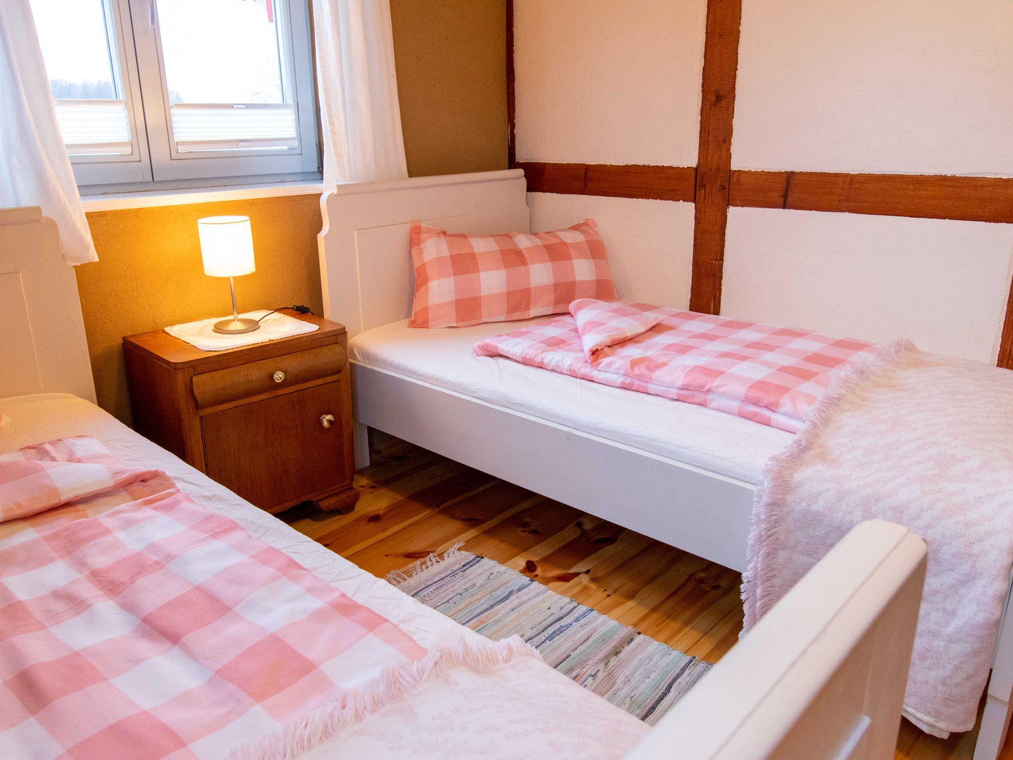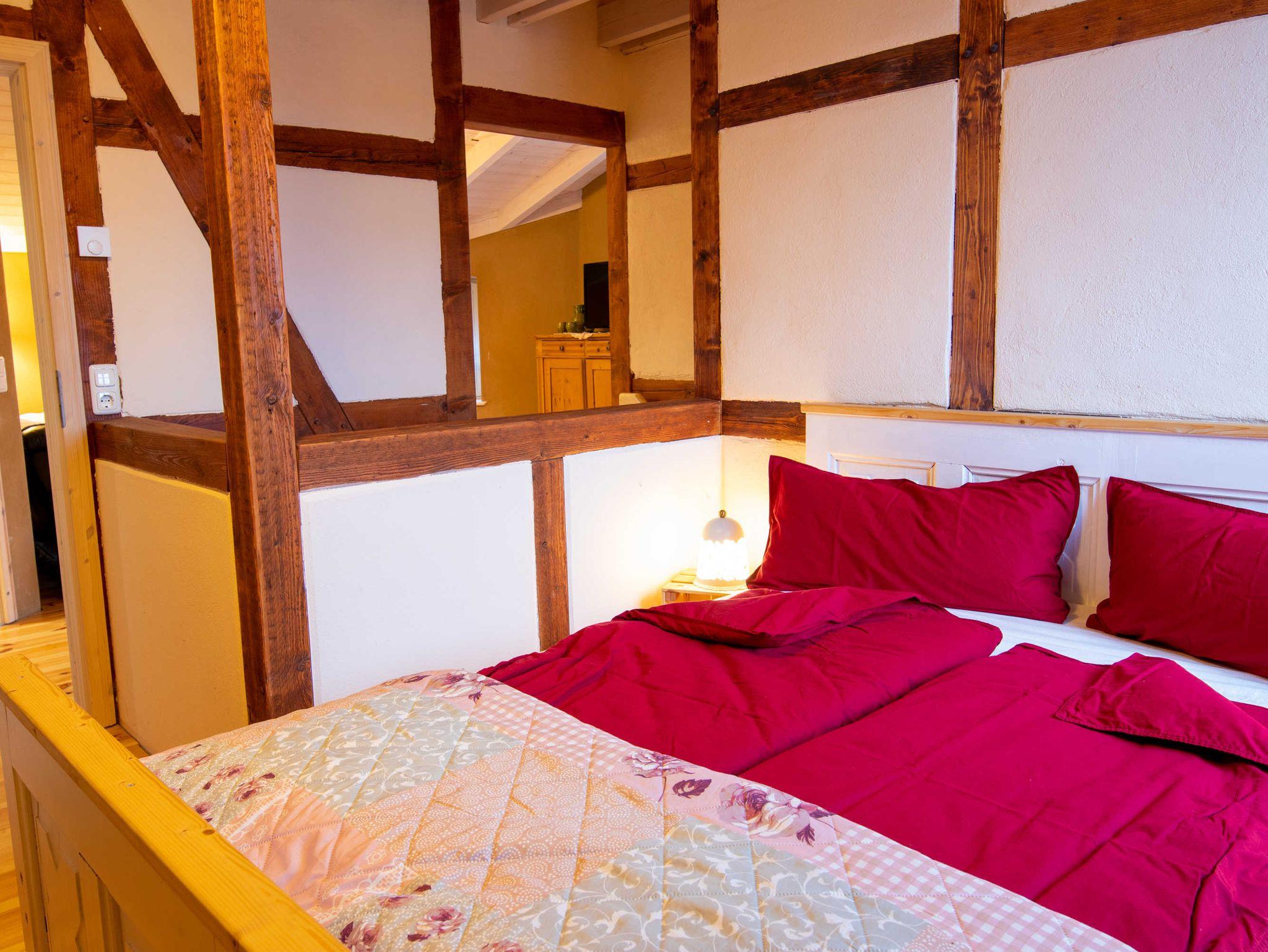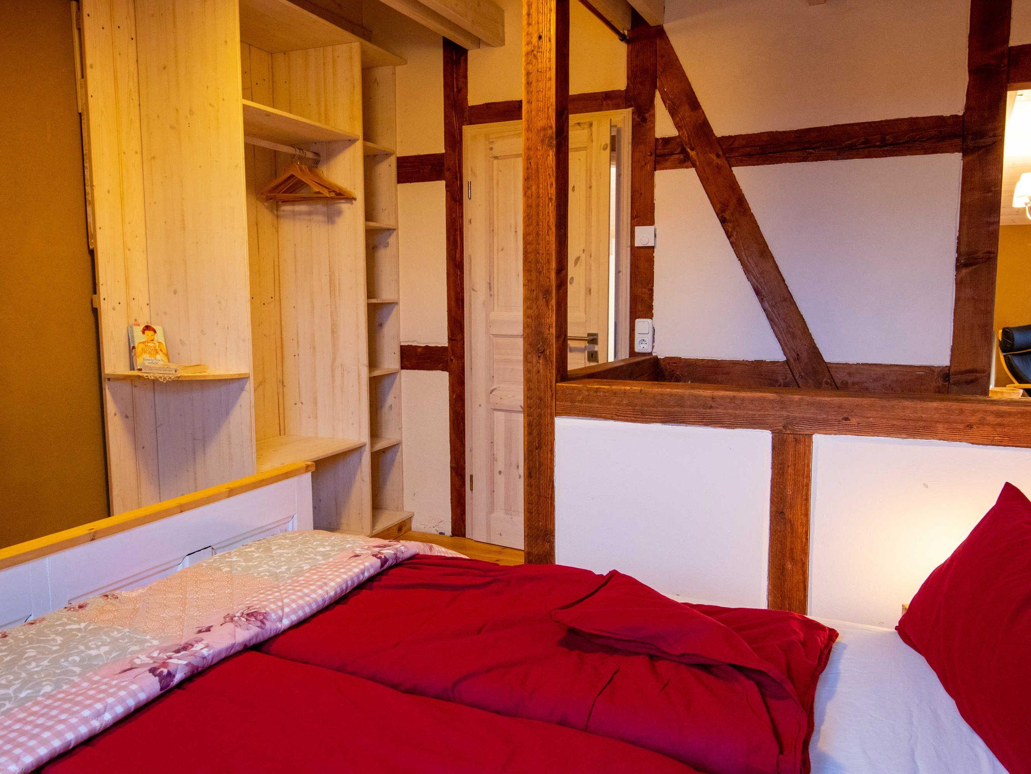 Über eine Treppe gelangen Sie ins gemütliche Wohnzimmer im Dachgeschoss, das mit Couch und Schwingsessel zum Entspannen einlädt. Die separaten Schlafräume gehen vom Wohnzimmer ab. Sie sind mit viel Liebe zum Detail individuell eingerichtet. Im großen Schlafzimmer befindet sich ein selbst gebautes Doppelbett mit einer durchgehenden Matratze (160x200). Ebenso ist ein geräumiger Kleiderschrank individuell in das Zimmer integriegt, welcher viel Platz für Koffer, Schuhe und Kleidung bietet. Im kleinen Schlafzimmer stehen zwei historische Einzelbetten (je 90x190). Zur Aufbewahrung steht Ihnen hier ein Herrenschrank zur Verfügung. Das Bad ist mit einer freistehenden Badewanne und einer bodengleichen Dusche ausgestattet.