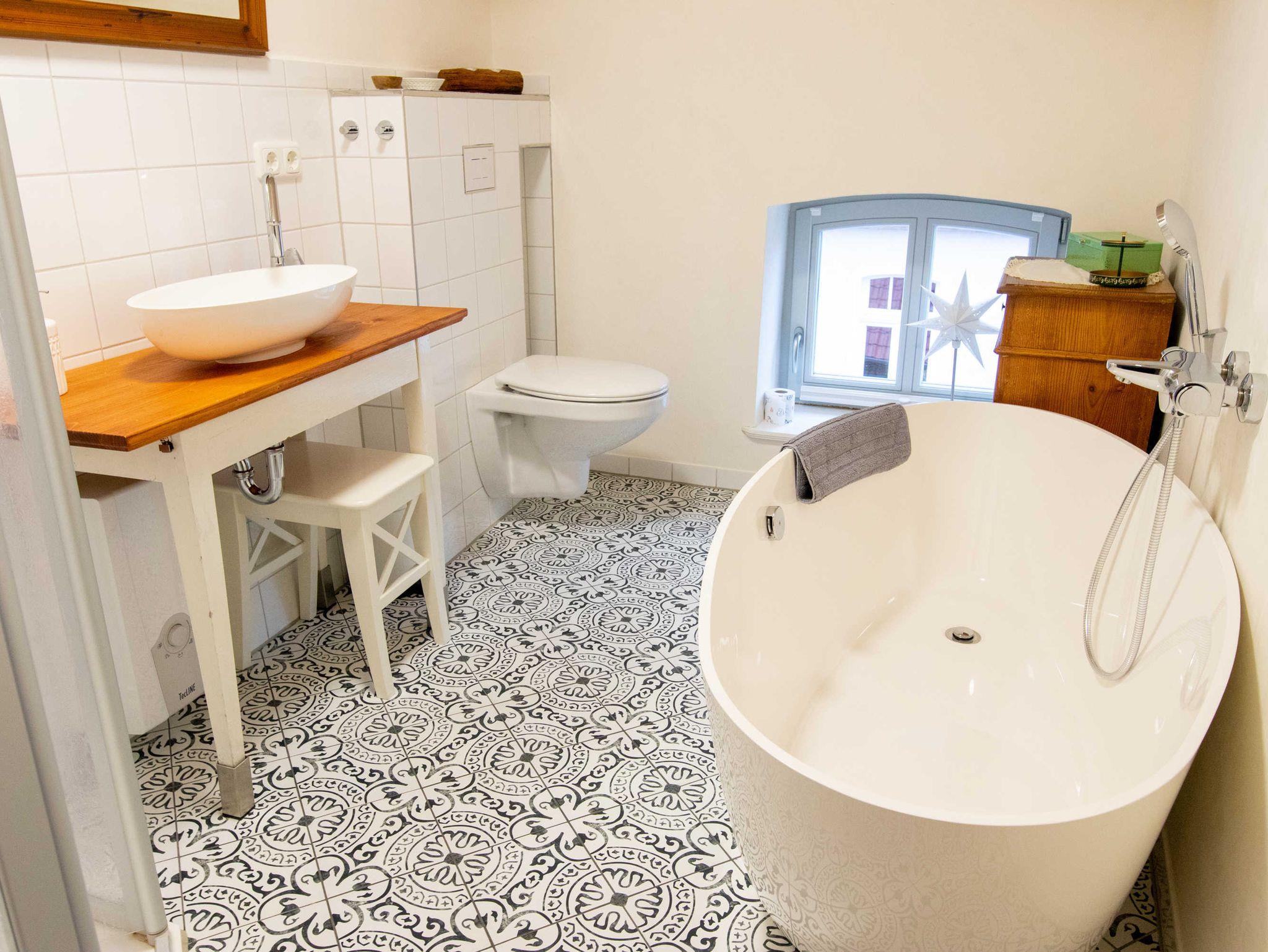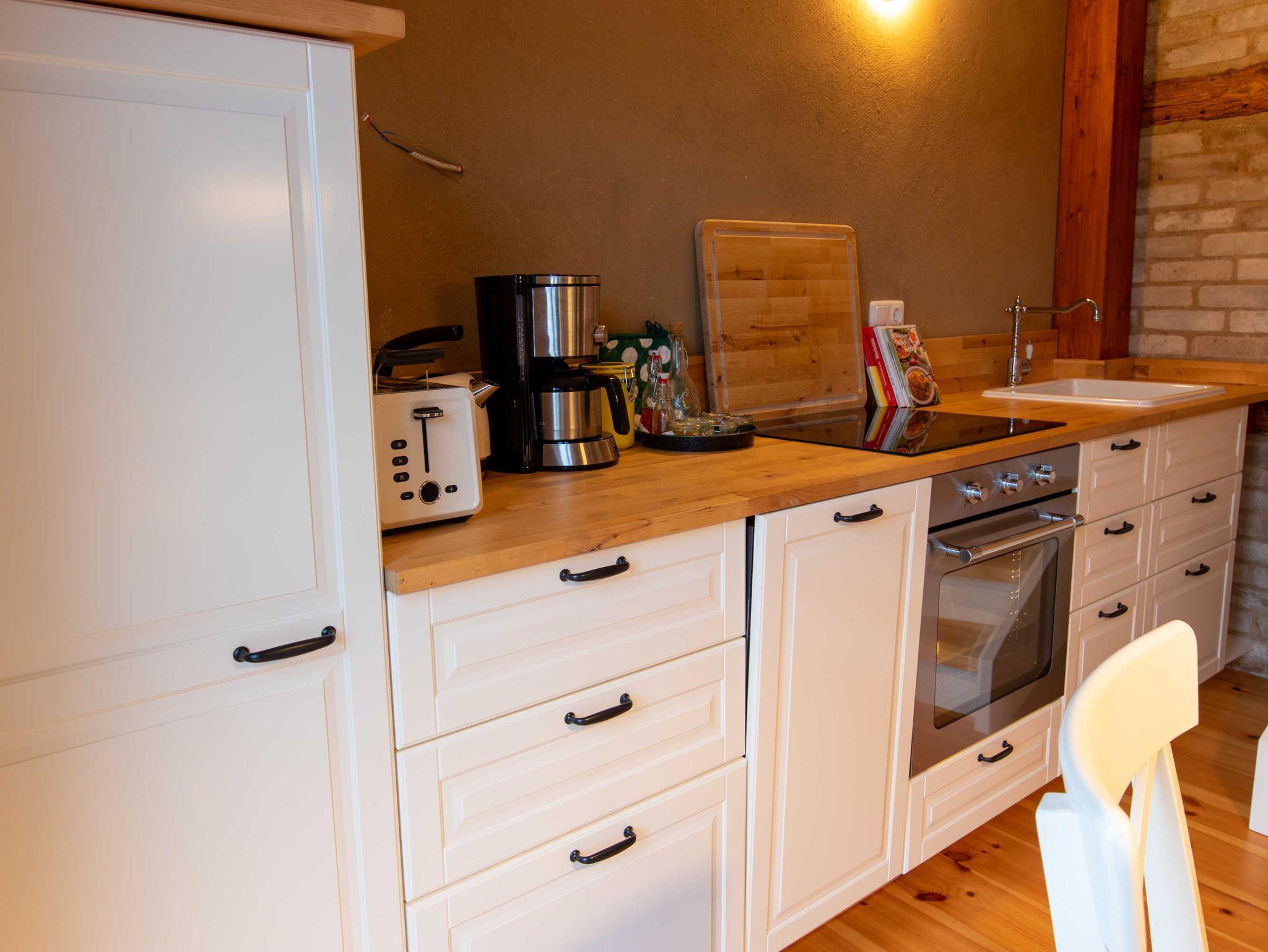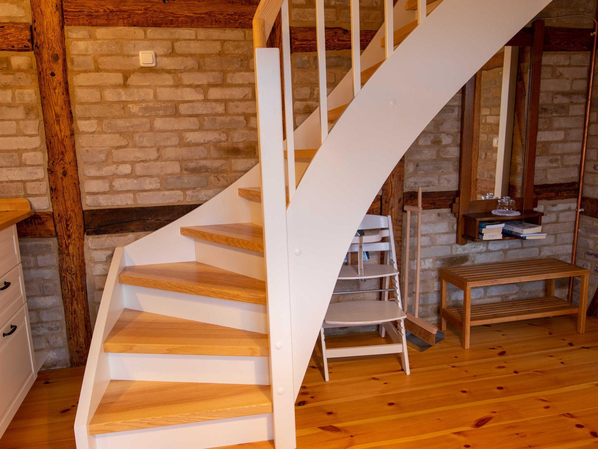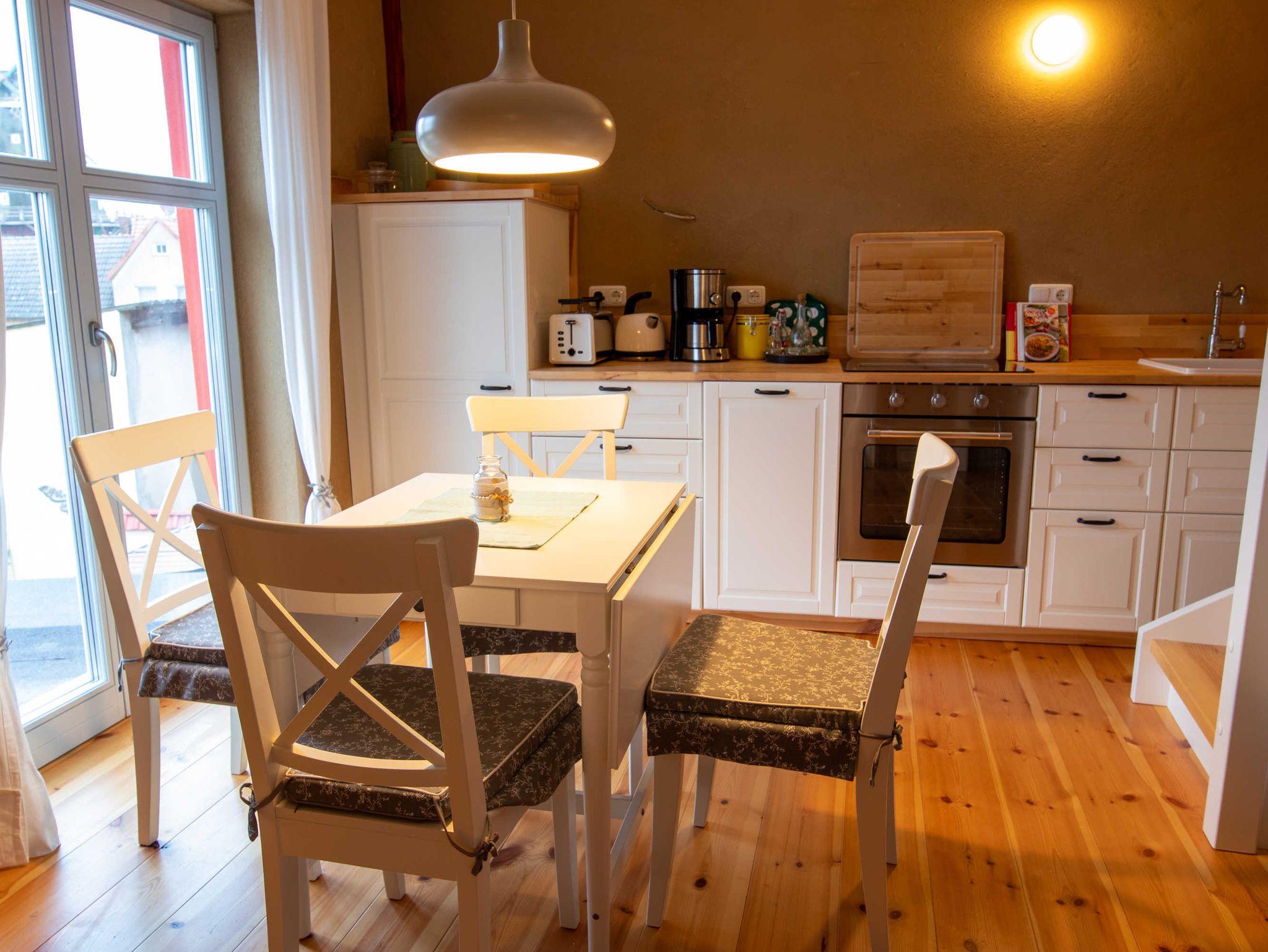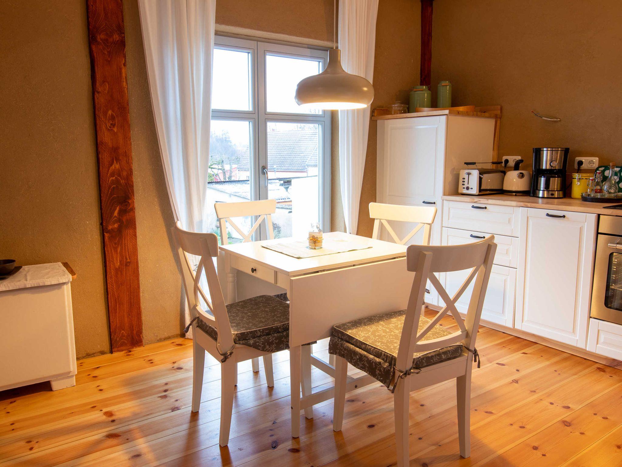 Im 1. Obergeschoss des Hauses liegt der untere Teil der Ferienwohnung. Dort befindet sich die separate Küche im Landhausstil. Die Küche ist gut ausgestattet und verfügt über einen Geschirrspüler. Vom Essbereich haben Sie einen herrlichen Blick auf die Mühle und den Mönchsteich.