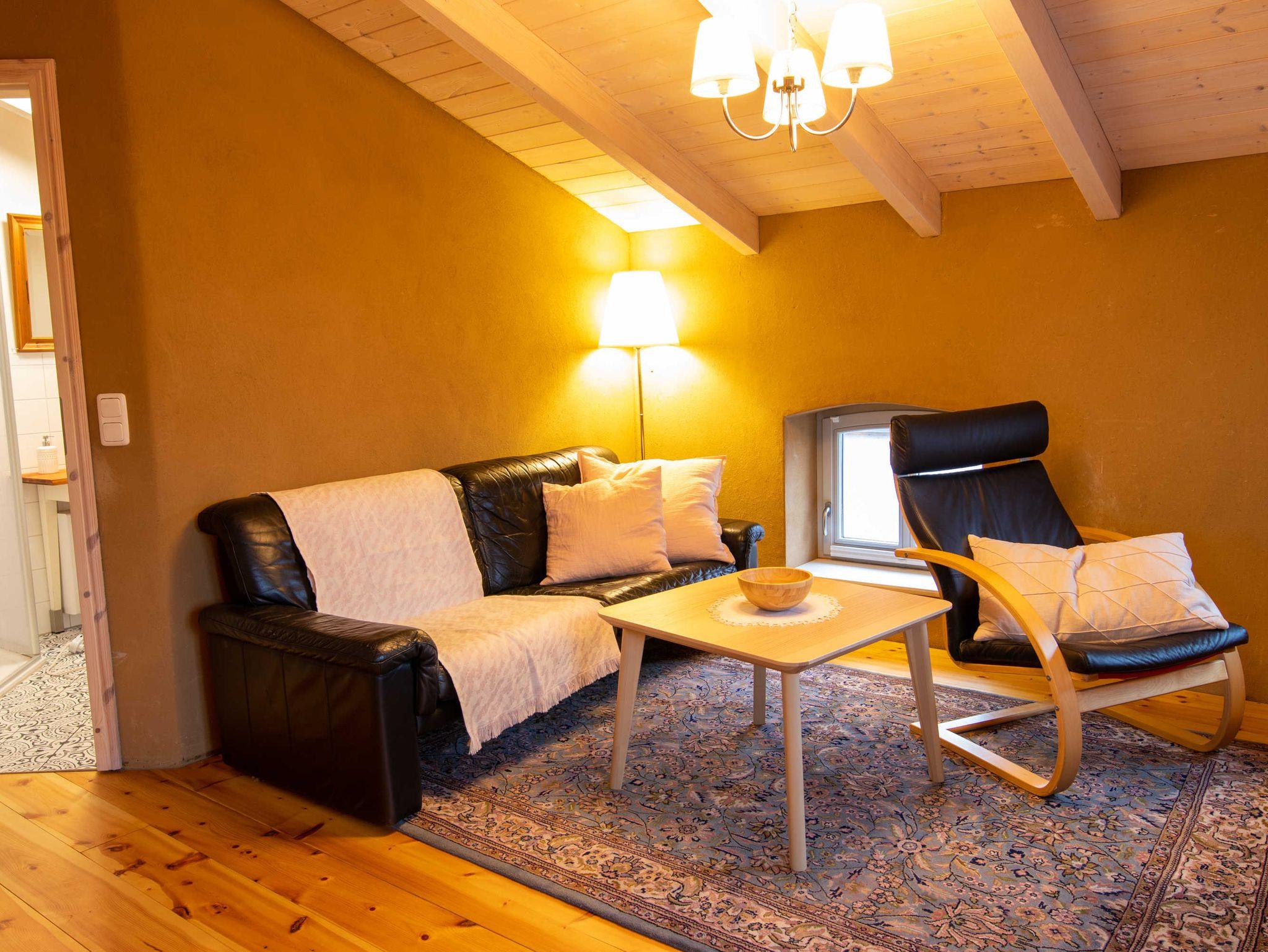 Die Ferienwohnungen im Obergeschoss sind über das inneliegende Treppenhaus zu erreichen. Beide sind mit einer in den Naturlehm eingebetteten Wandheizung ausgestattet. Auf eine ausfallende farbliche Gestaltung der Wände wurde verzichtet, um das besondere Raumklima wirken zu lassen. Die Wohnungen sind schlicht möbliert, mit antiken oder selbst gebauten Möbeln und einigen modernen Elementen. Dielenfußboden und Einzelteppiche unterstreichen zusätzlich die Gemütlichkeit der Räume. So bieten die Ferienwohnungen eine Wohlfühloase zum Entspannen nach einem erlebnisreichen Urlaubstag.