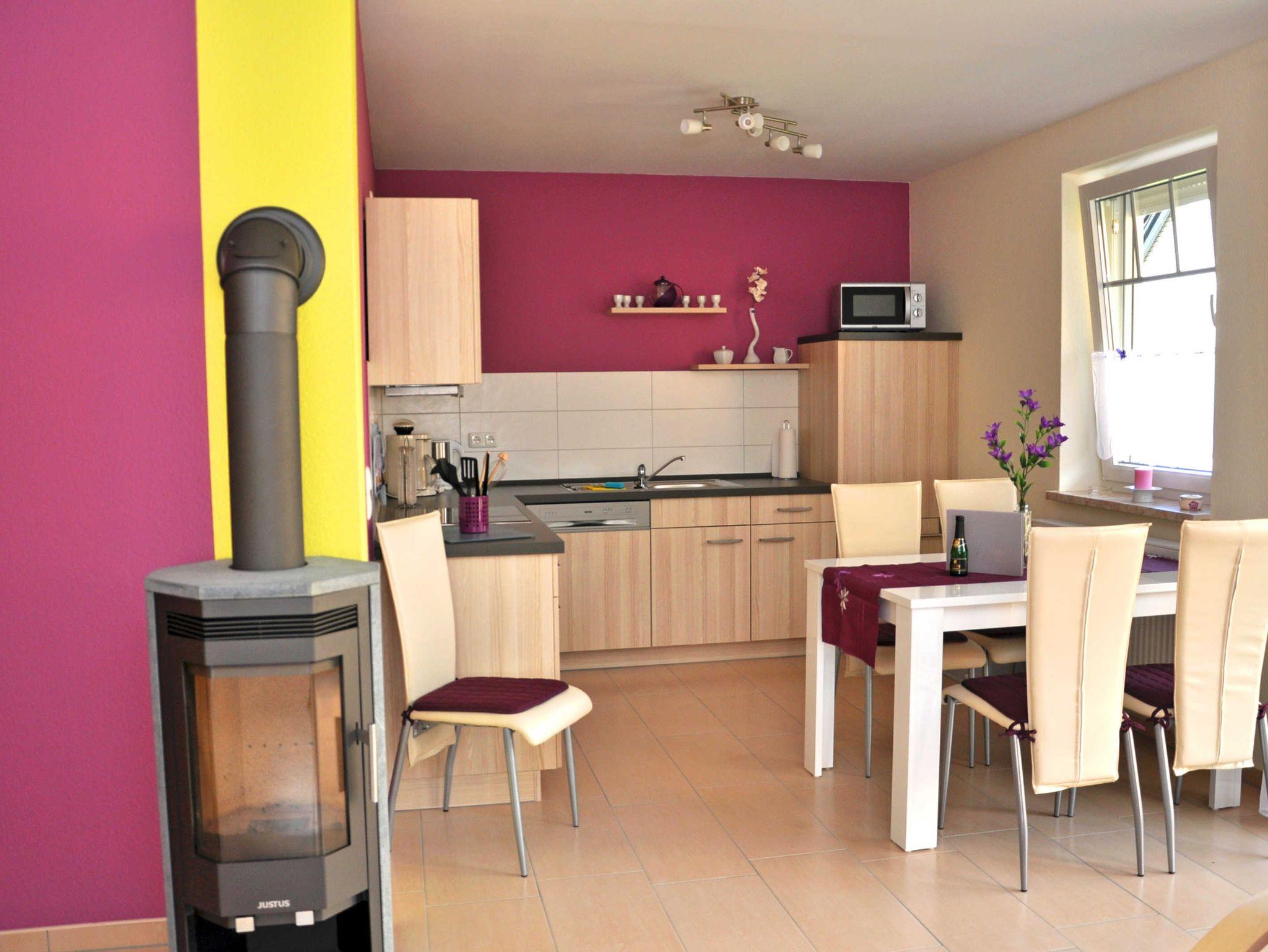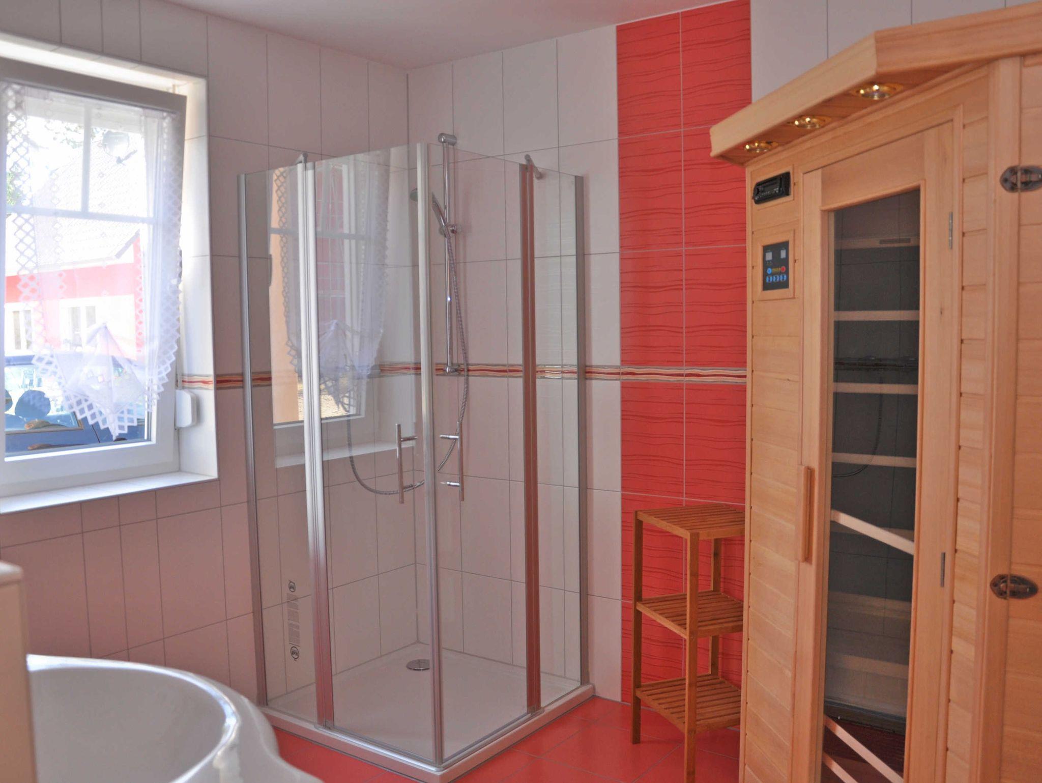 Eine Aufbettungsmöglichkeit besteht im Wohnzimmer. Die Couch verfügt über eine Schlaffunktion. Darüber hinaus verfügt das EG-Appartement über 1 Bad mit Dusche sowie einer Infrarot-Sauna und Kamin, kostenfreien WLAN, Wohn- /Essbereich mit vollwertiger Einbauküche mit Spülmaschine, Kühl-/Gefrierfunktion, Ceranherd und Mikrowelle stehen ebenfalls zur Verfügung.