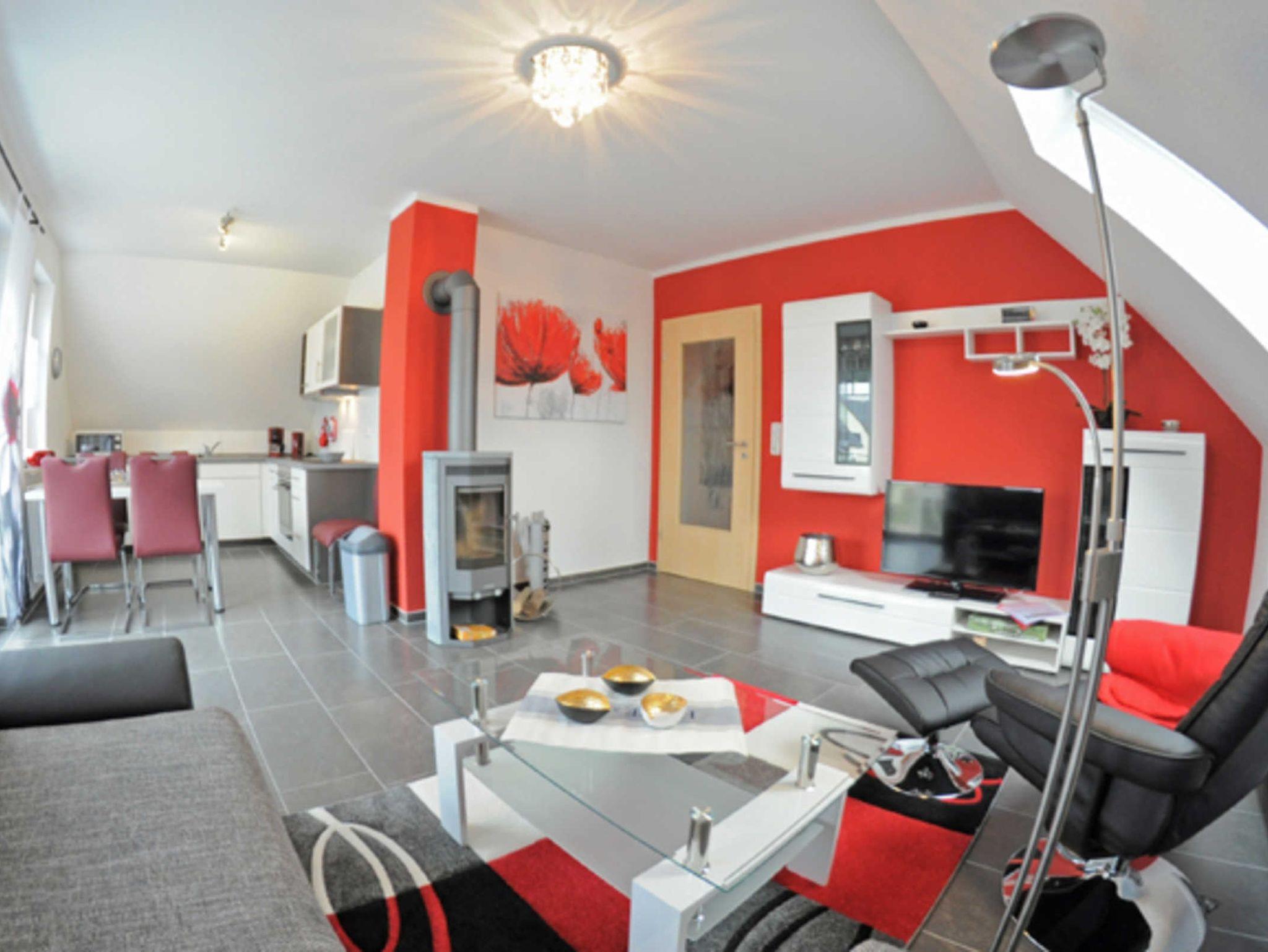 Die beliebte 3 Zimmer Obergeschoss - Ferienwohnung im Ferienhaus Müritzidyll verfügt über 2 Schlafzimmer, 1 Wohn- und Essbereich, Kamin (hier stellt der Vermieter das Brennholz kostenfrei), TV, Balkon sowie eine Infrarot-Sauna im Duschbad runden die Ausstattung der geschmackvoll eingerichteten Ferienwohnung ab. Die rund 60 qm große Ferienwohnung kann mit bis zu 4 Personen belegt werden.
