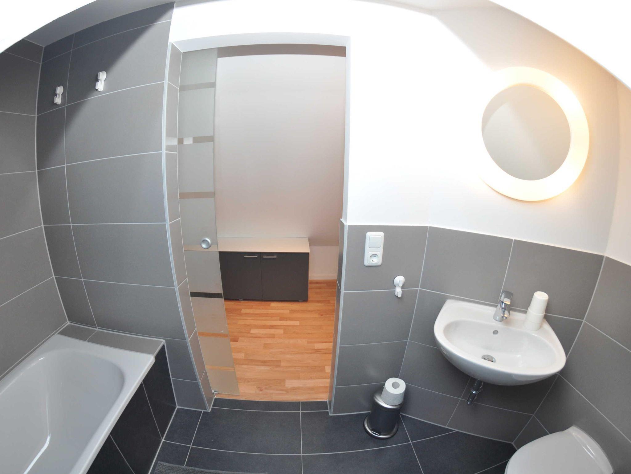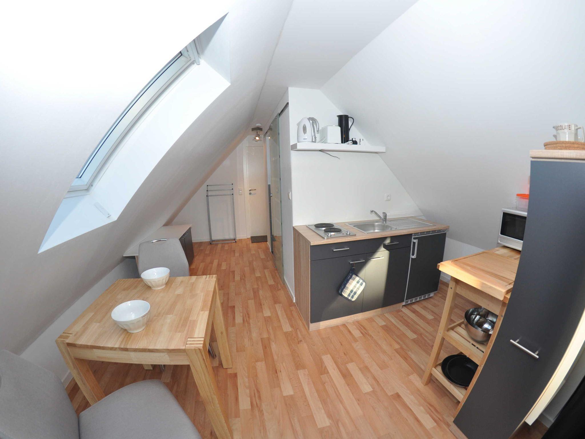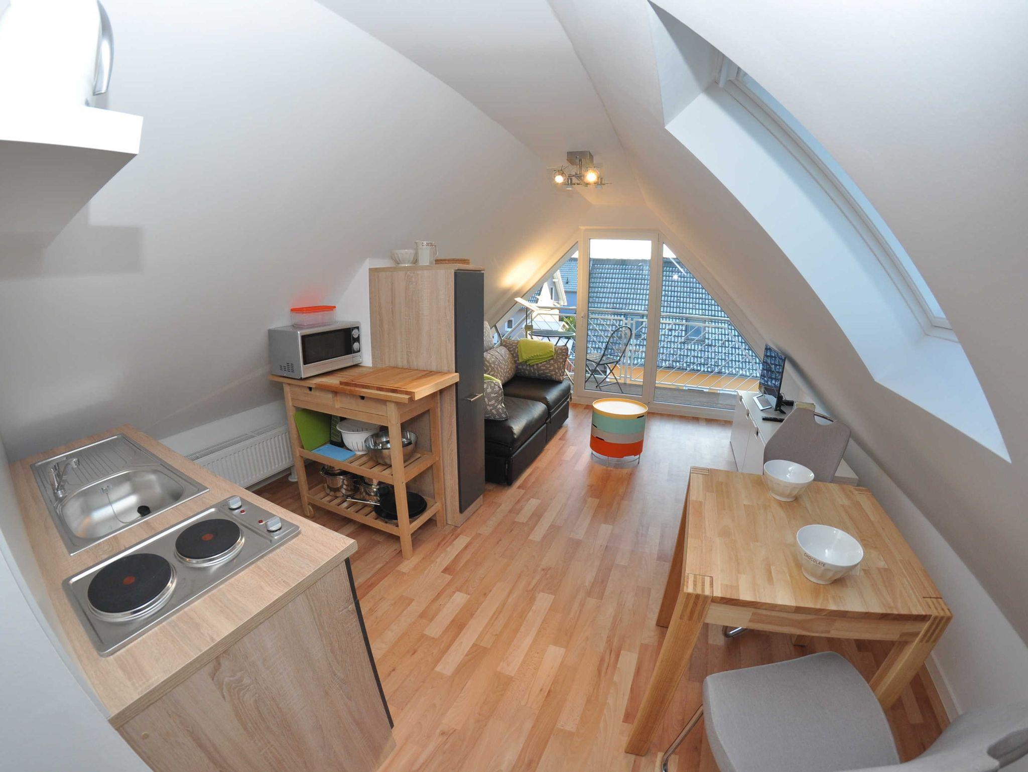 Das kleine 1 Zimmer Dachgeschoss - Appartement im Ferienhaus Müritzglück verfügt über 1 kombinierten Wohn- und Schlafraum, kleiner Essbereich mit Tisch und 2 Stühlen, kleines Wannenbad mit WC, TV, Pantryküche, möbilieten Balkon und guter Schlafcouch. Die rund 25 qm große Ferienwohnung kann mit bis zu 2 Personen belegt werden.