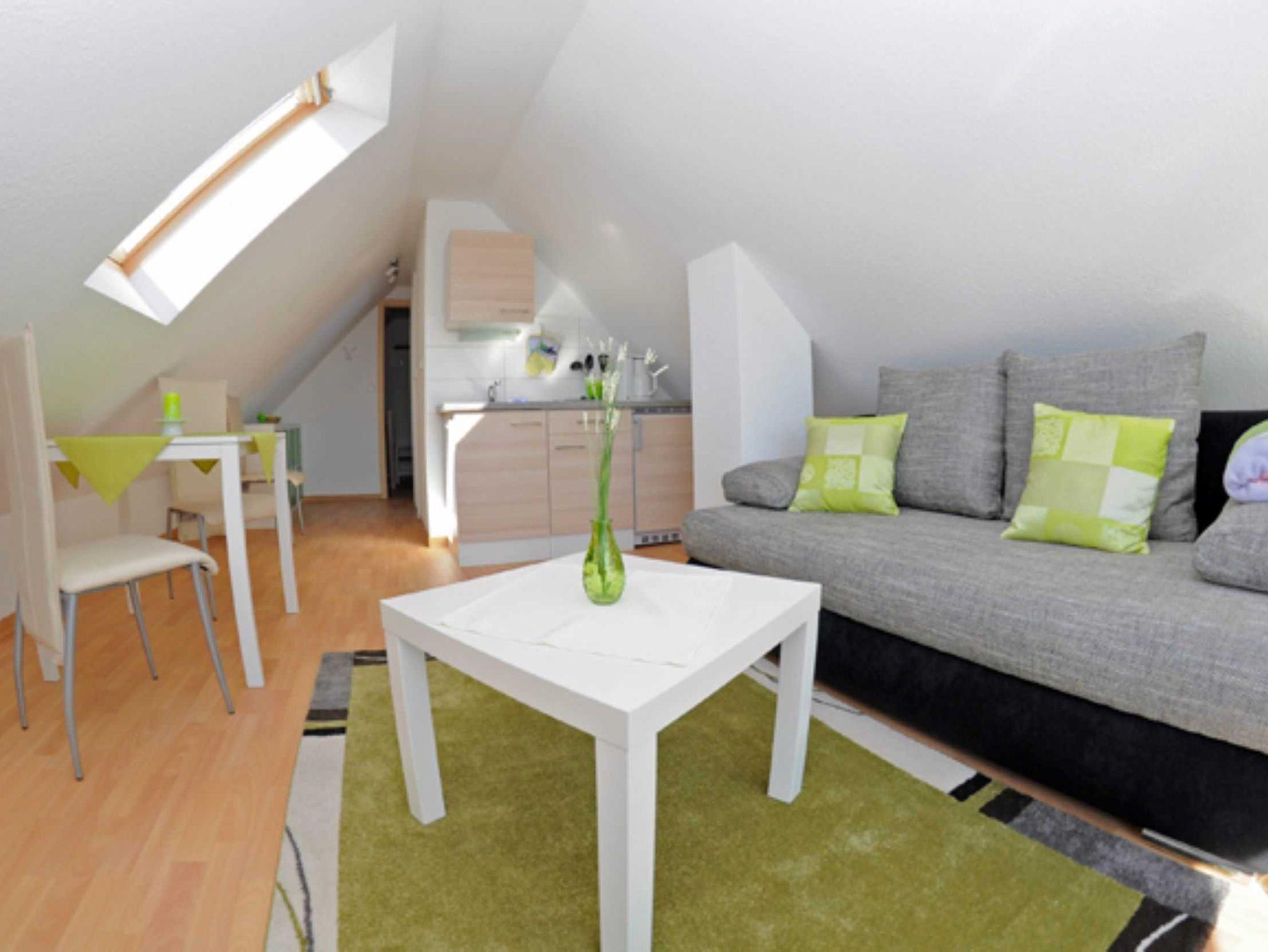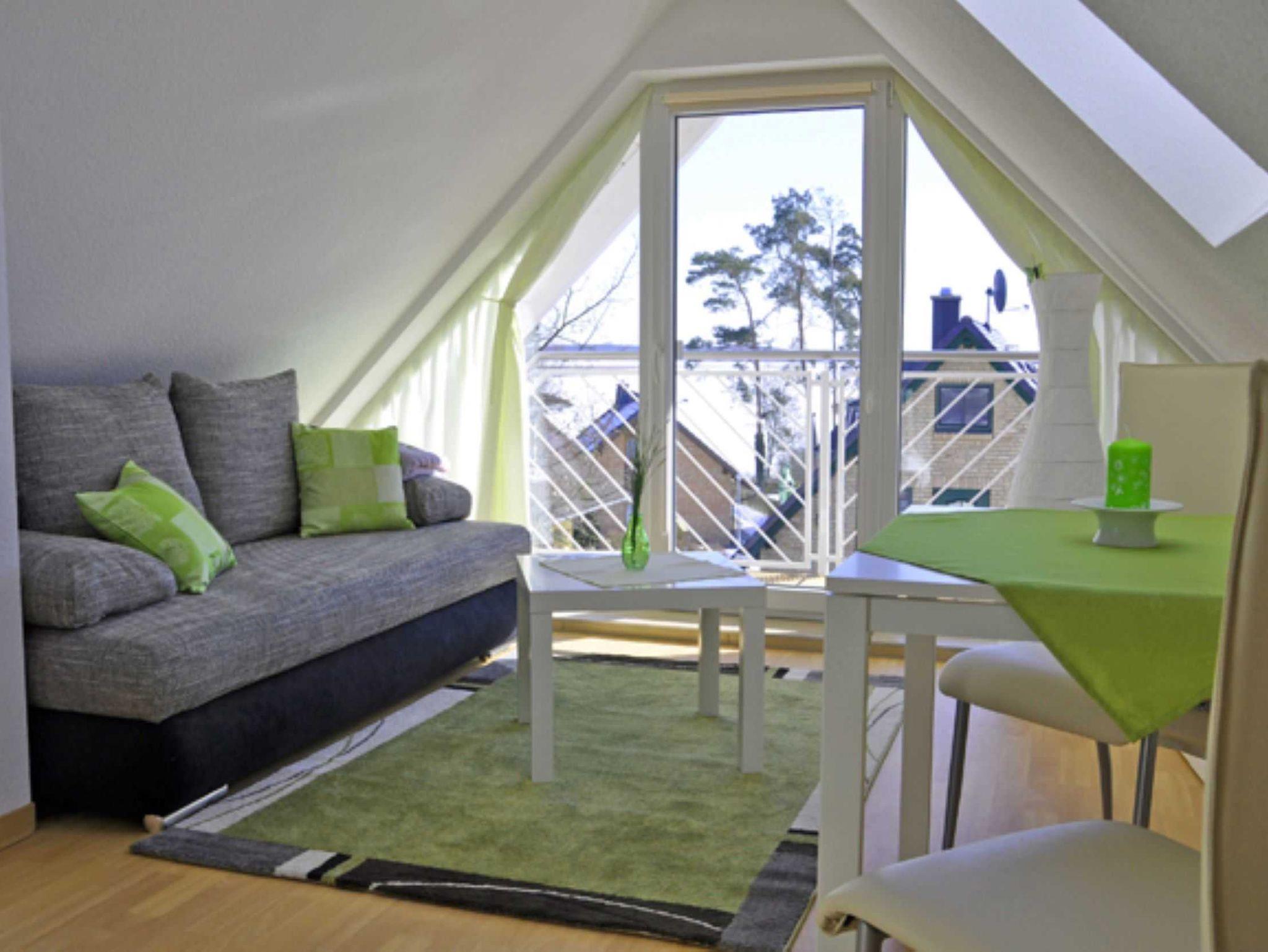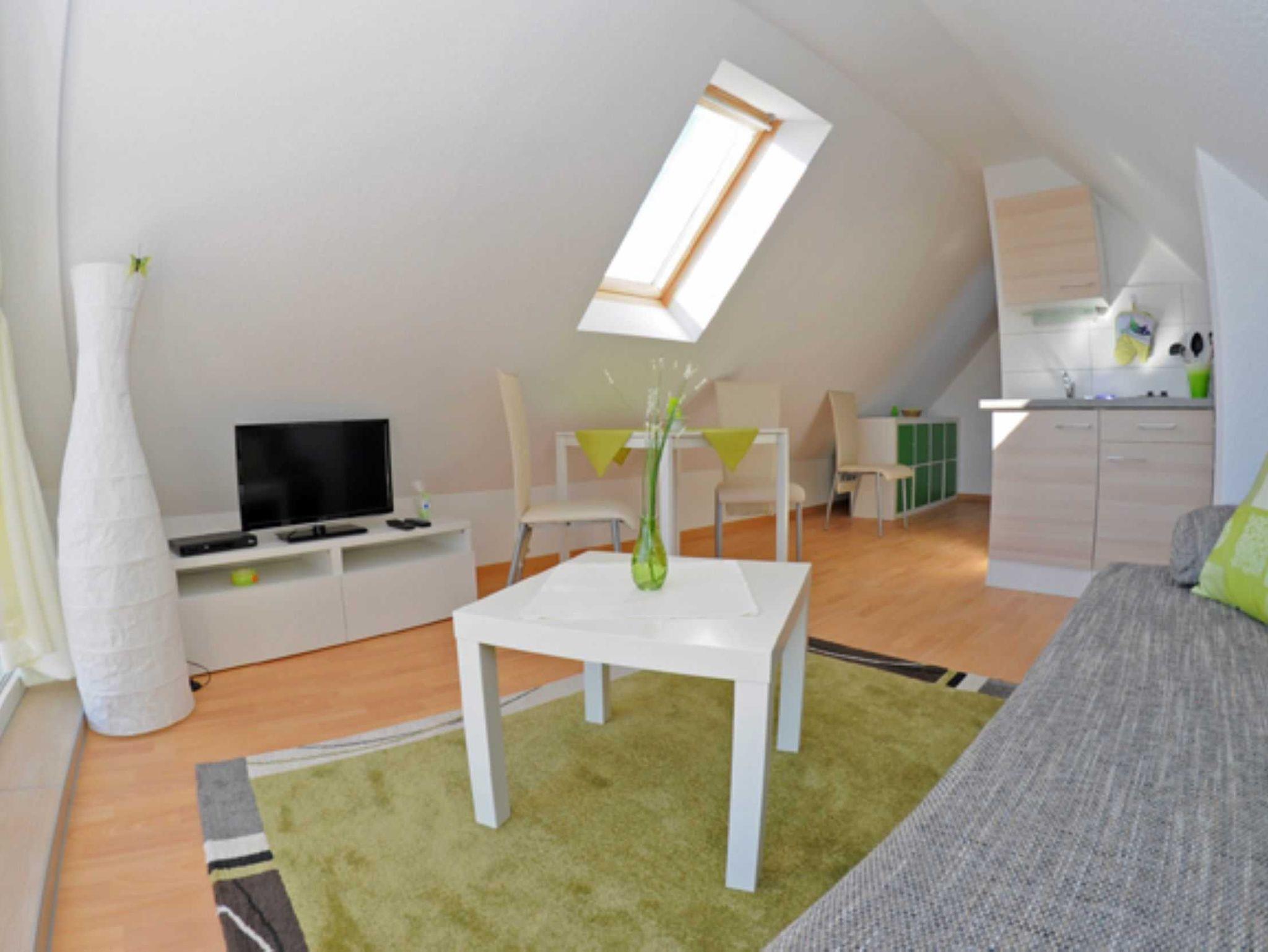 Das kleine 1 Zimmer Dachgeschoss - Appartement im Ferienhaus Müritzlust verfügt über 1 kombinierten Wohn- und Schlafraum, kleiner Essbereich mit Tisch und 2 Stühlen, kleines Wannenbad mit WC, TV, Pantryküche, möbilieten Balkon und guter Schlafcouch. Die rund 25 qm große Ferienwohnung kann mit bis zu 2 Personen belegt werden.