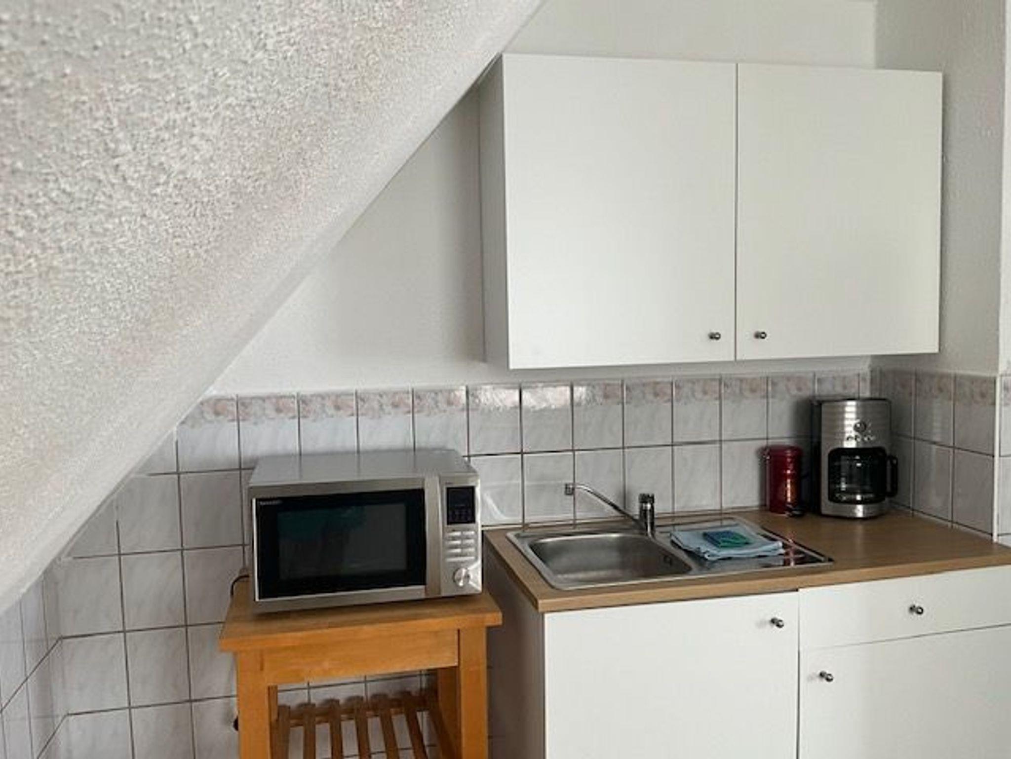 Ausstattung, Besonderheiten: Die Ferienwohnung ist vollständig ausgestattet und bietet alles, was Sie für einen angenehmen Aufenthalt benötigen. Die separate Küche verfügt über moderne Geräte wie Herd, Kühlschrank, Mikrowelle und Kaffeemaschine. Im kombinierten Wohn-/Schlafraum gibt es einen Fernseher, bequeme Sitzgelegenheiten und kostenloses WLAN. Das Doppelbett sorgt für erholsamen Schlaf, und das Badezimmer ist mit einer Dusche ausgestattet.