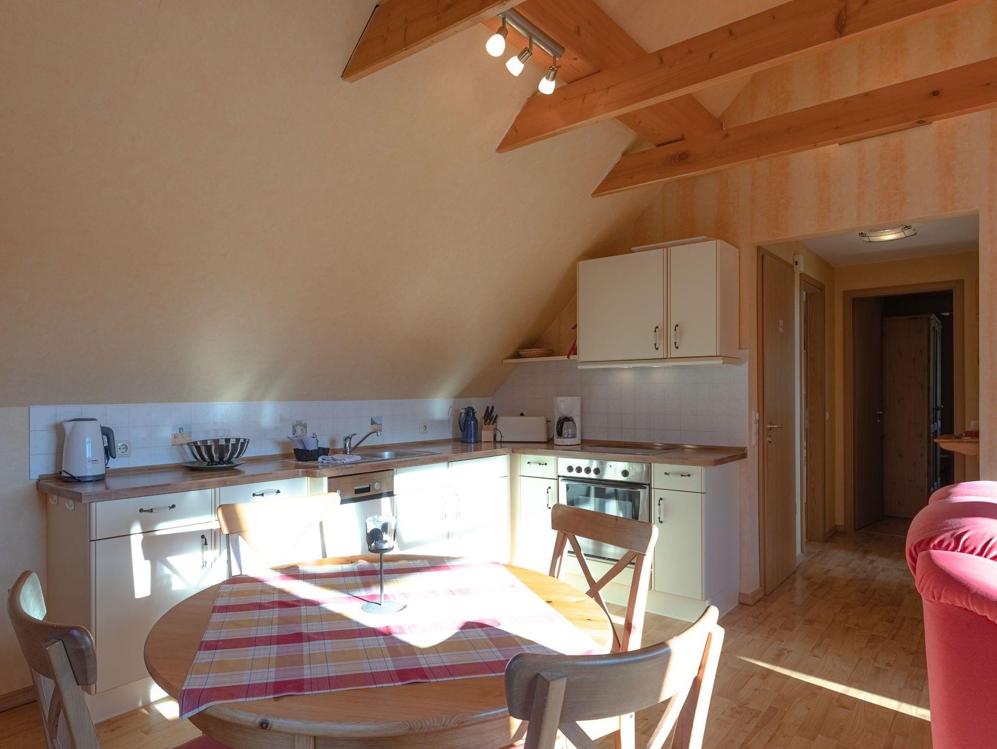 Die Wohnung hat zwei Schlafzimmer, eines mit Doppelbett, das andere mit zwei Einzelbetten. Der offene Wohnraum hat wie einer der Schlafräume durch die Studiobauweise eine Raumhöhe von drei Metern. Ein Fernseher mit SAT-Empfang, ein Radio mit CD-Spieler sowie Bücher, Spiele und Spielsachen stehen bereit. Alle Räume sind mit Laminat ausgelegt. Im Winter können Sie in der Müritz Ferienwohnung mit 2 Schlafzimmern die gemütliche Wärme einer Fußbodenheizung im Wohn- und Essbereich sowie im Bad genießen.