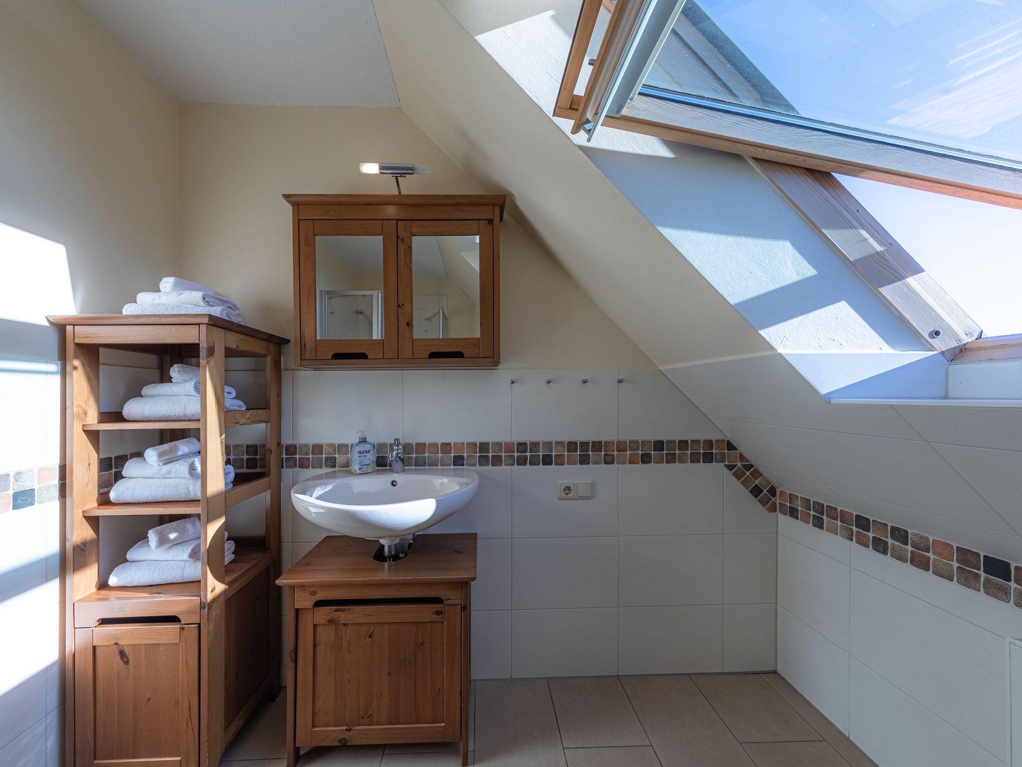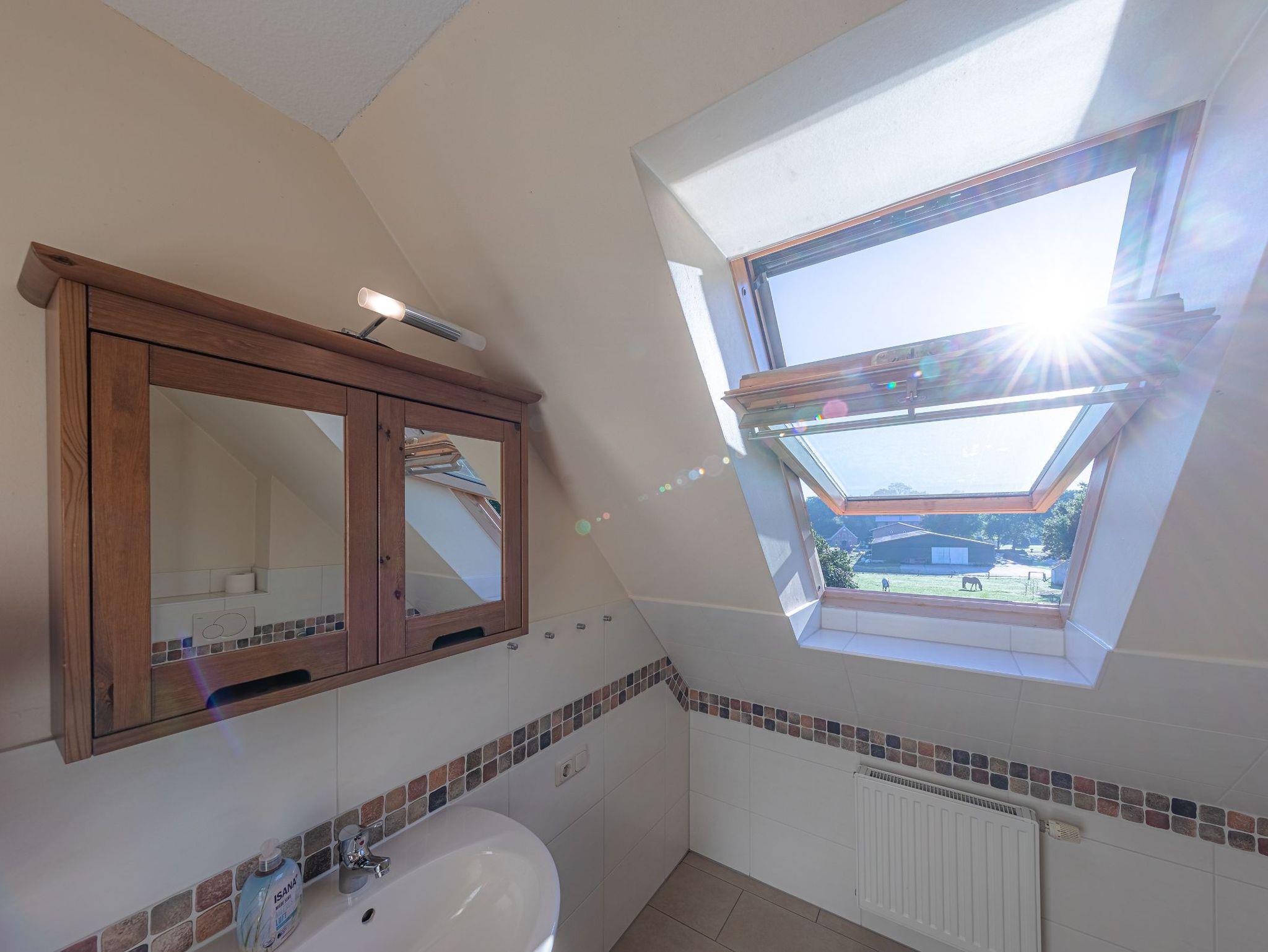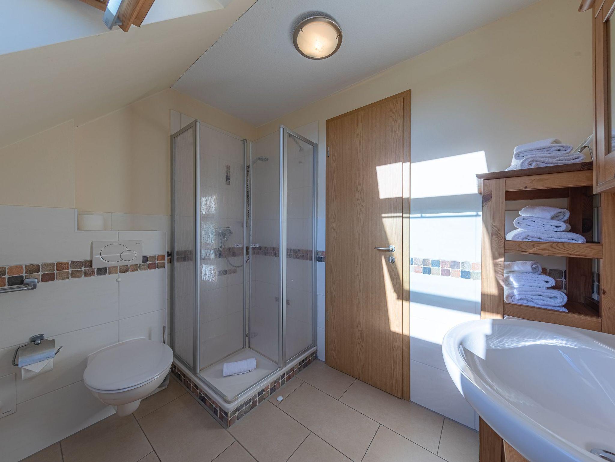 Das Bad ist mit einem WC und einer Dusche mit niedrigem Einstieg ausgestattet.