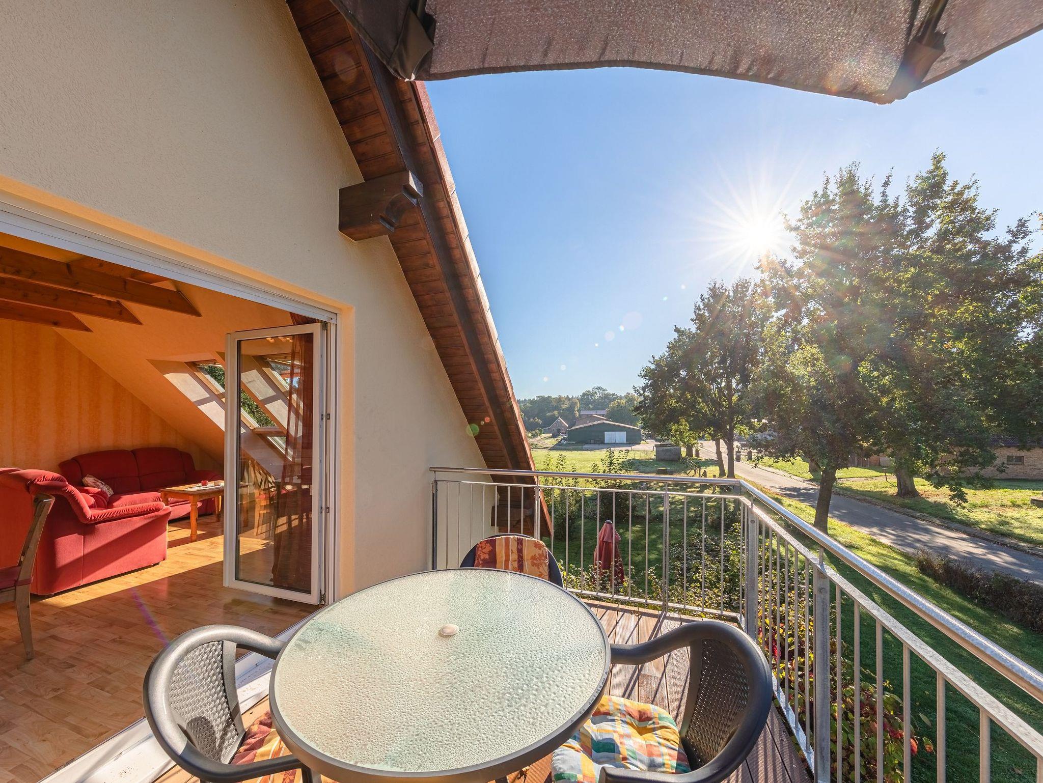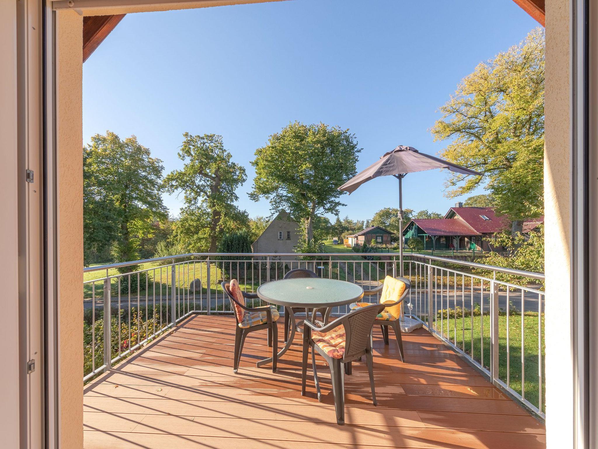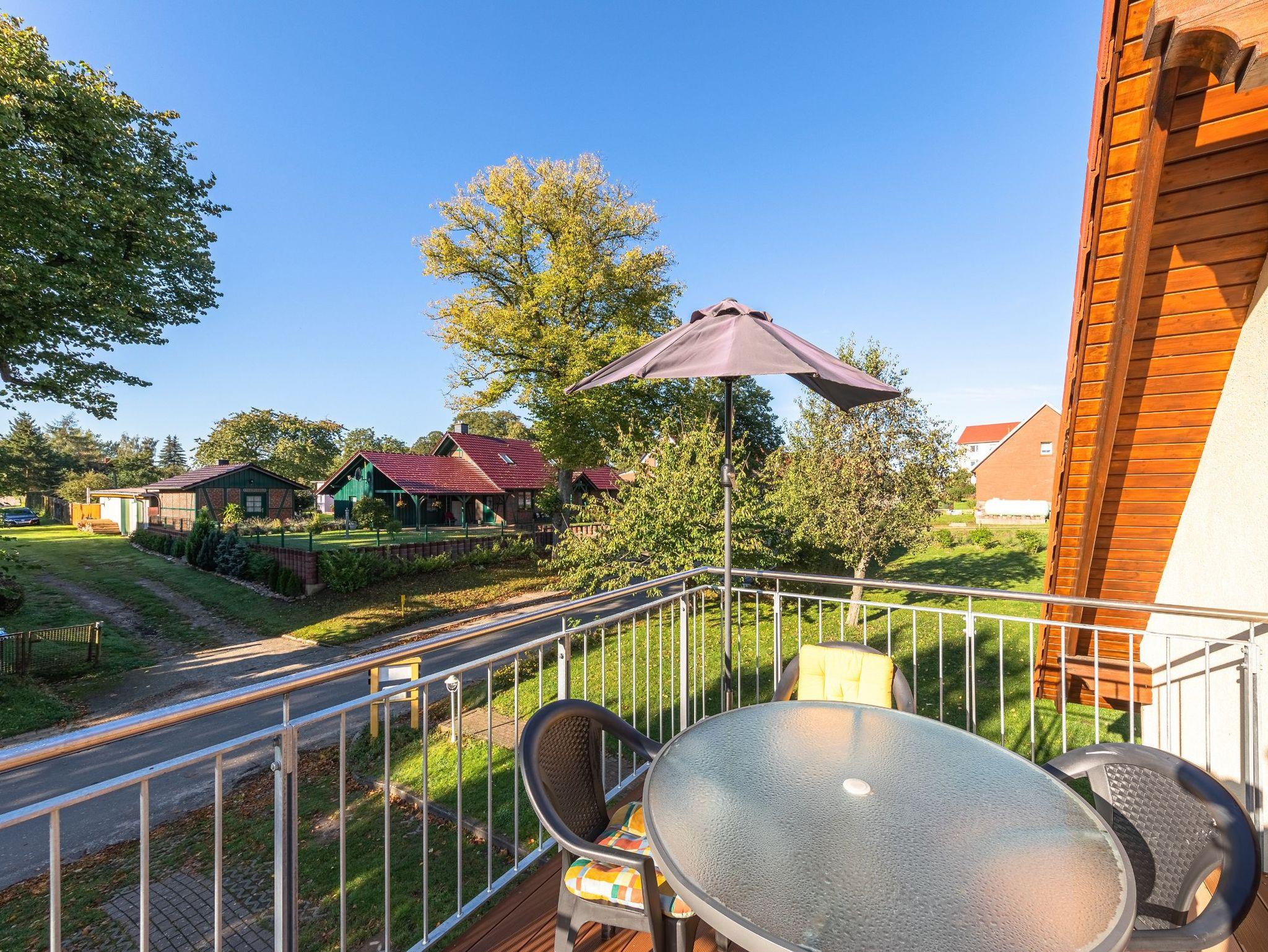 Zur Müritz Ferienwohnung mit zwei Schlafzimmern gehört ein großer Balkon mit Möbeln sowie einem Sonnenschirm. Es kann aber auch der gesamte Gartenbereich von Ihnen als Spiel- und Liegewiese genutzt werden.
