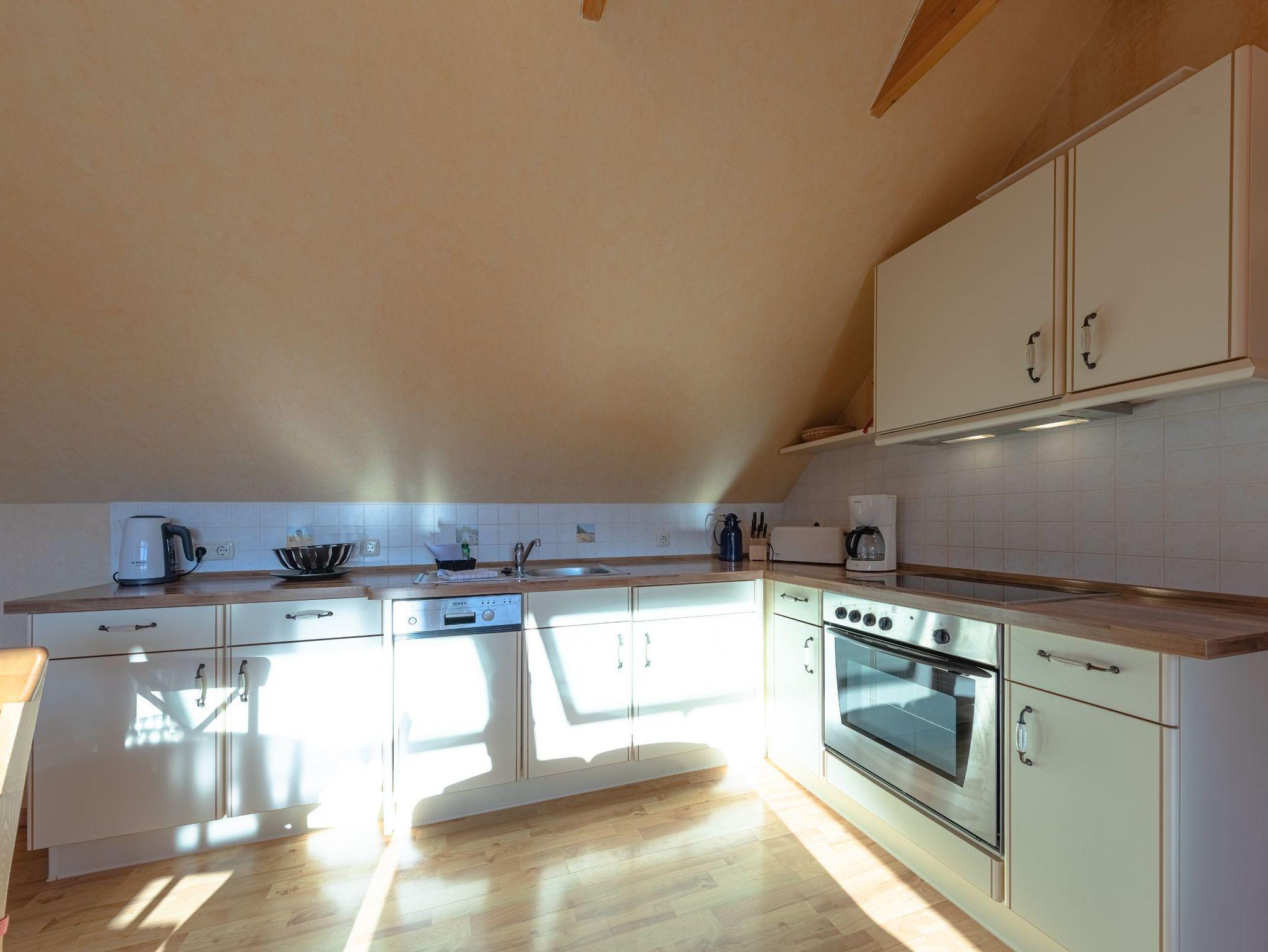 Die moderne Einbauküche ist mit Cerankochfeld, Backofen, Geschirrspüler sowie einem Kühlschrank mit Gefrierfach ausgestattet. Außerdem finden Sie alle notwendigen Küchengeräte wie Toaster, Kaffeemaschine und Wasserkocher. Geschirr und Besteck sind in ausreichender Anzahl vorhanden.
