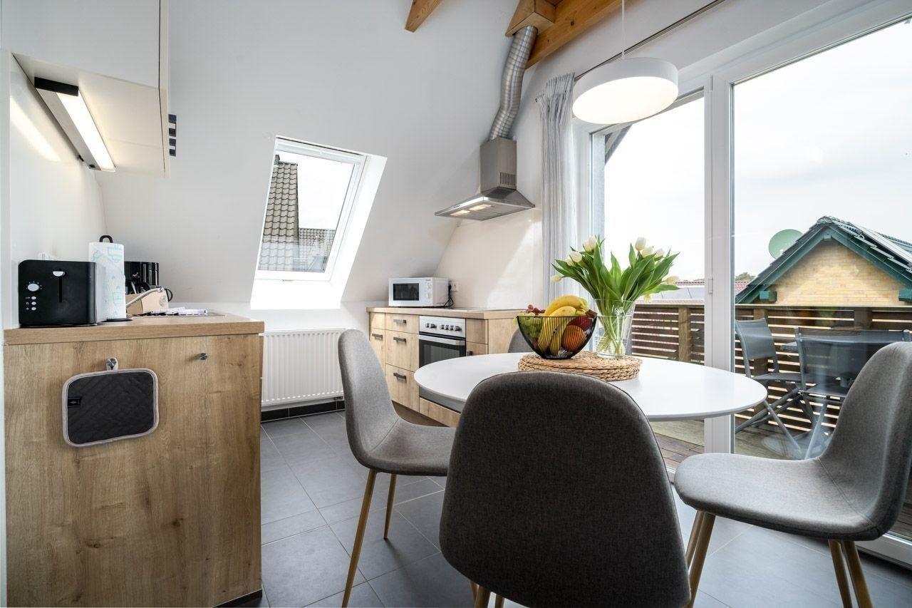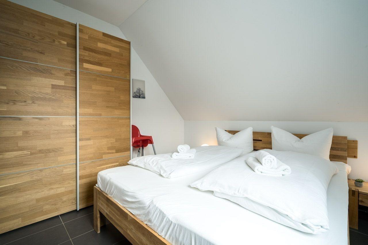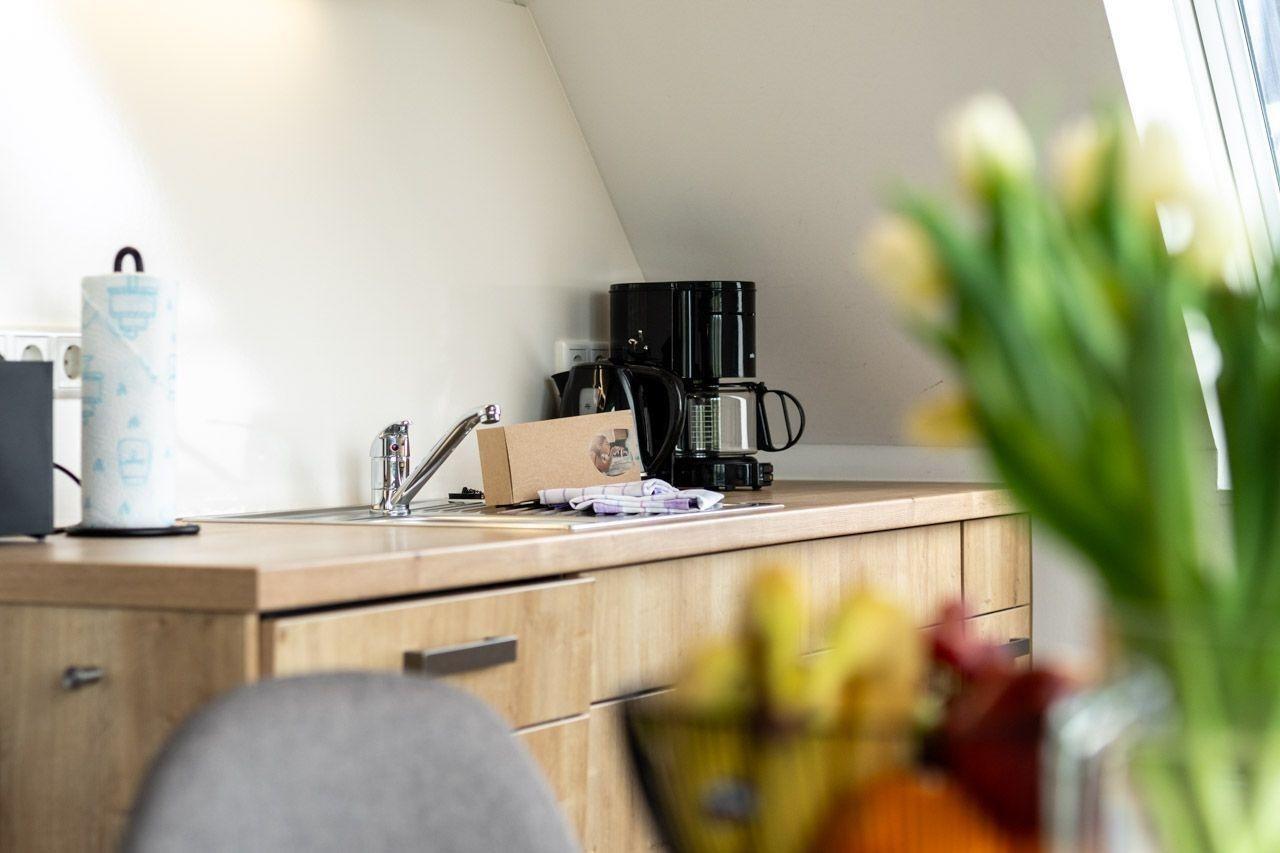 Die Ferienwohnung bietet eine moderne und allergikergeeignete Ausstattung, ideal für Erholung suchende Gäste. Sie verfügt über zwei Schlafzimmer, eines mit einem Doppelbett und eines mit zwei Einzelbetten, sowie ein Badezimmer mit bodengleicher Dusche und Fenster. Die offene Küche ist mit einem Geschirrspüler, einem Elektro- und Gasherd, einem Backofen, einer Mikrowelle und einem Kühlschrank ausgestattet, ergänzt durch eine Kaffeemaschine, einen Wasserkocher und einen Toaster. Ein Kinderhochstuhl steht ebenfalls zur Verfügung.