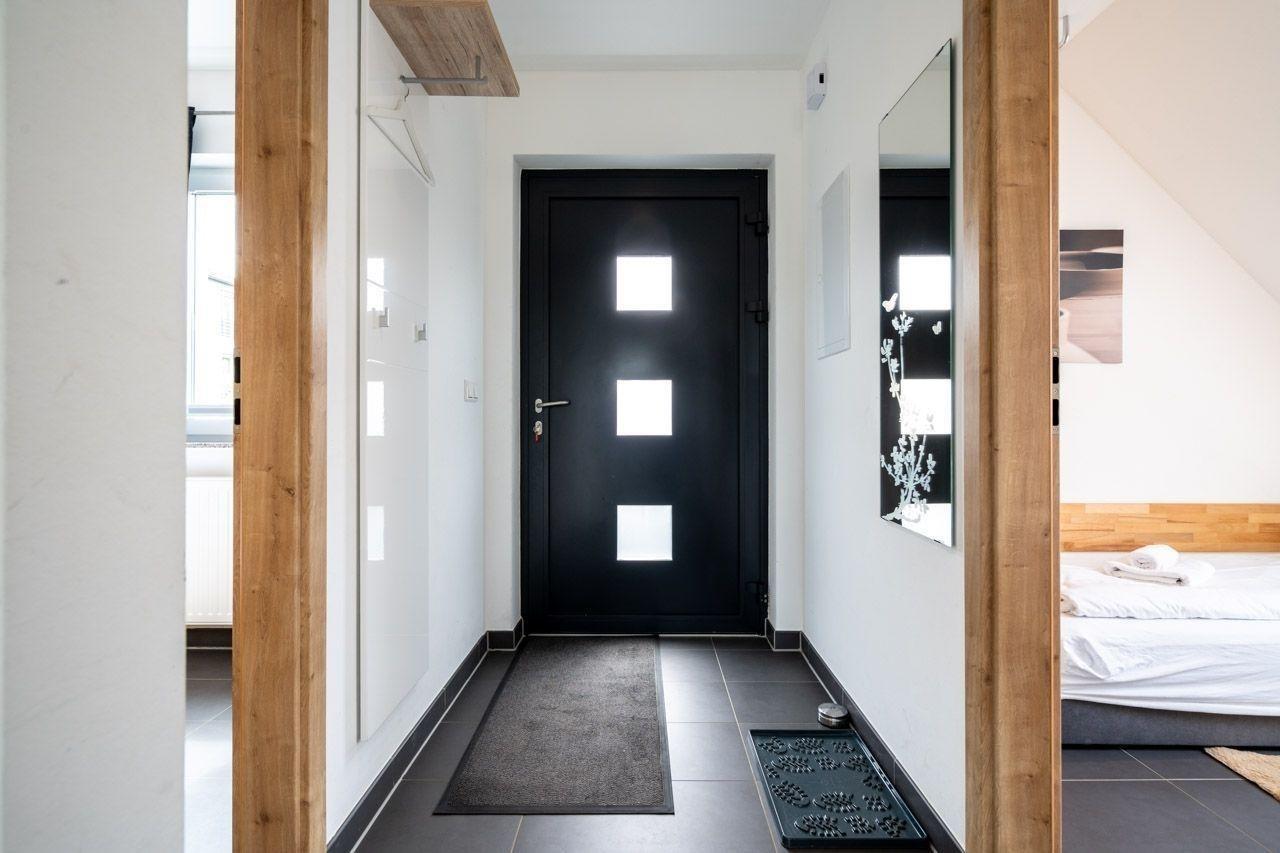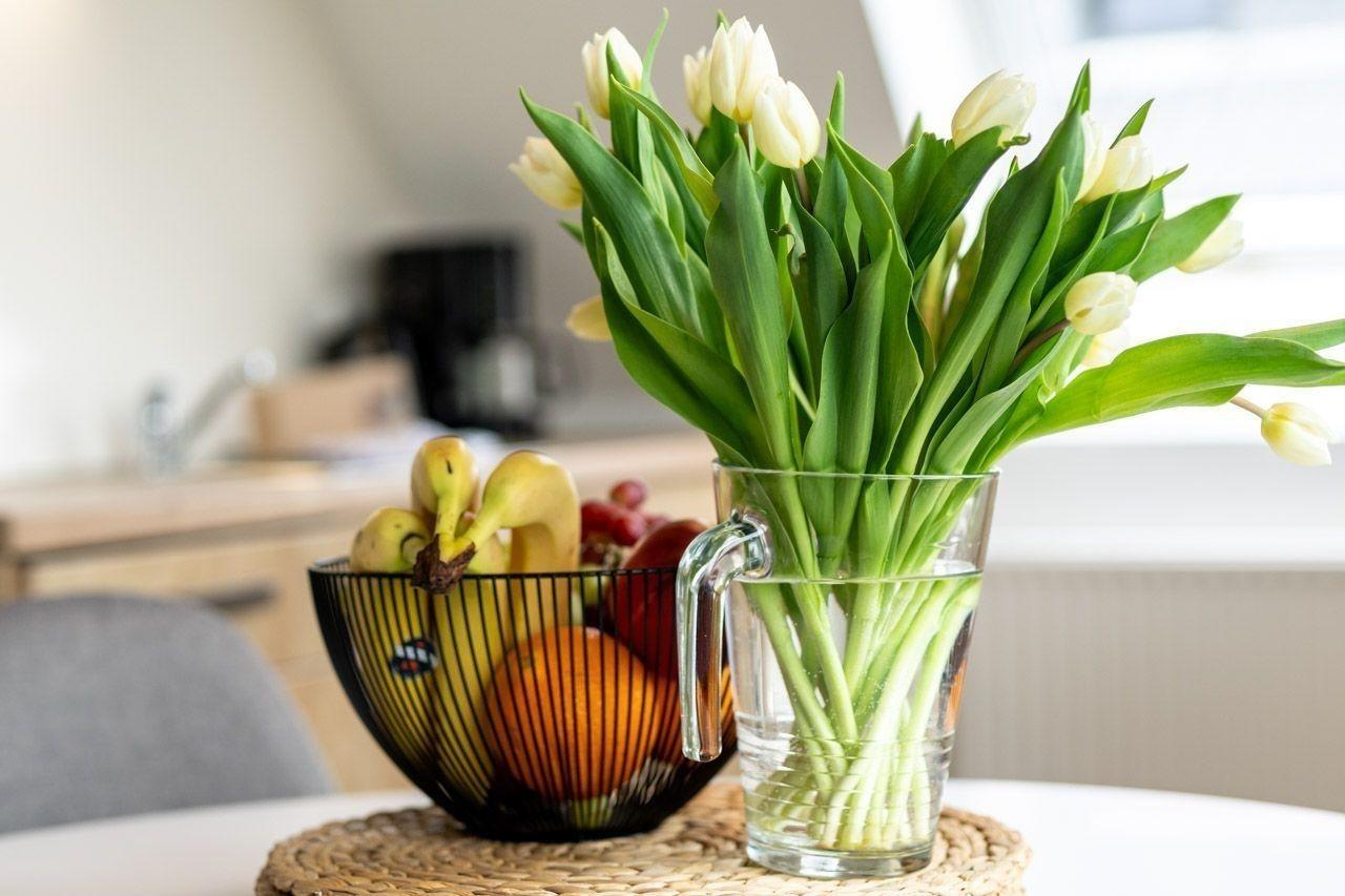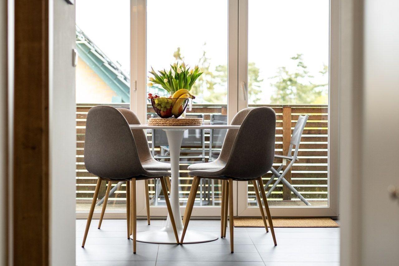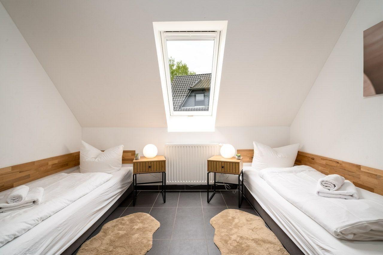 Die Ferienwohnung bietet eine moderne und allergikergeeignete Ausstattung, ideal für Erholung suchende Gäste. Sie verfügt über zwei Schlafzimmer, eines mit einem Doppelbett und eines mit zwei Einzelbetten, sowie ein Badezimmer mit bodengleicher Dusche und Fenster. Die offene Küche ist mit einem Geschirrspüler, einem Elektro- und Gasherd, einem Backofen, einer Mikrowelle und einem Kühlschrank ausgestattet, ergänzt durch eine Kaffeemaschine, einen Wasserkocher und einen Toaster. Ein Kinderhochstuhl steht ebenfalls zur Verfügung.