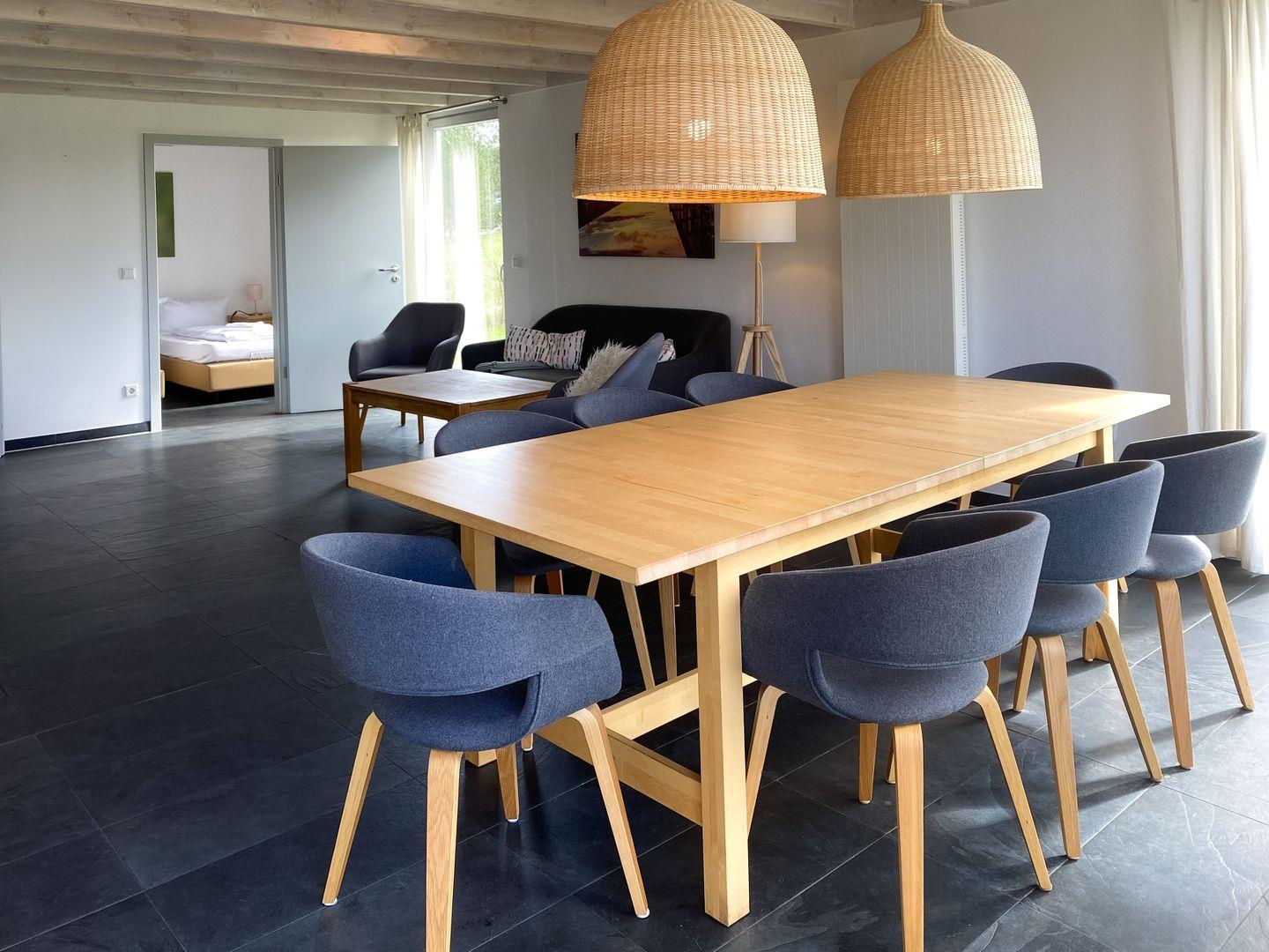 Im Erdgeschoss bildet der Wohn- und Essbereich mit Kamin und offener Küche das Zentrum des Ferienhauses. Im Obergeschoss befindet sich die Innensauna für Ihr privates SPA Erlebnis.