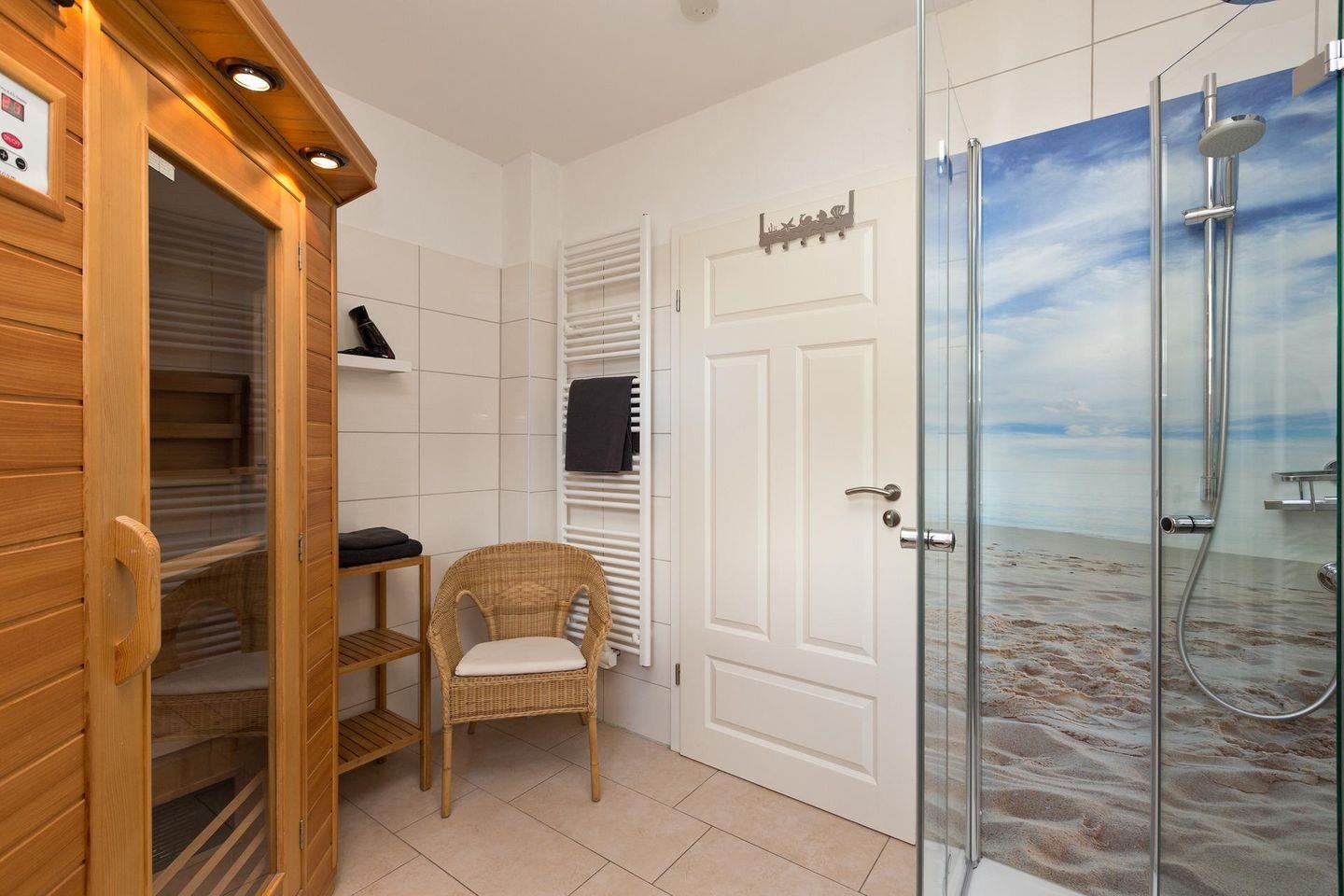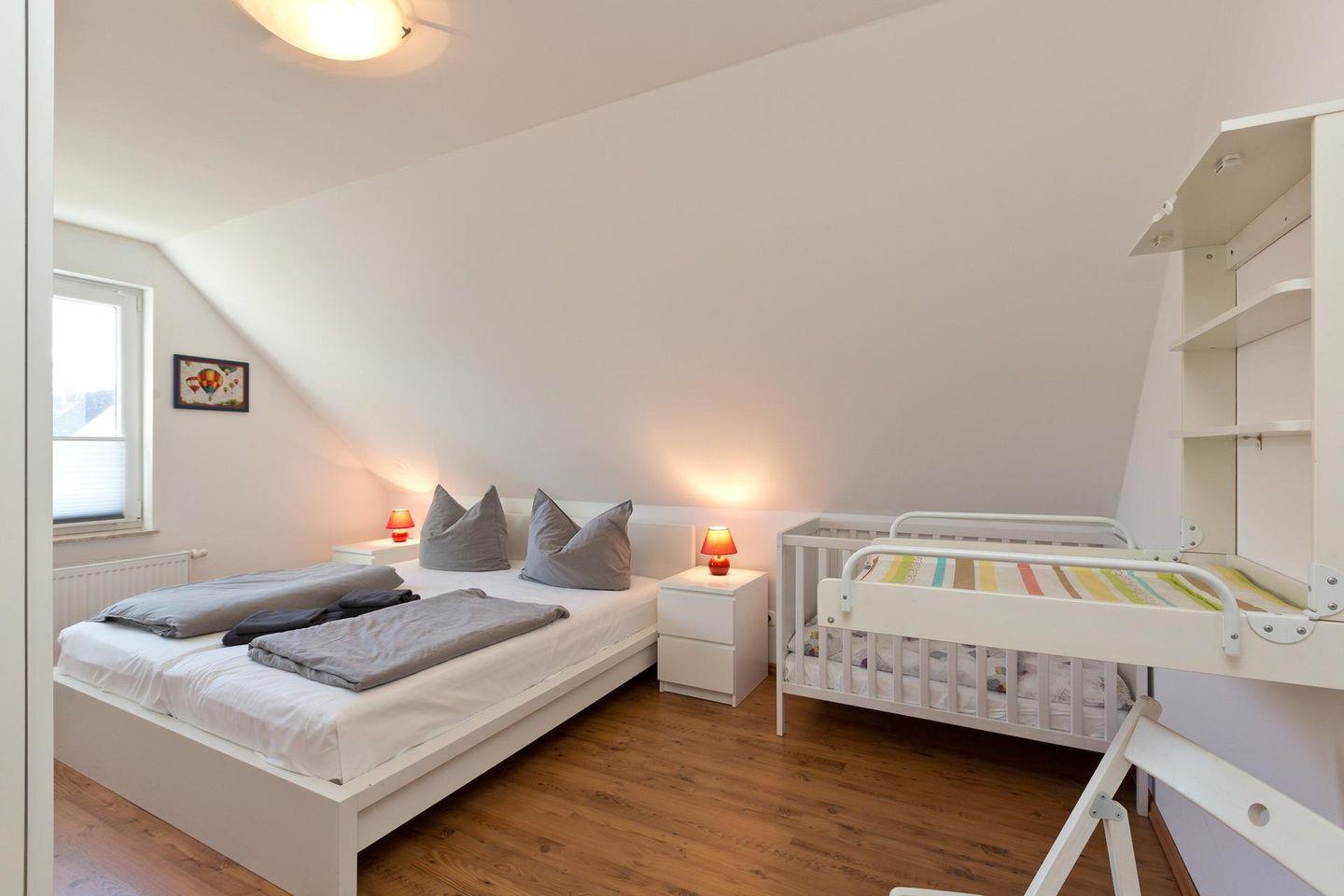 Im Obergeschoss des Ferienhaus Kiebitz ist ein zweites Bad mit Whirlpool, zwei weitere Schlafzimmer und ein Wohn-/Schlafzimmer. Eins davon ist als Elternschlafzimmer eingerichtet, mit Kinderbett und Wickelkommode. Sollte noch ein 2. Baby anreisen, kann ein Kinderreisebett von uns zusätzlich aufgestellt werden.