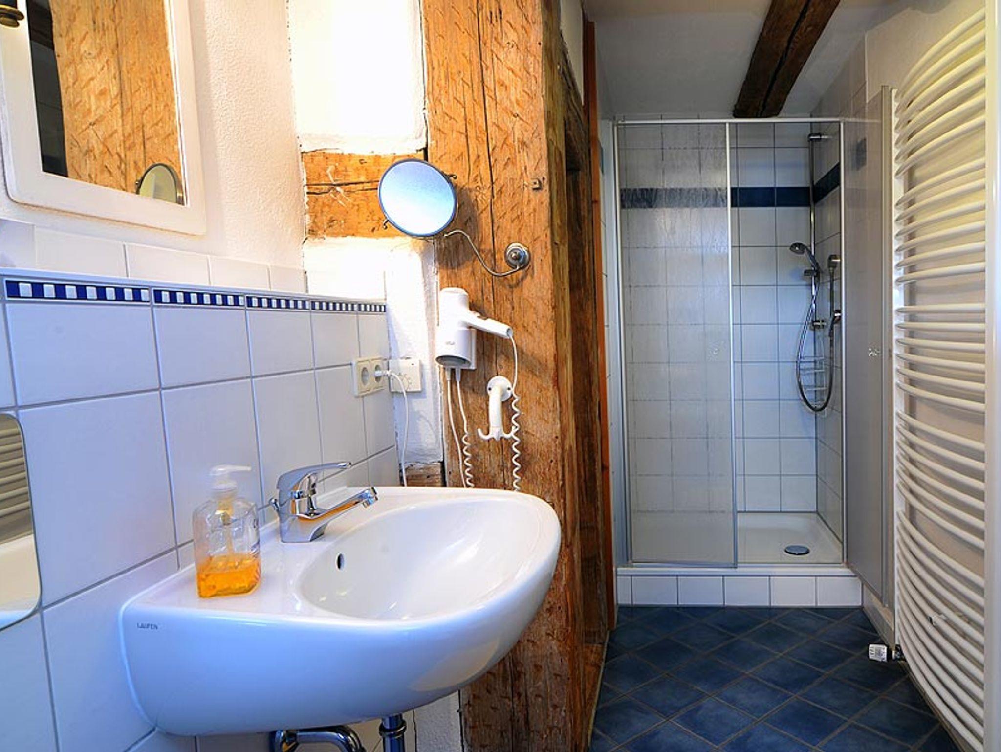 Ein Schlafzimmer mit zwei Einzelbetten, ein Schlafzimmer mit Doppelbett, dies ist auch Durchgangszimmer zum Badezimmer, das mit Dusche, WC und Fön ausgestattet ist.