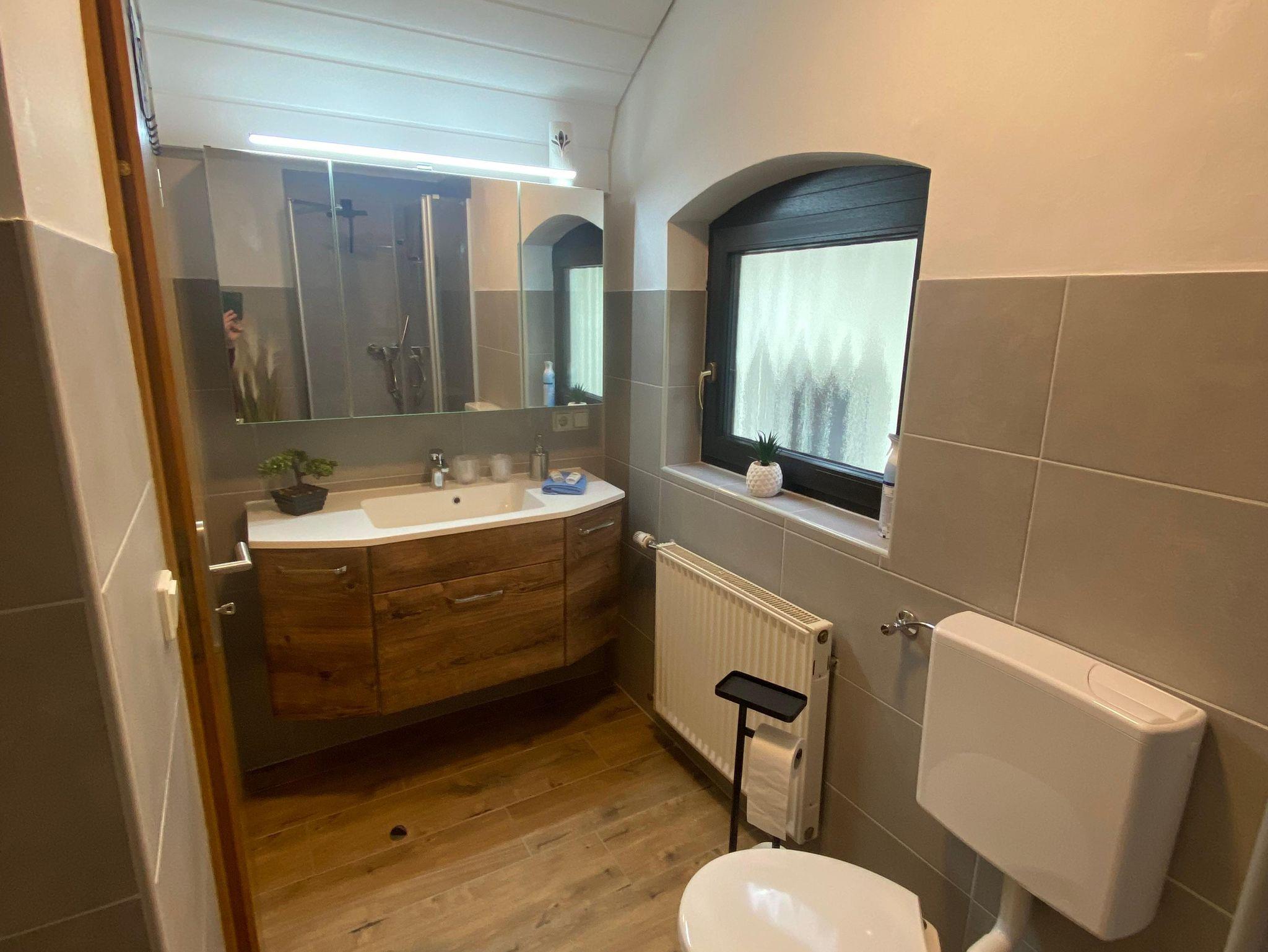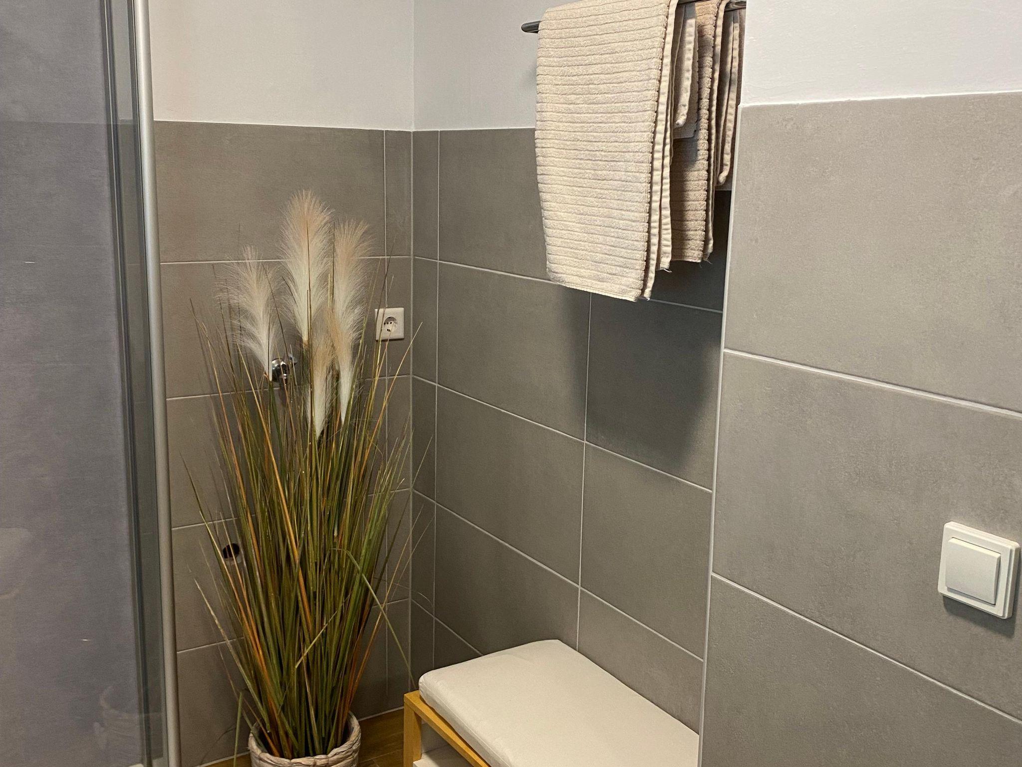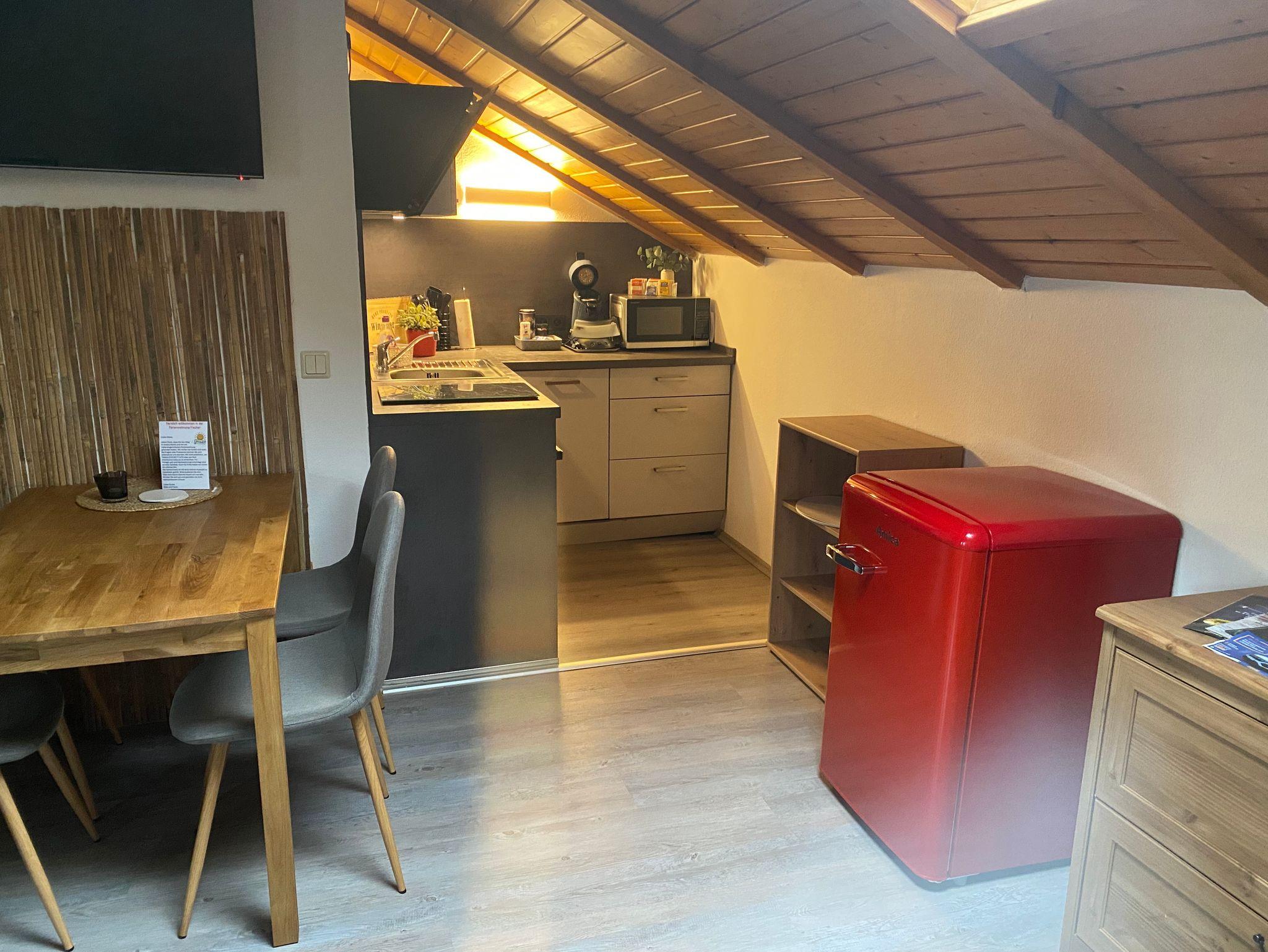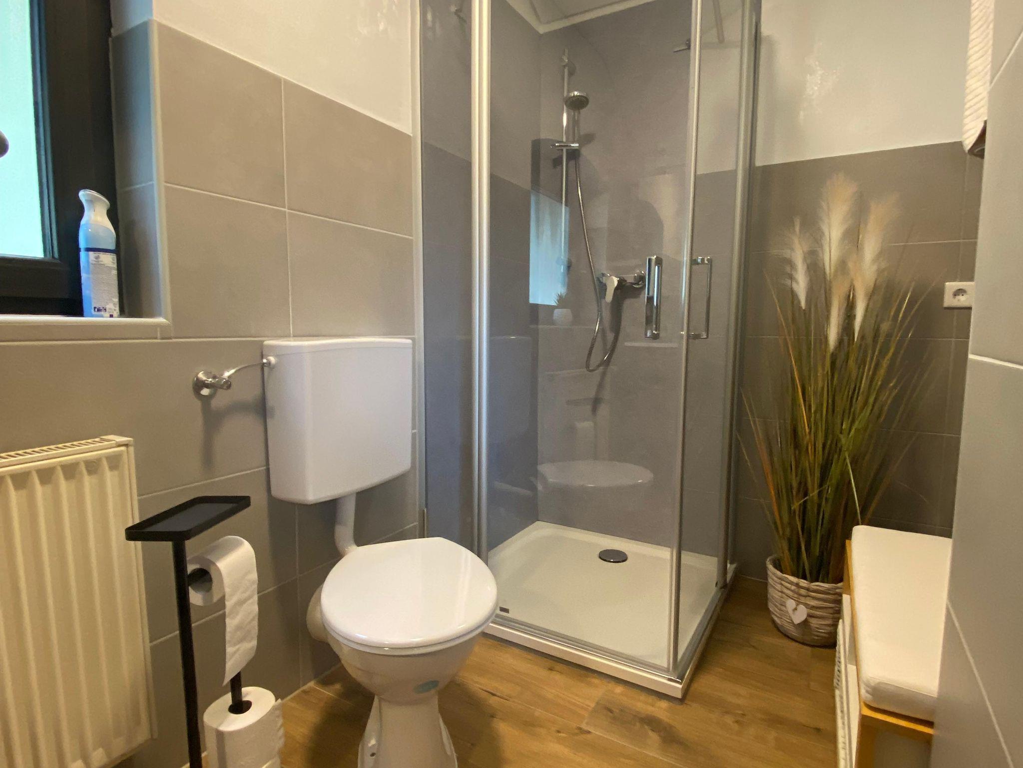 Die Ferienwohnung befindet sich im ersten Stock und bietet auf 50 Quadratmetern Platz für bis zu 3 Personen. Das Wohnzimmer ist nicht nur einladend, sondern verfügt auch über eine bequeme Schlafcouch, die als Schlafplatz für die dritte Person dient und zu gemütlichen Abenden einlädt. Die Küchenzeile ist mit Mikrowelle, Toaster, Geschirrspüler, Herd, Kochfeld, Kaffeepadmaschine sowie Kühlschrank voll ausgestattet. Das Tageslichtbad verfügt über Dusche, WC sowie Waschbecken mit Spiegelschrank. Shampoo und Duschgel sind vorhanden. Bettwäsche, Handtücher, WLAN und Parkplatz sind ebenfalls im Preis enthalten. Haustiere sind bei uns willkommen. Es handelt es sich um eine Nichtraucherwohnung. Für Raucher gibt es vor dem Eingang einen überdachten Freisitz.
