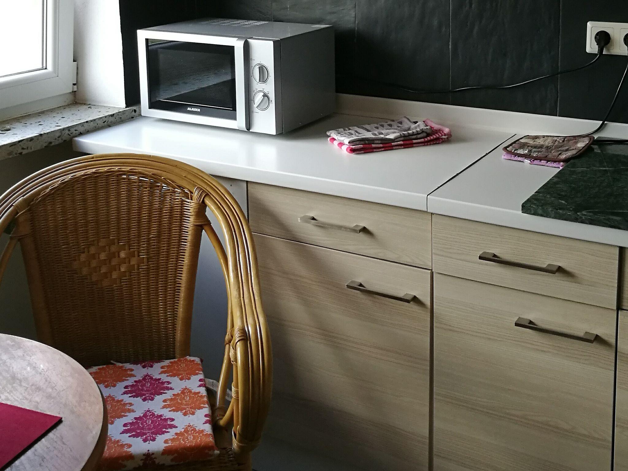Die große Küche mit Essgelegenheit liegt separat. Diese ist modern und komplett ausgestattet (E-Herd, Backofen, Wasserkocher, Kaffeemaschine, Kühlschrank, Mikrowelle Geschirr, Besteck und viele weitere Küchenutensilien). Das Wohnzimmer ist mit einem Sofa, einem SAT-TV und einem Esstisch ausgestattet. Bitte beachten Sie, dass der TV (Senderliste) nicht verstellt werden darf!